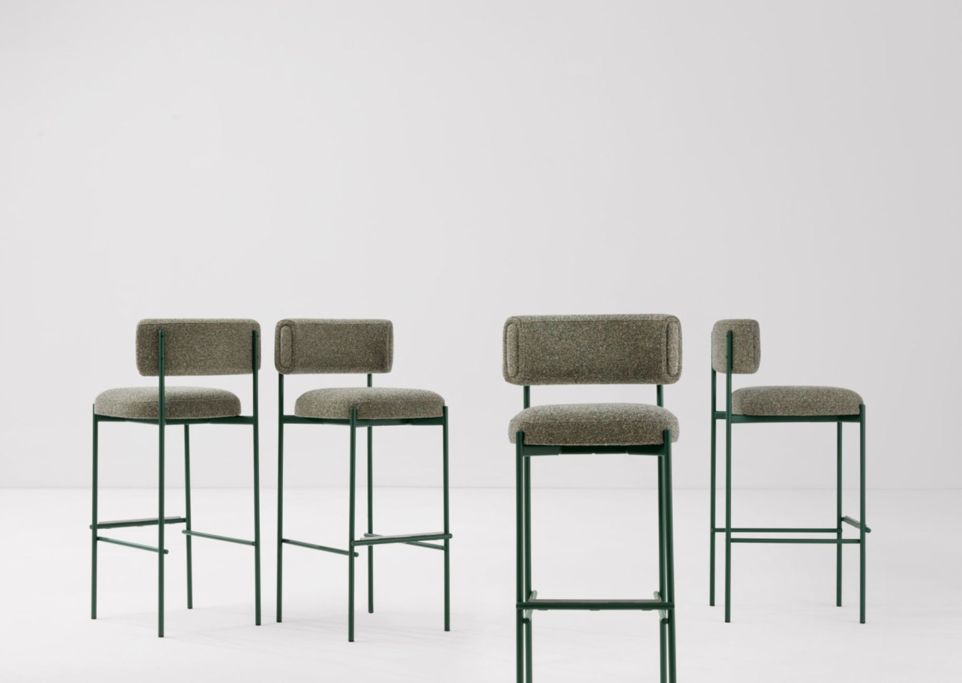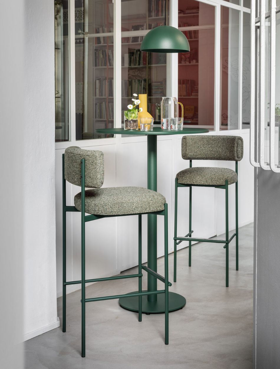 Amelie stool is made with a four-legged metal base. Backrest and seat upholstered in leather, faux leather, or fabric.