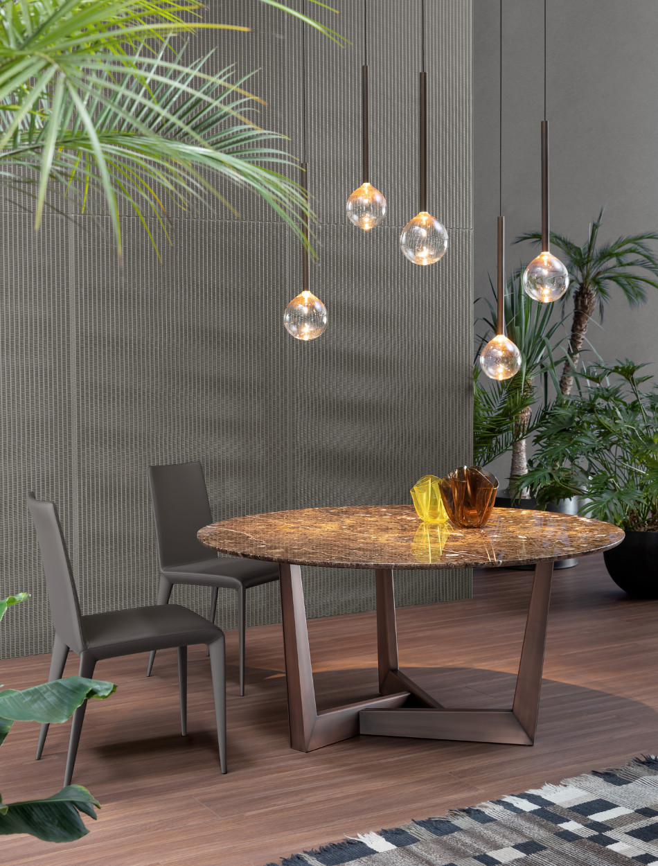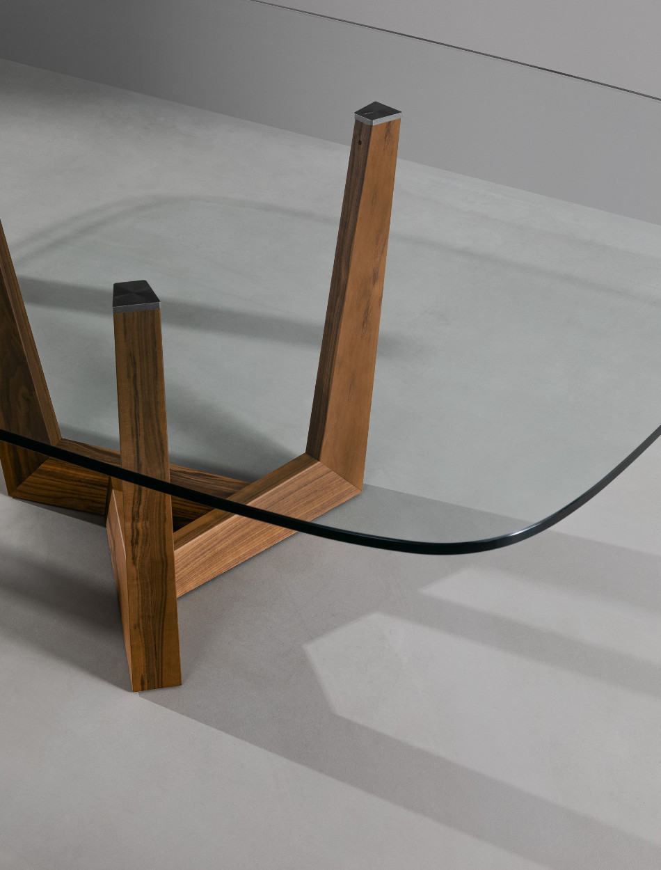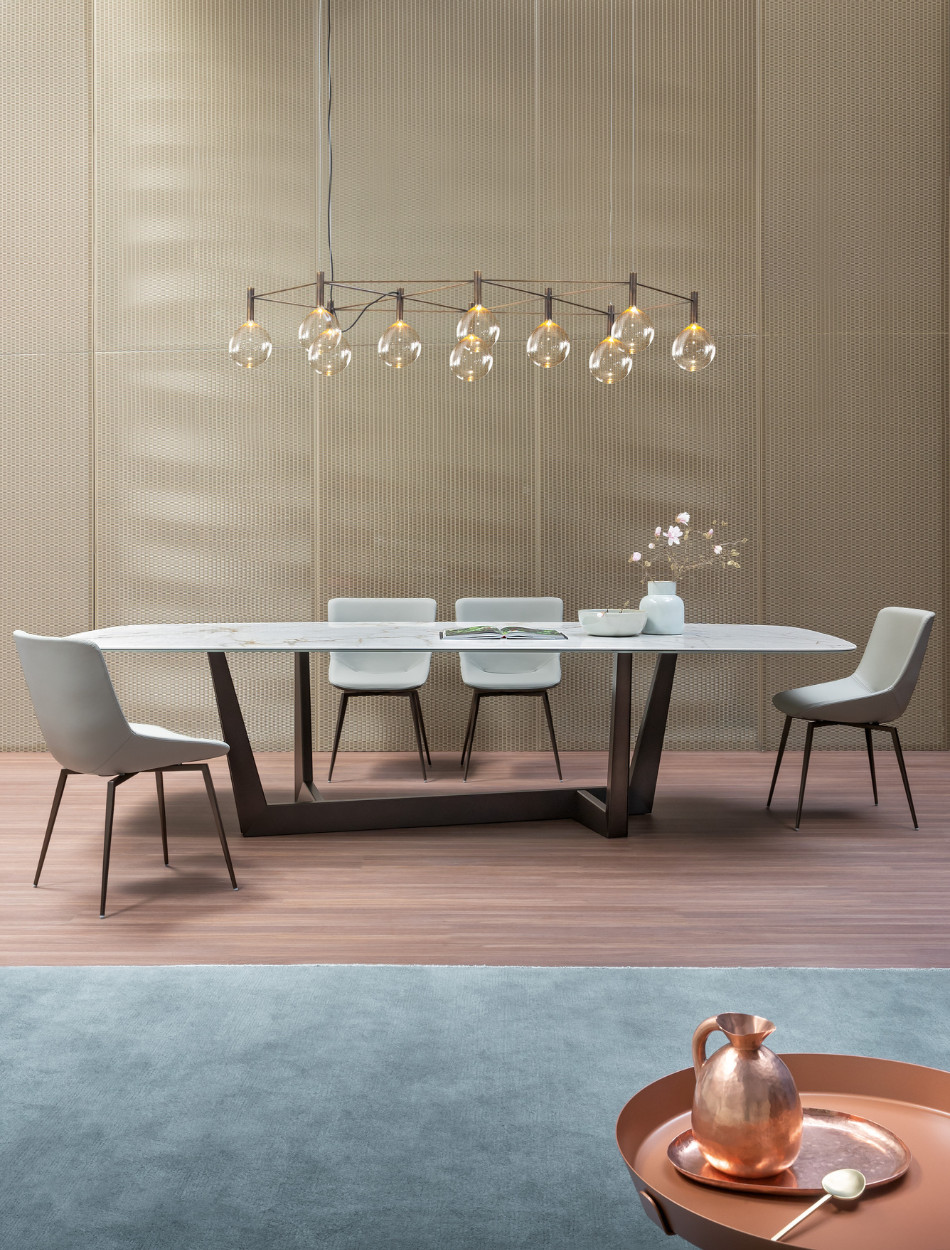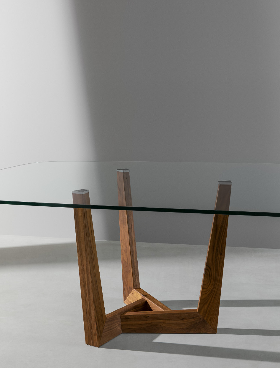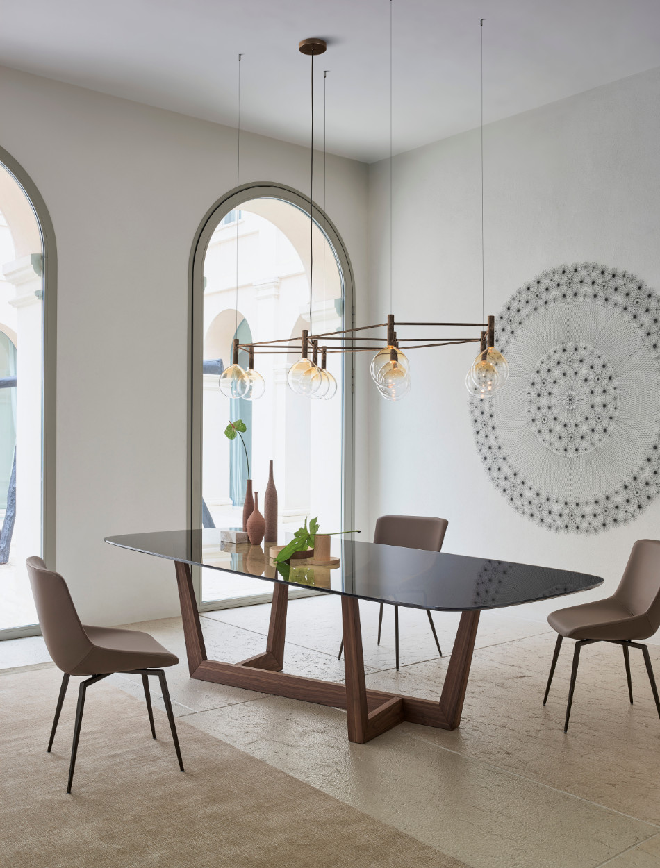 The base of the Art table is its most distinguishing feature: it is made of a metal trapezium that runs diagonally under the table top, allowing minimum obstruction and optimising the space. Overall, the load-bearing structure designed in this way stands out for its high levels of dynamism, solidity and sculptural impact. The top is firmly supported but the final effect is one of great lightness. The base of Art, a modern extendable table, is in painted metal of various colours; the table top in the fixed (rectangular, round or rectangular with rounded corners) or leaf version is available in different materials: this versatility makes it equally suitable for dining room or study. The Art table takes on new life in its version with a wooden base (“Art Wood”).