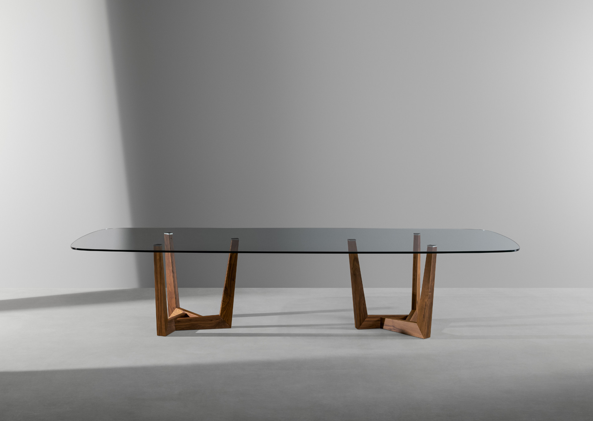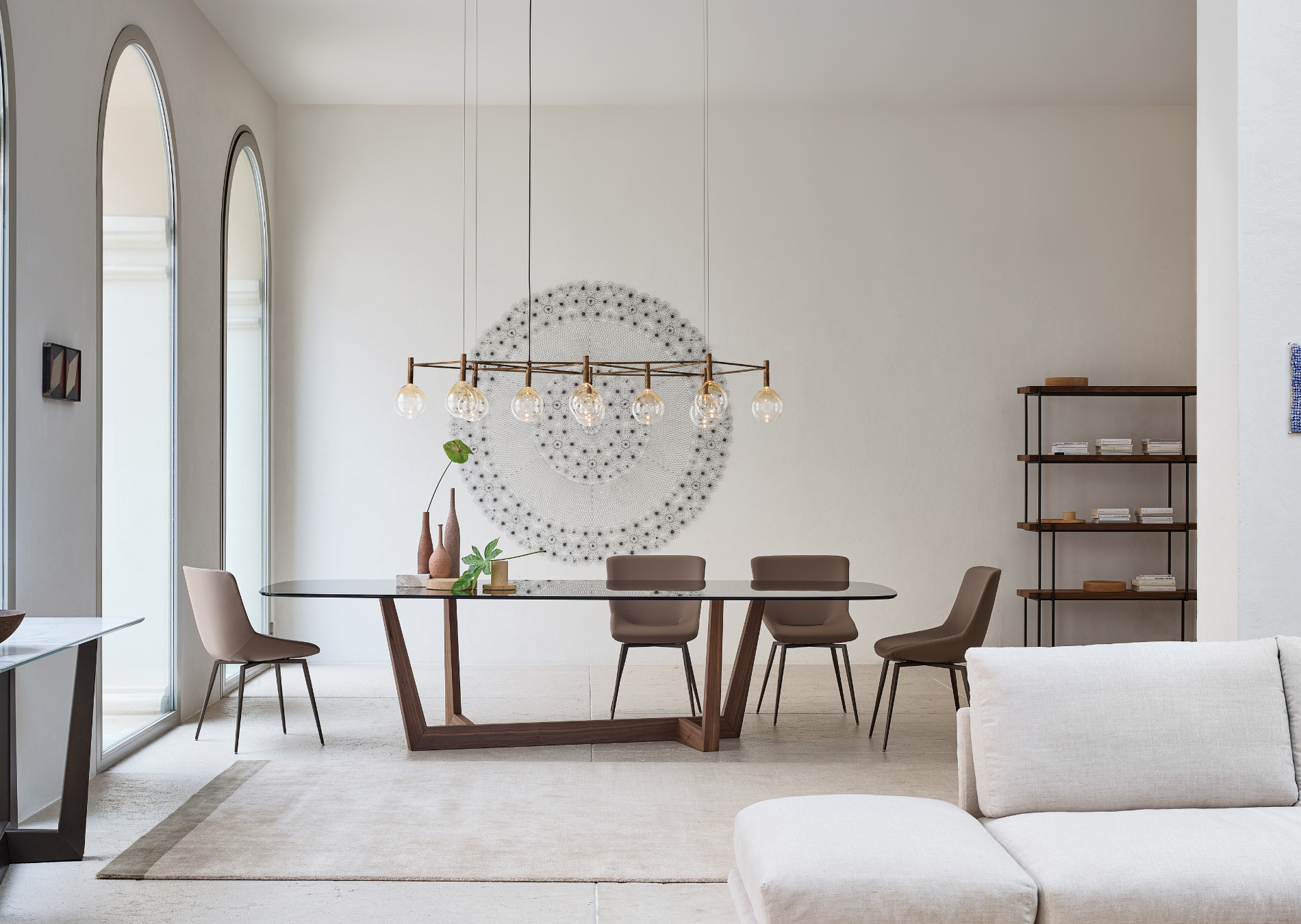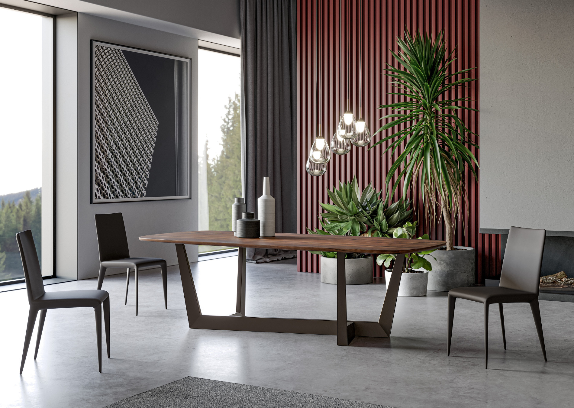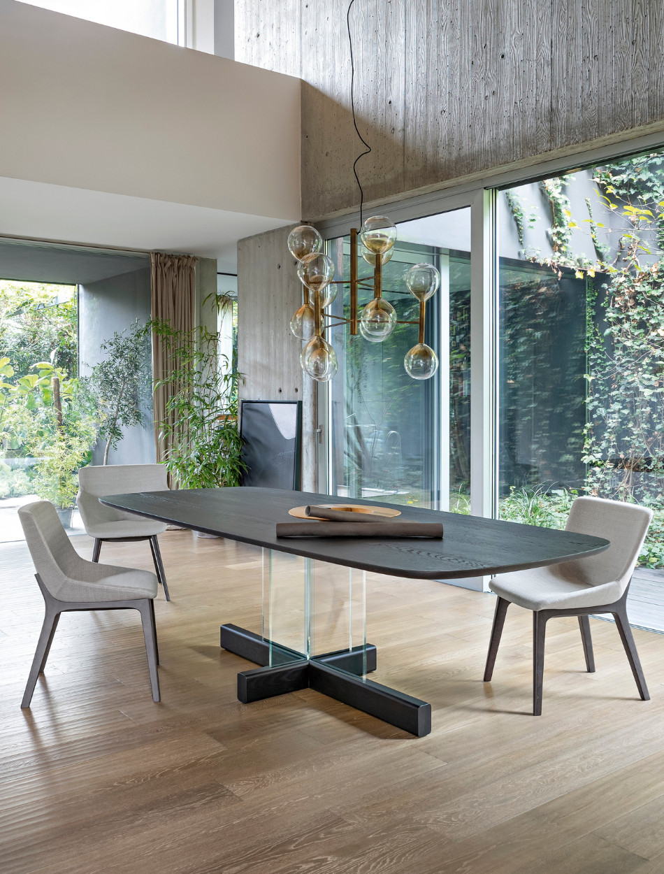 The base of the Art table is its most distinguishing feature: it is made of a metal trapezium that runs diagonally under the table top, allowing minimum obstruction and optimising the space. Overall, the load-bearing structure designed in this way stands out for its high levels of dynamism, solidity and sculptural impact. The top is firmly supported but the final effect is one of great lightness. The base of Art, a modern extendable table, is in painted metal of various colours; the table top in the fixed (rectangular, round or rectangular with rounded corners) or leaf version is available in different materials: this versatility makes it equally suitable for dining room or study. The Art table takes on new life in its version with a wooden base (“Art Wood”).