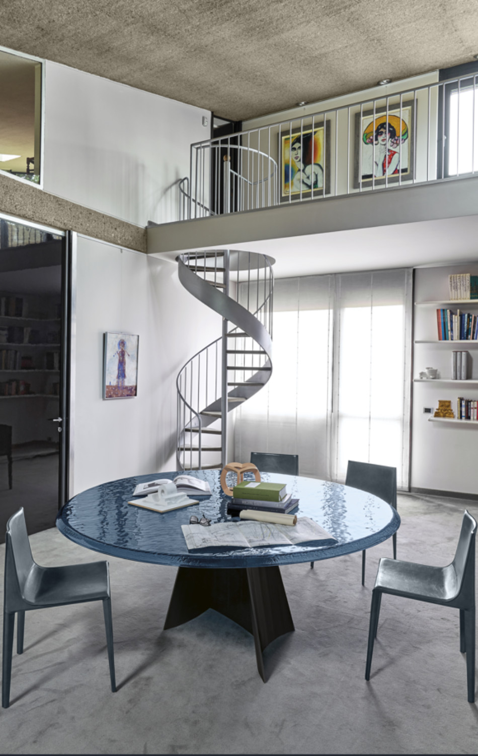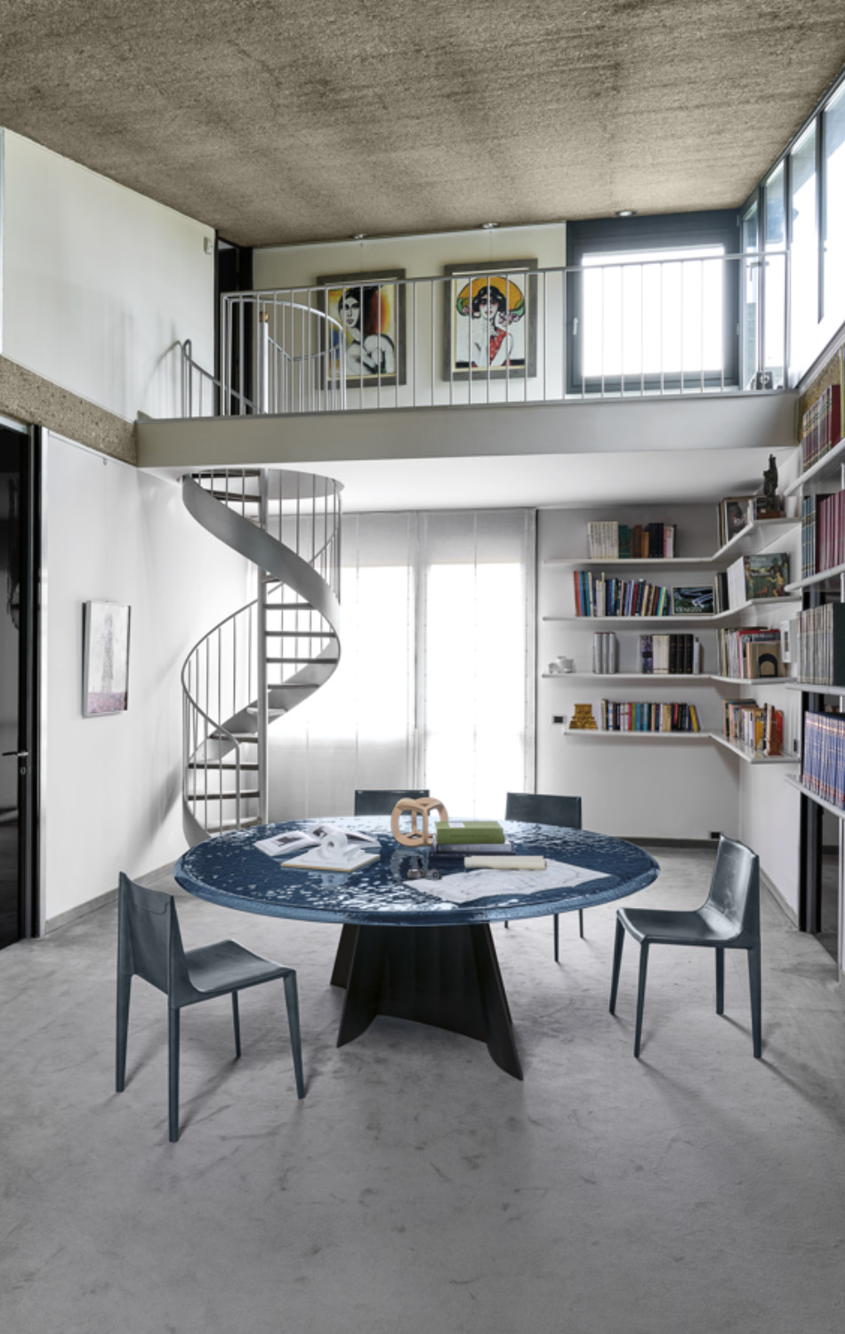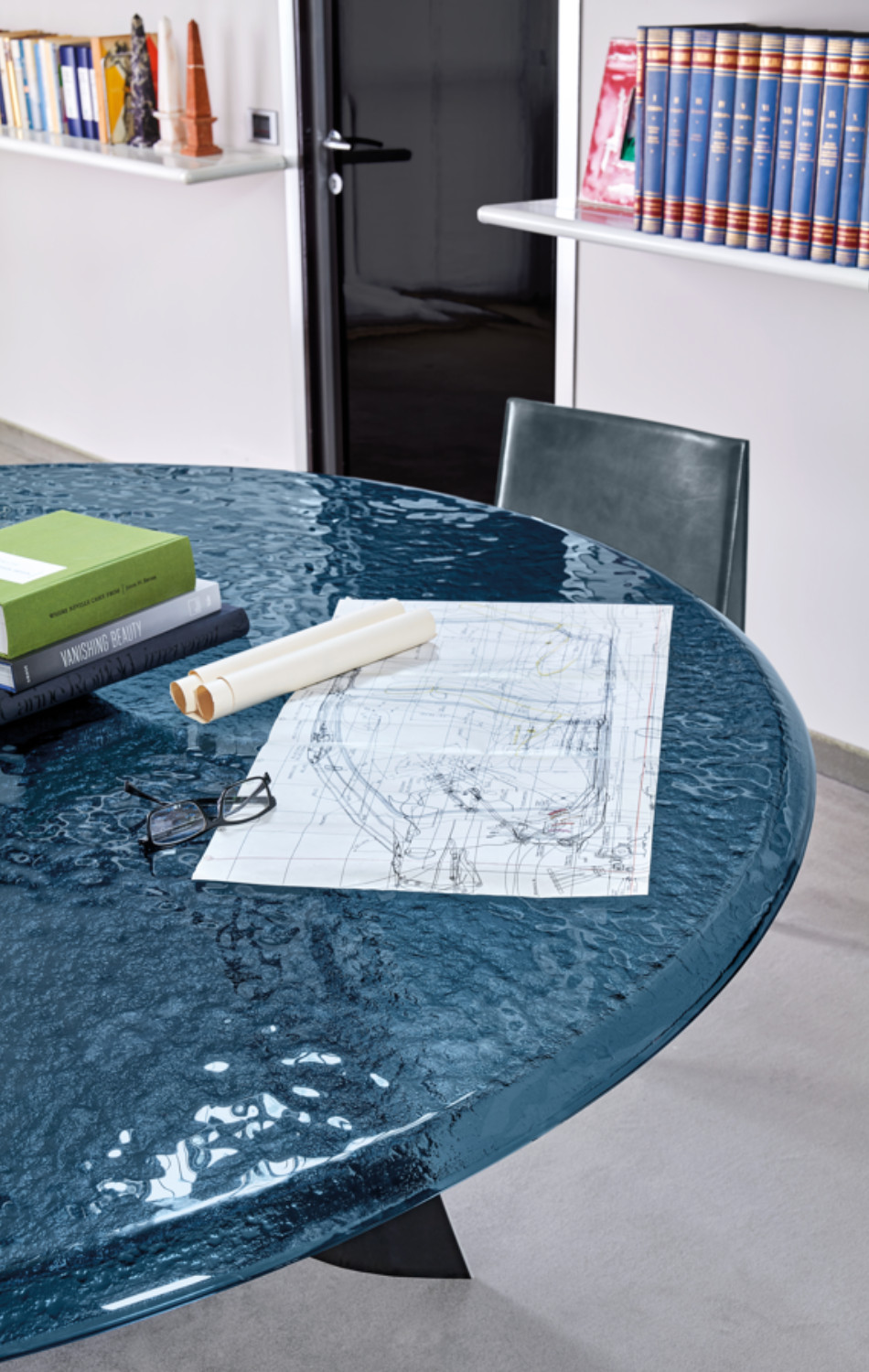 Roxy Music’s last and greatest album, Avalon, is a touchstone of the 1980s. Even as its namesake table expresses a signature ’80s brand of boldness, it speaks as well to more ancient folklore and myth—the legendary island of Avalon, where King Arthur’s fabled sword, Excalibur, was forged—in particular through the tabletop’s Pacific blue finish. Below Avalon’s otherworldly disc of annealed glass, the powerful metal base winds like a welling tide with elegance and élan.