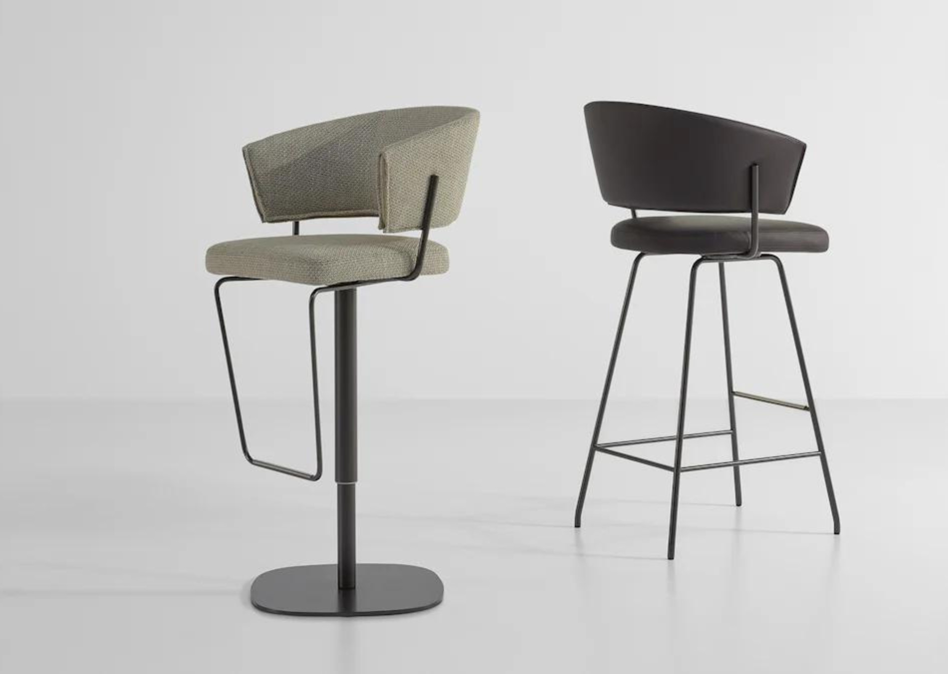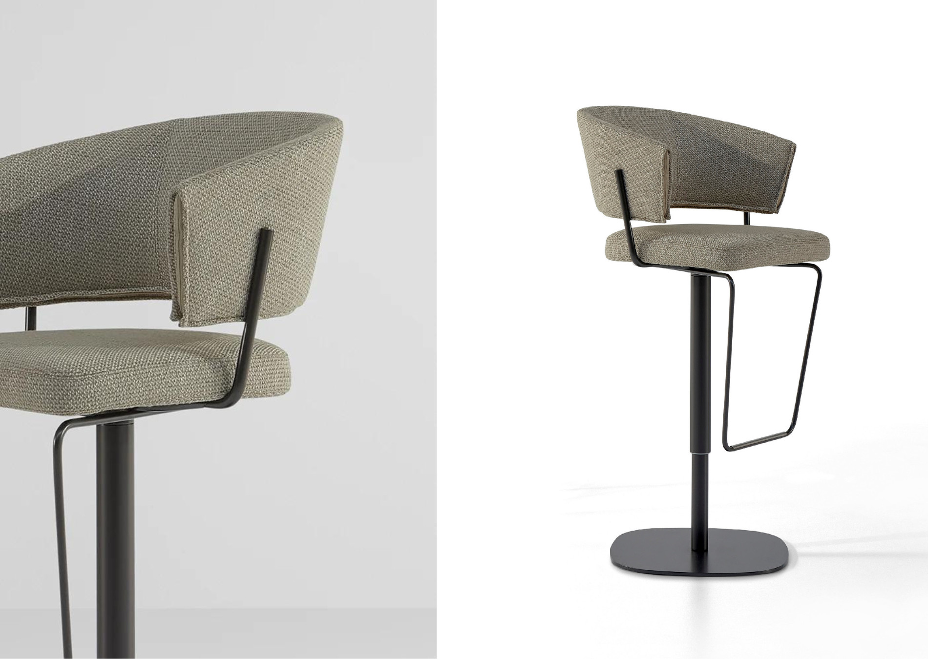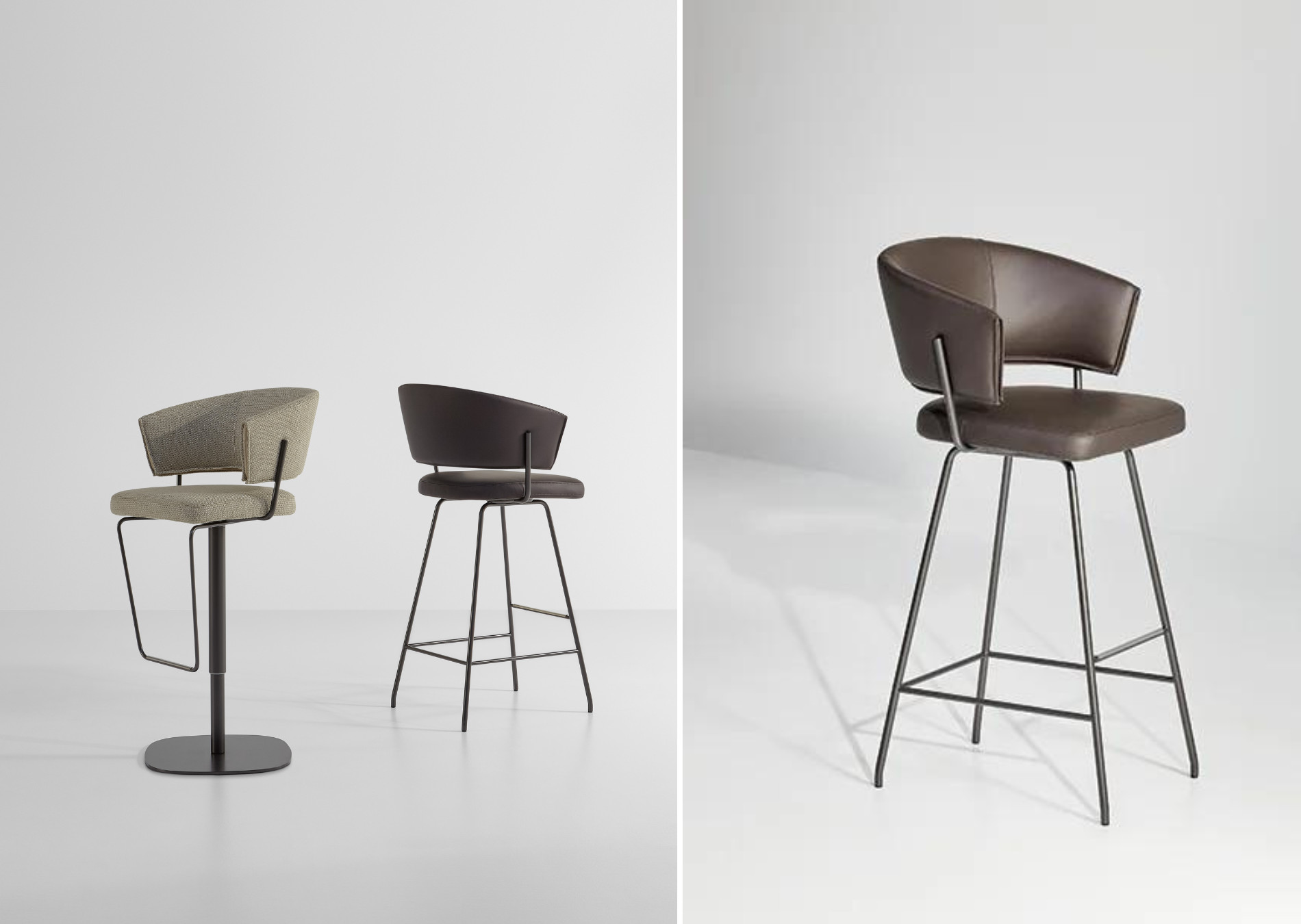 The Bahia too stool with backrest is the result of the combination of curved shapes and simple tubular metal elements, giving as a result an extremely balanced aesthetic. Available with swivel or fixed base, Bahia too is the ideal stool for furnishing both residential and contract spaces. The curved backrest allows free support of the arms and generously wraps the back. Bahia too is covered in fabric, eco-leather or leather.