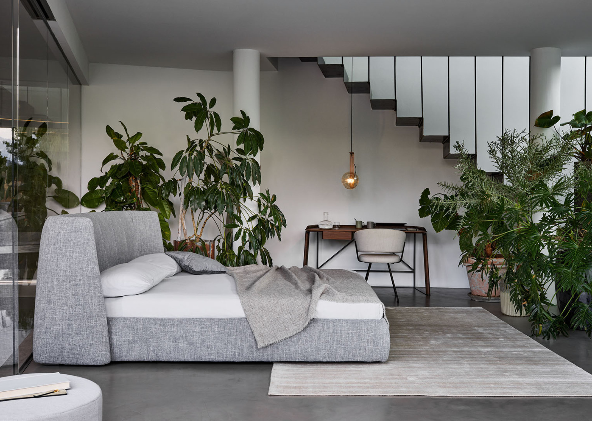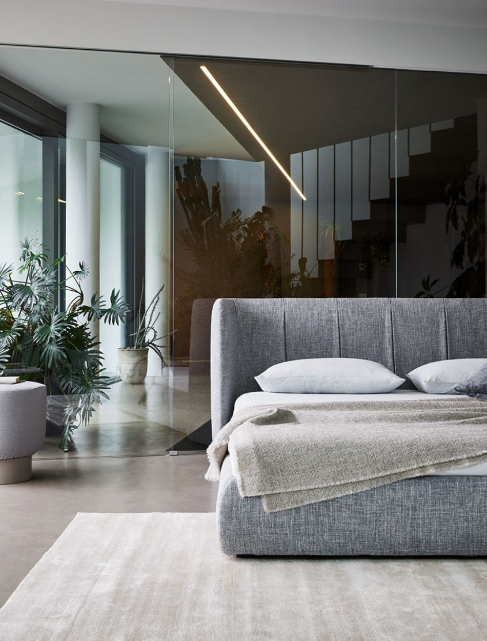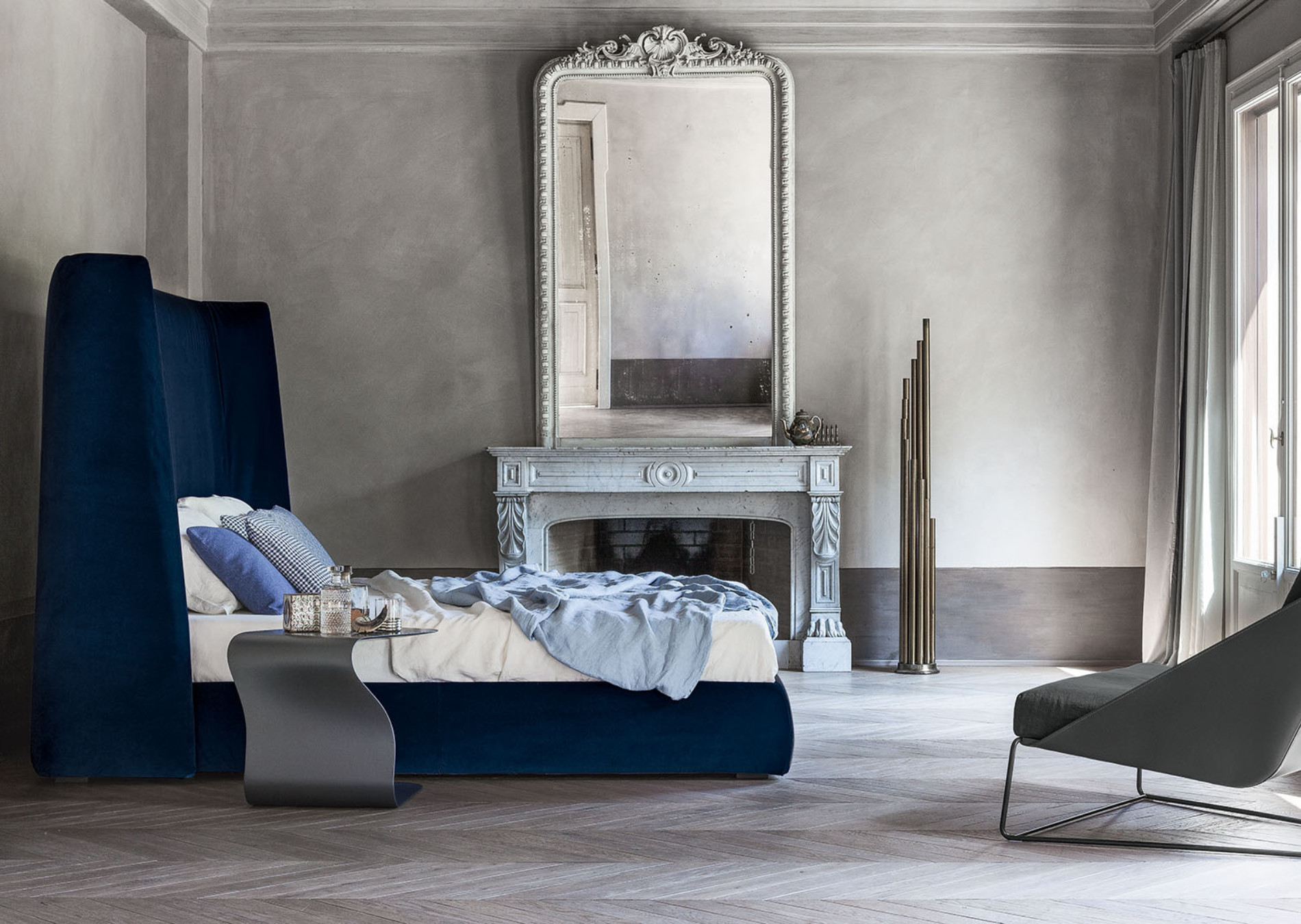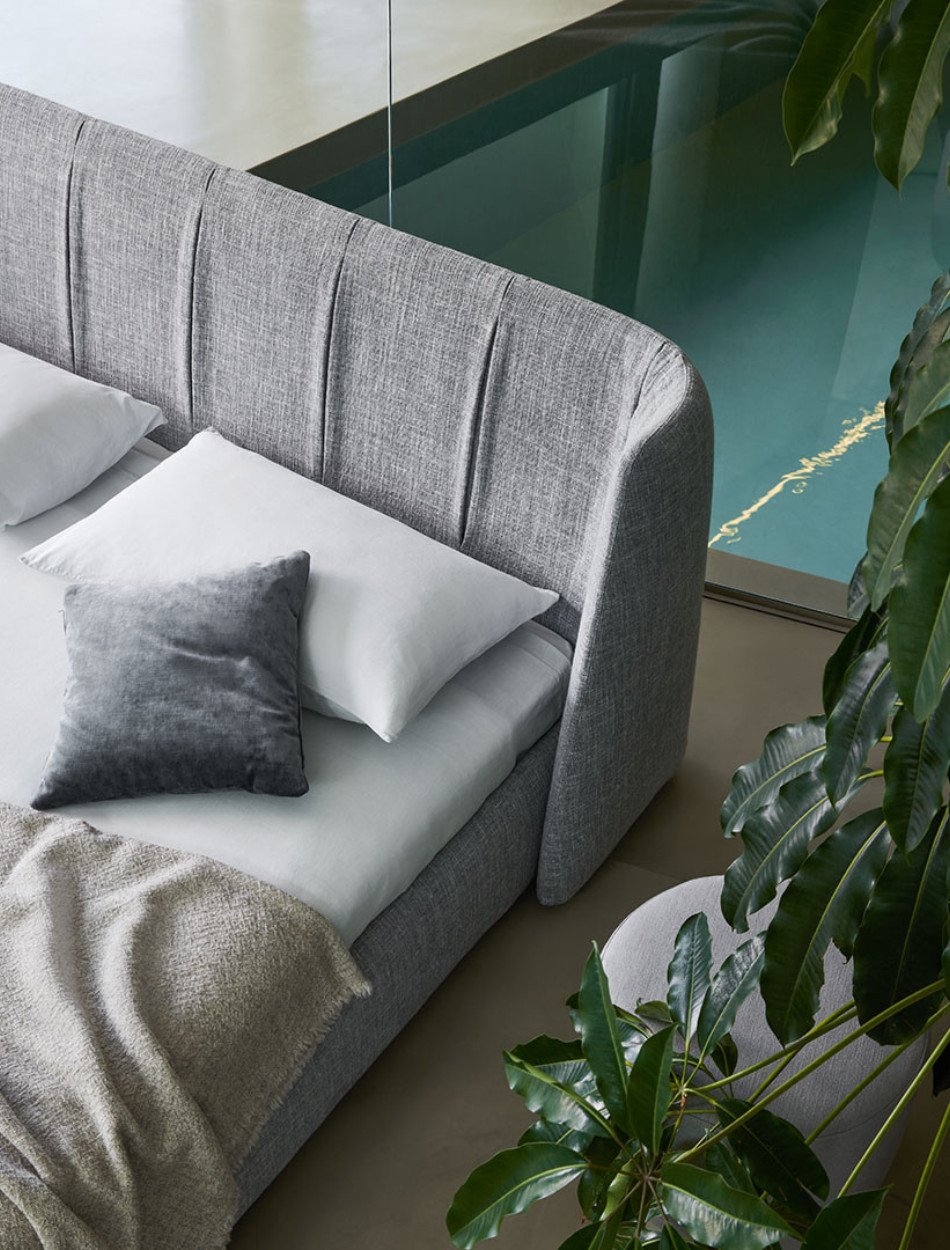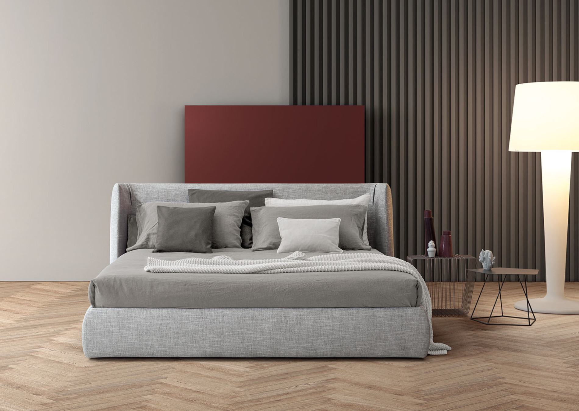 The Basket unique bed headboard has been designed by calibrating large shapes with soft, enveloping lines. This double bed is covered in fabric, leather or eco-leather, completely removable. There are many variations to the design: in addition to Basket, there is the Basket plus model, featuring sophisticated tucks on the headboard. The Basket, and Basket plus are also made in the “open” version: the practical unit provides valuable additional space for storing covers, cushions and everything necessary for the bedroom.