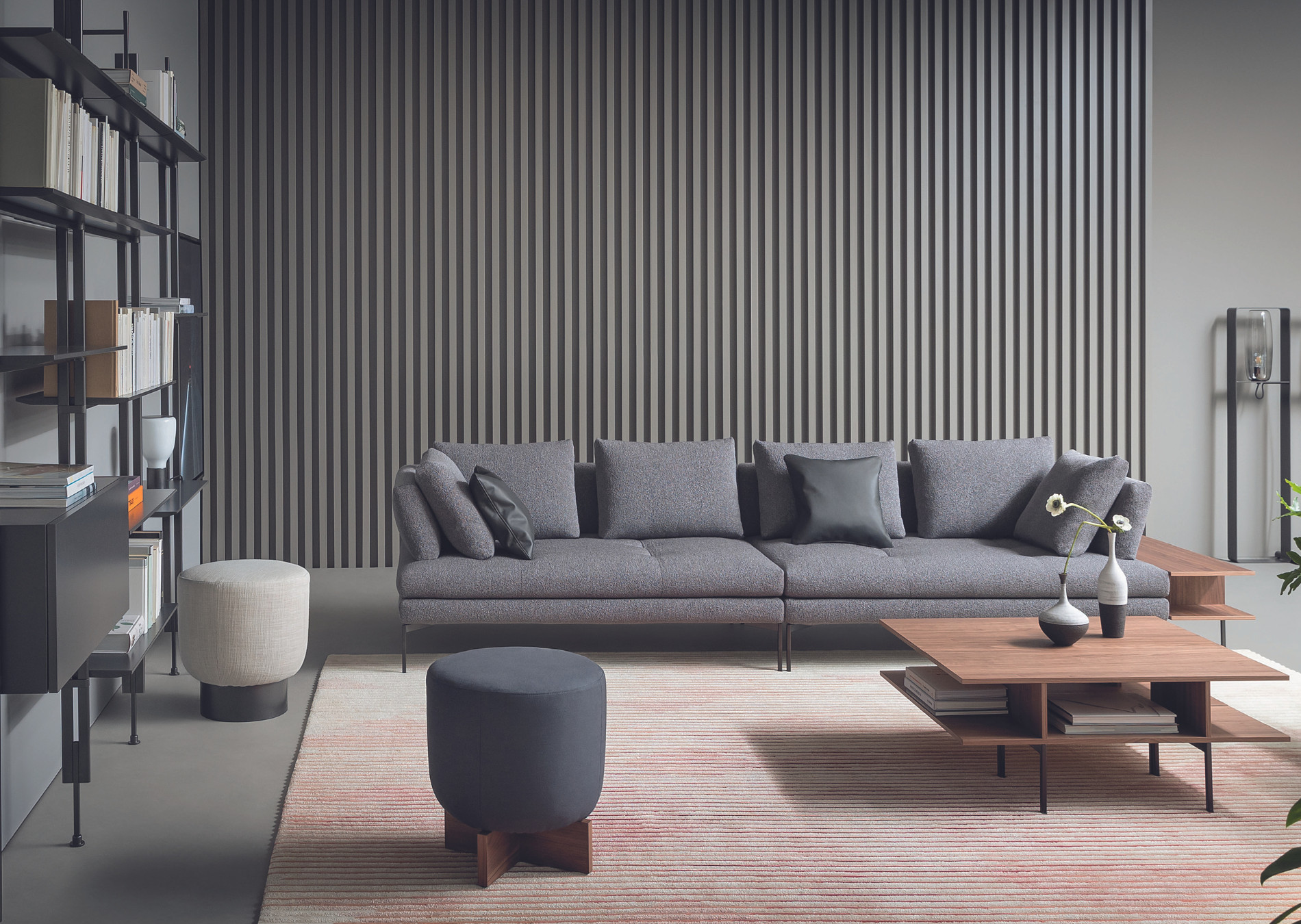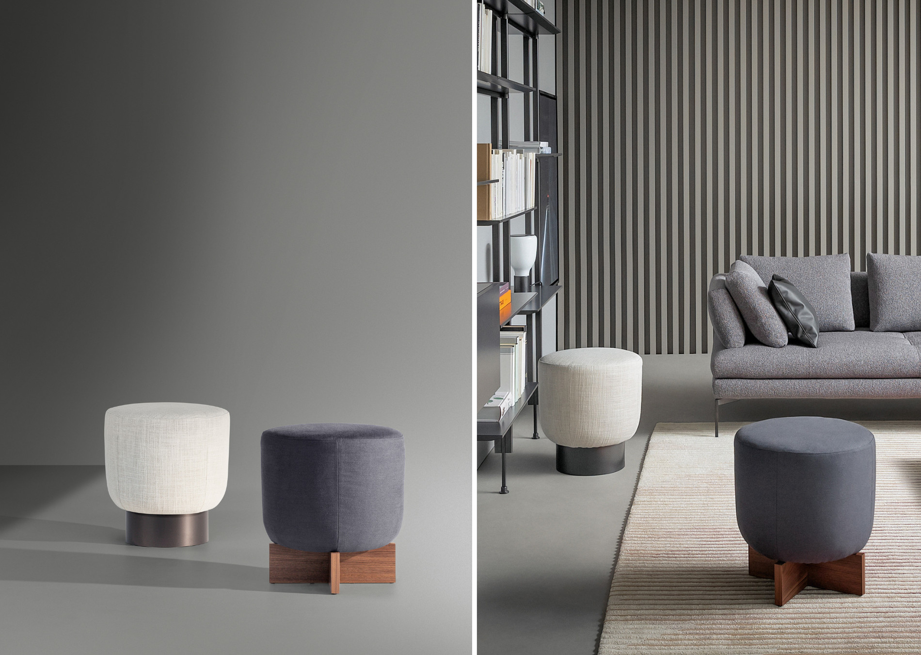 The padded top section is the same in both Belt and Cross modern footstools, with no straight lines but just curved surfaces that gently complement each other, gracefully floating on their base. They are distinguished by their bases, which give each of them a distinct personality: the Belt pouf’s round metal base plays with the concept of stability, while the Cross’s cross-shaped wooden base is the detail that makes this accessory immediately recognisable. While their similarities make them ideal for pairing together, like two members of the same family with opposing personalities that complement each other, it is their differences and the variety of possible combinations that create a dynamic, lively and constantly changing environment.