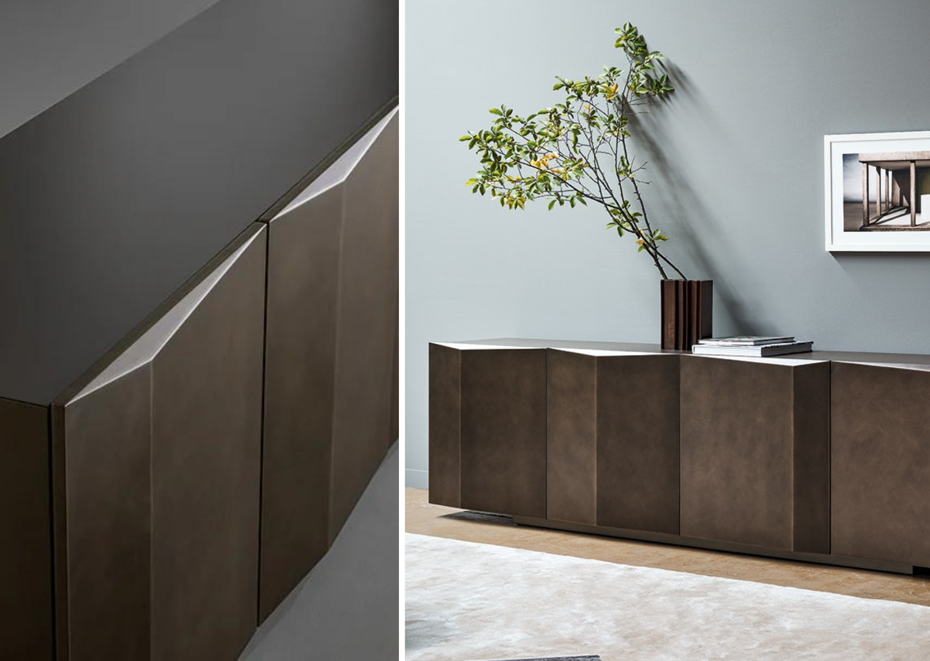 Bernois is the model of the modern geometric sideboard, focused on volumetric and formal simplicity, and enriched thanks to the refinement of a number of small stylistic variations. Roberto Paoli’s design is based on the perceptive effects generated by a slight raised relief pattern of the doors: a sequence of vertical “folds” that generate an iridescent interplay of chiaroscuro. The appearance of the furniture thus changes according to the light and the observer’s point of view, in line with an aesthetic idea that interprets the dynamic style of contemporary life.
