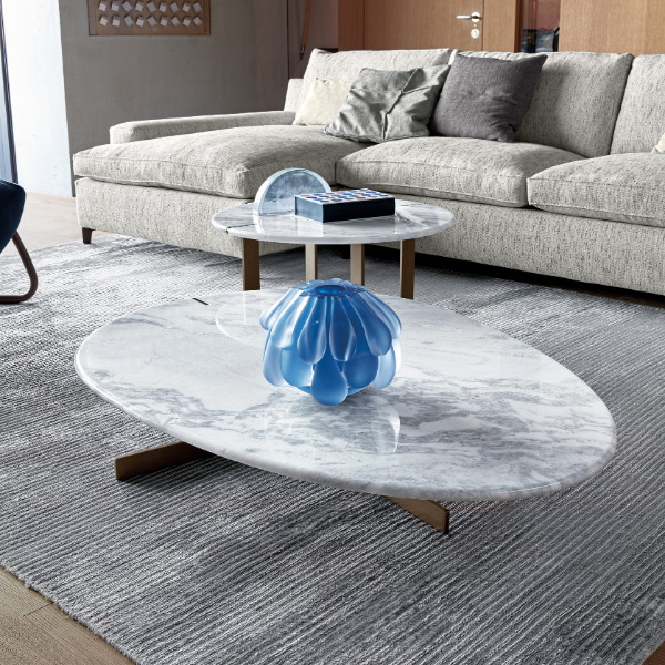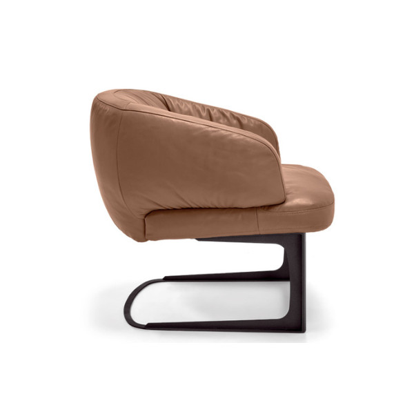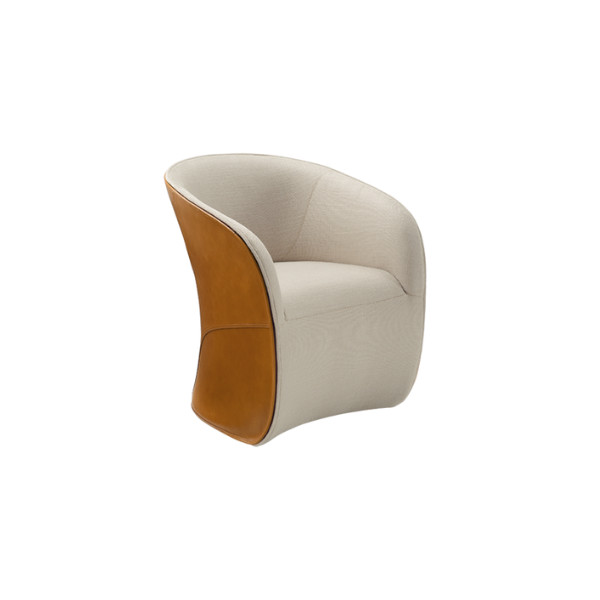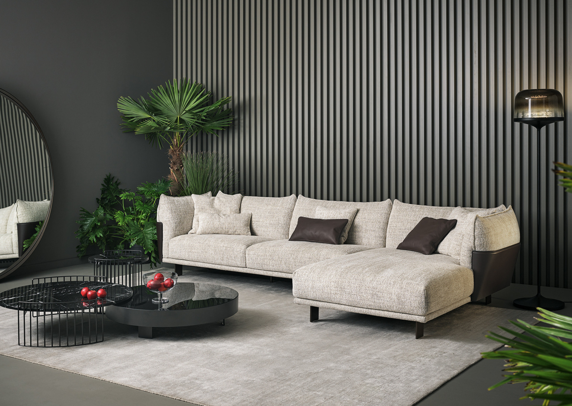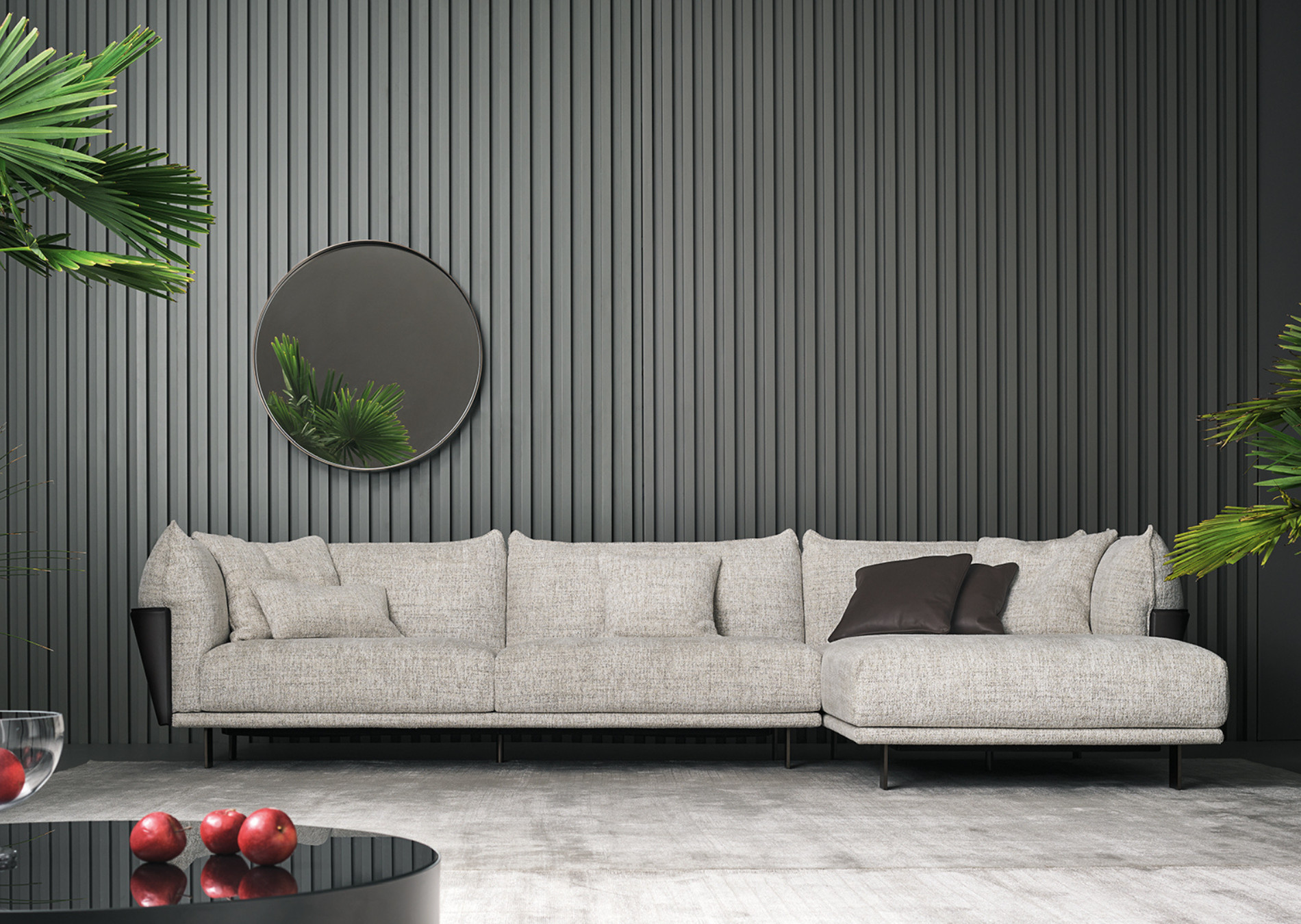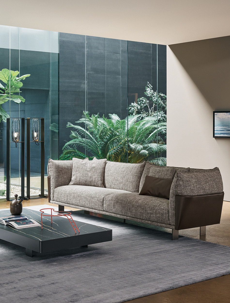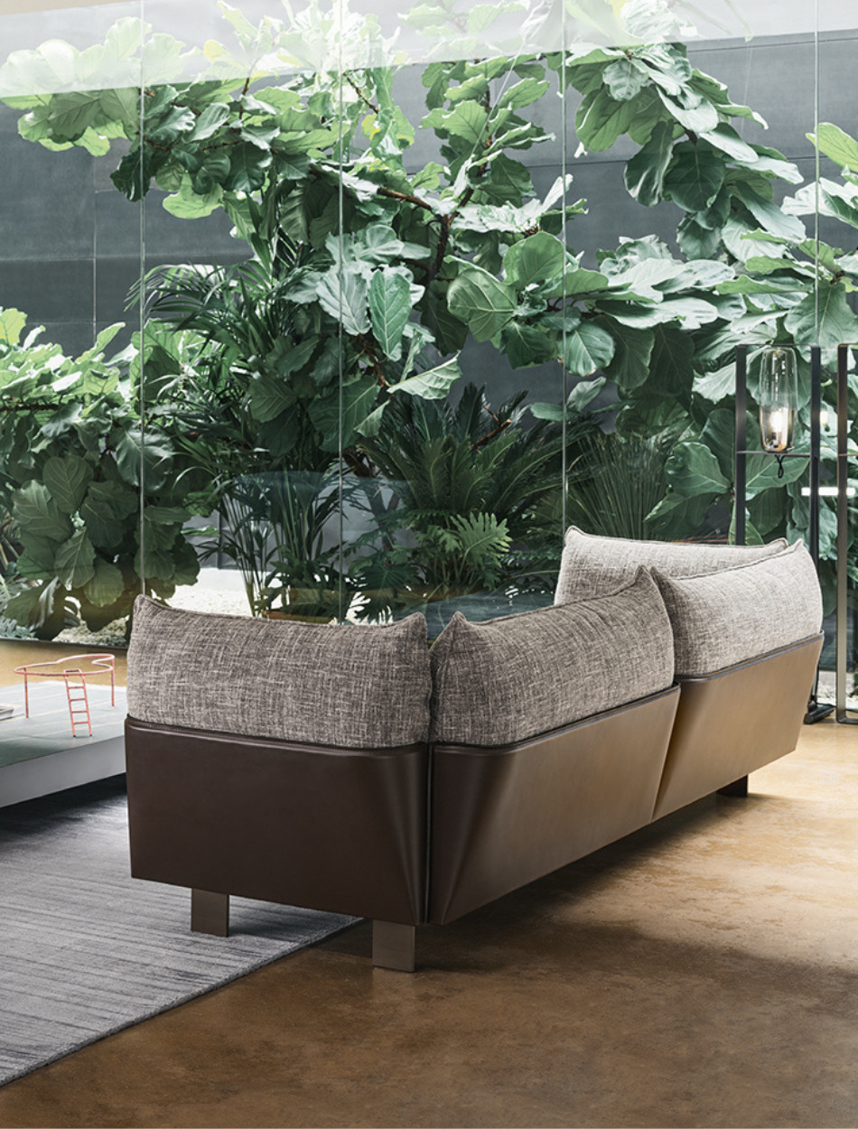 The Blend modern elegant sofa is characterized by the attention to details in the processing of its composite materials: emery leather and fabric. The linearity of the perimeter structure covered in emery leather balances and adds value to the upholstered part, creating a rigorous line that widens upwards from the bottom, merging with a sinuous and welcoming curve that leads back inwards. The overall effect is that of a solution characterised by an elegant image and a soft composure. A strong, distinctive element that can be appreciated from all angles gives this collection rigour and softness: the emery leather structure frames the cushioning and allows it to develop visually even further.