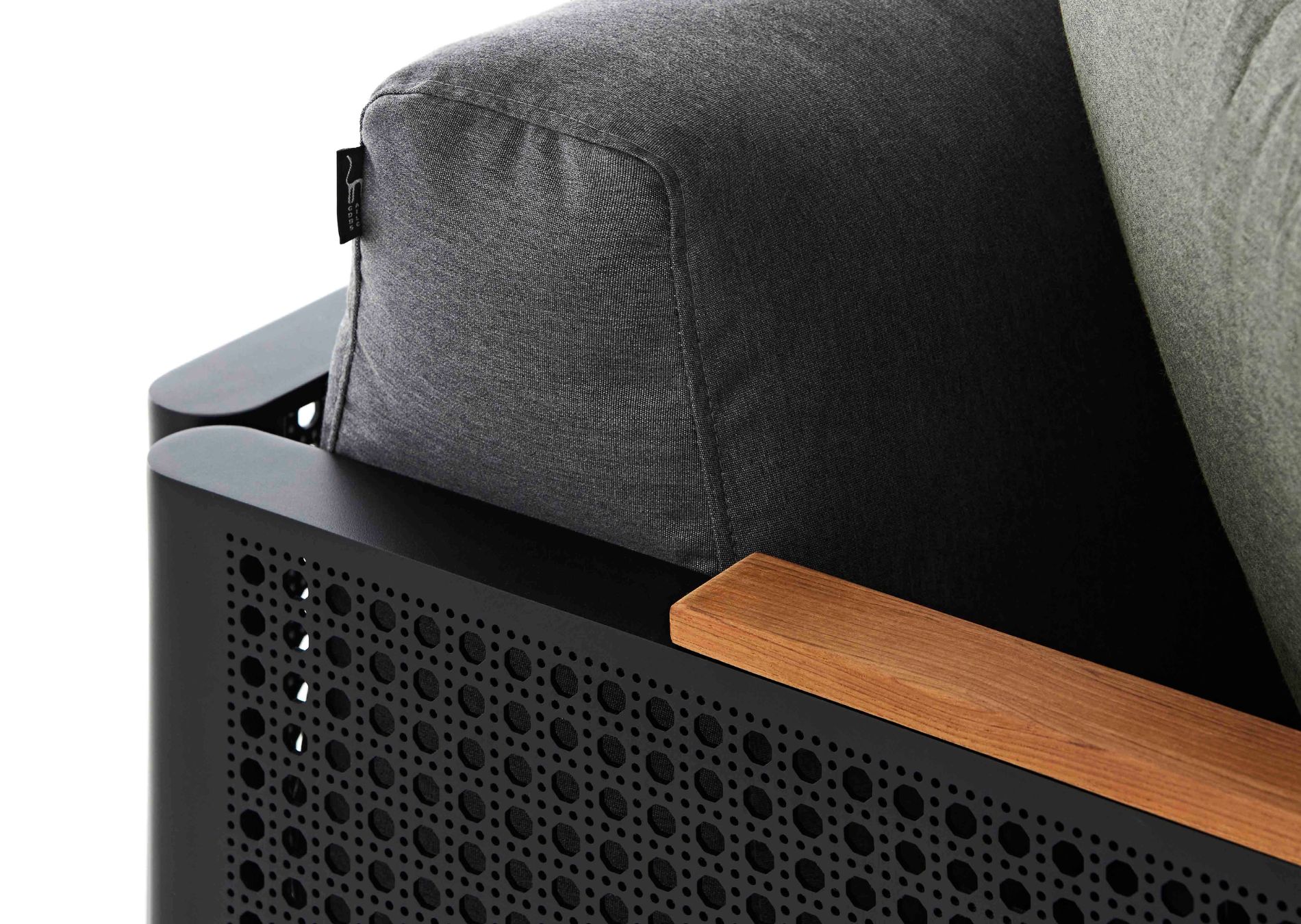 The frame of the BOSC outdoor sofa is available in all GANDIABLASCO powder-coated colours, white, sand, bronze, wine red, greenish-blue, cement green, anthracite, black, bottle green… The armrests are available in iroko wood.
