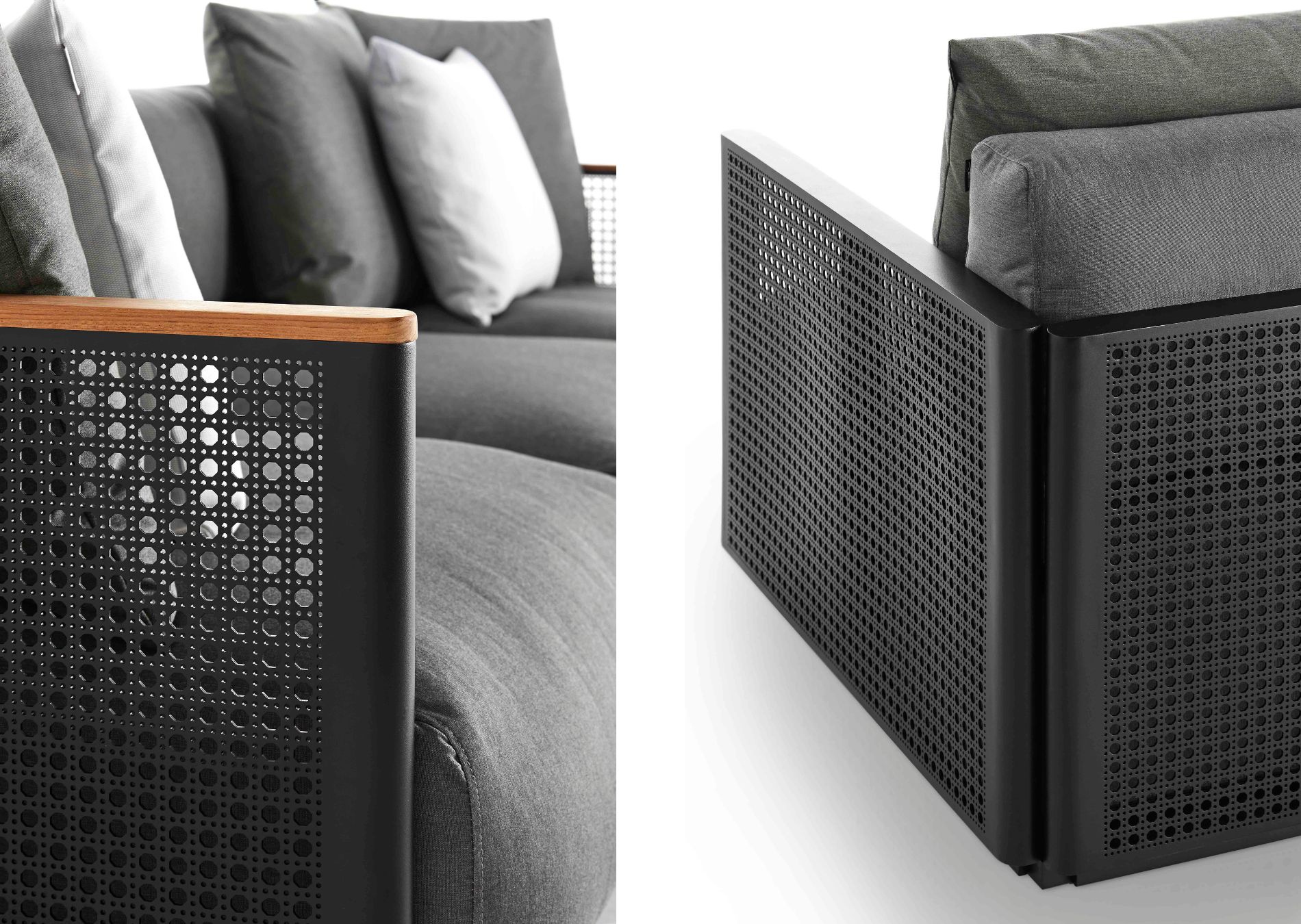 The BOSC 2-seat sofa completes the collection. It is a designer sofa made of a welded aluminium structure and micro-perforated sheet metal that reproduces the natural wicker pattern traditionally used by artisans, especially in the Mediterranean. Generous polyurethane and memory foam rubber cushions and pillows rest on it, covered with water-repellent fabric and upholstered with Sunbrella or Kvadrat quality textiles that you can customise with different textures and colours.
