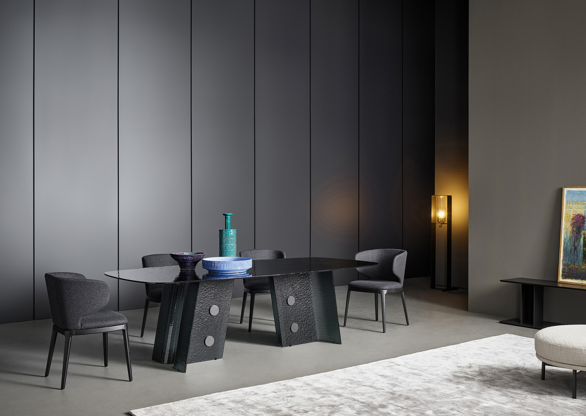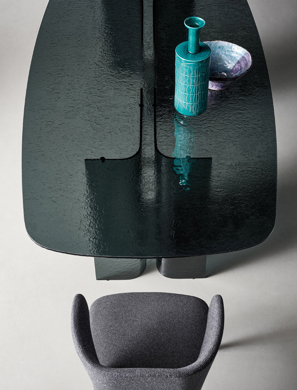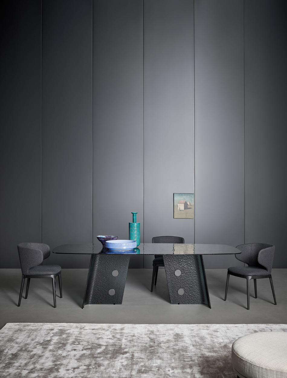 The name – “button” in Spanish – refers to the metal inserts applied to the base, which catch the attention due to the contrast they make with the table’s overall image. The material of choice for Botón is fused tempered glass, a choice that accentuates the product’s elegance and sophistication and which makes it the perfect piece to place in the centre of a space as the undisputed star of the dining room. The rounded rectangular top of the Botón table has a linear design, while each of the two legs that form the base is made of a pair of glass strips that extend outwards, forming an angle that gives this modern glass dining table stability.