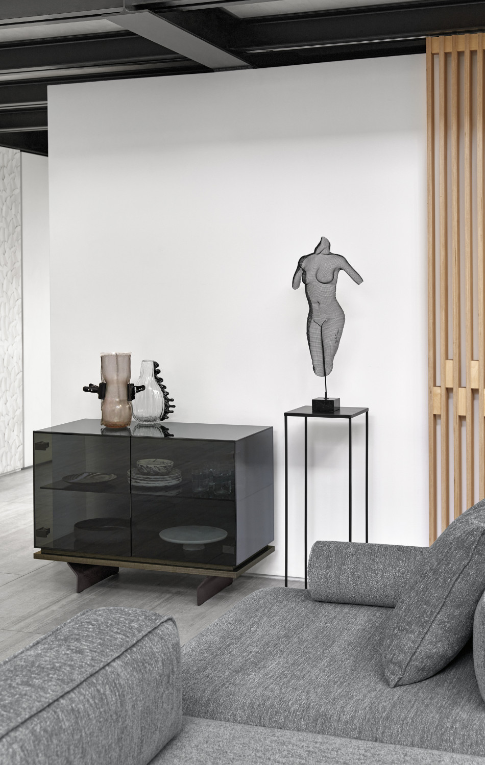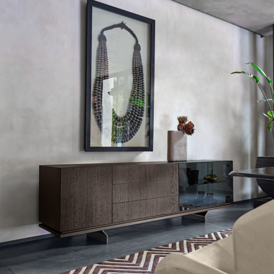 Structure: one storage unit with 3 drawers and 1 door in MDF veneered eucalyptus or Zebrano; one storage unit with 2 doors and 1 inner shelf in smoked glass.