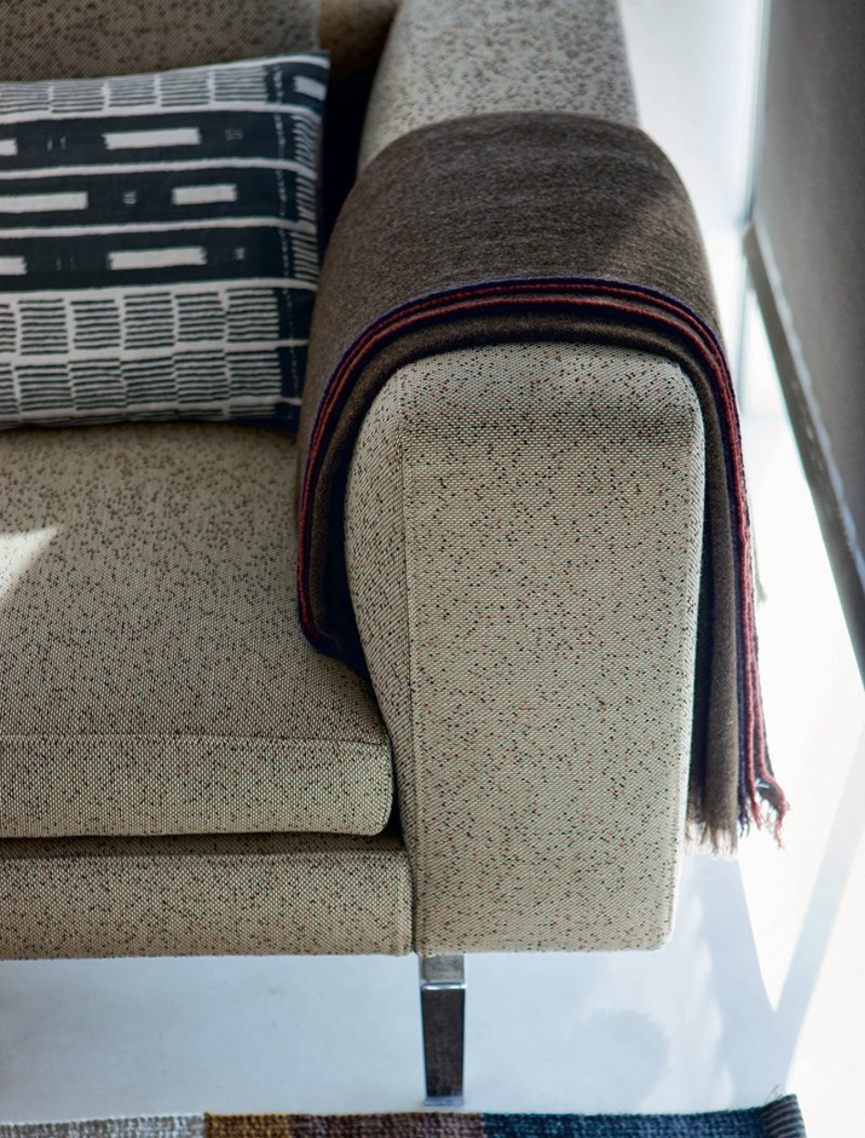 Monobloc and modular sofas, pouf. Polished aluminum alloy, or with natural or black nickel-satin finish, or black painted. Steel frame. Elastic strips suspension. Upholstery in graduated polyurethane/ Dacron Du Pont. Seat cushion in polyurethane/DacronDu Pont. Back and armrest cushions in goose feather. Upholstery of roll-shaped cushion in polyurethane/ heat-bound polyester fibre. Removable cover in fabric or leather.