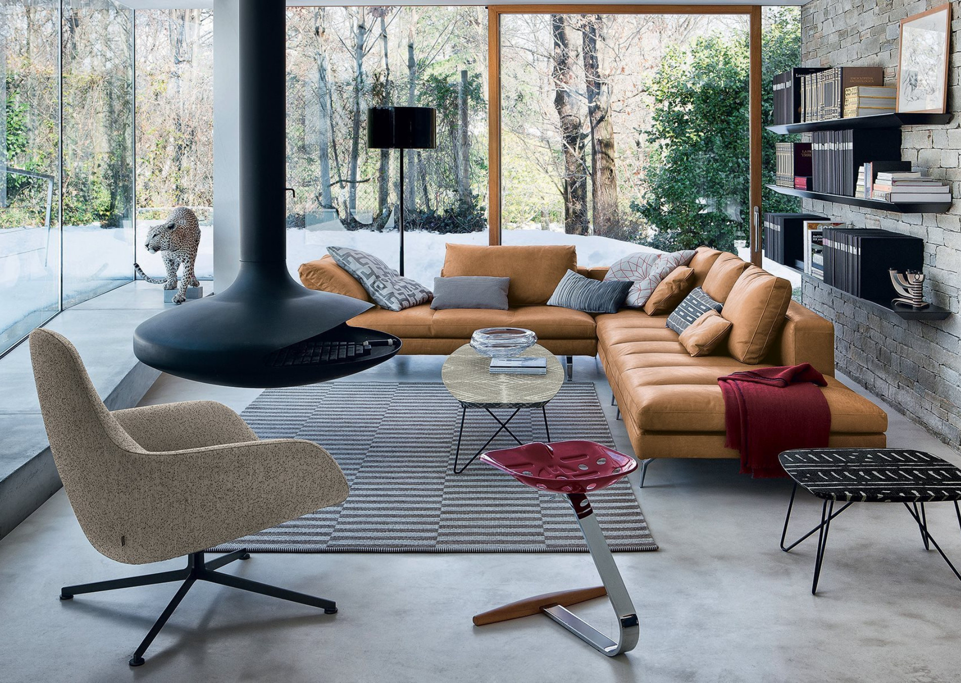 The series includes: monobloc sofas, modular elements, lounge chairs and pouf. The frame is made of steel, with elastic strips suspension and Dacron Du Pont/graduated polyurethane padding. The seat cushions are in Dacron Du Pont/polyurethane and the backrest in 100% pure goose feathers, with removable leather or fabric covers. A matching series of decorative cushions can be used to personalise your living room.