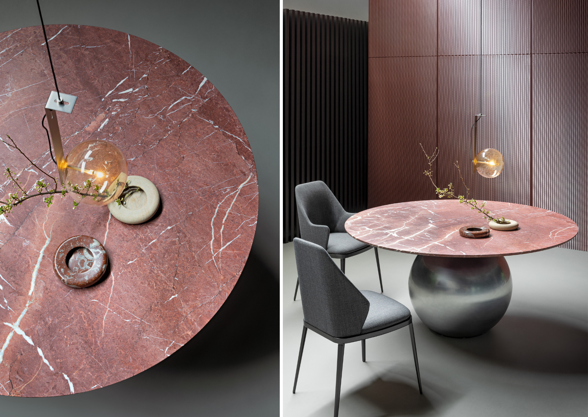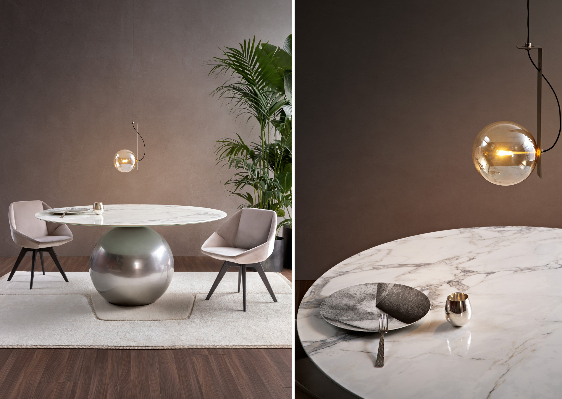 Circus is a fixed design round table which draws on the laws of physics for its contrast of quite different geometric shapes: the impressive and striking central base is surmounted by a large disc-shaped top, evoking a pleasant sensation of movement. The table acquires strength and elegance in a unique balancing act, becoming the real star of the living area. The top is available in solid wood, ceramic or marble, and it adapts perfectly to the style of the house, blending harmoniously with the environment without, however, losing its uniqueness. The metal base is available in different versions, including elegant bronze, lead, pearl gold, and burnished, clouded chrome, dark nickel and brown nickel finishes.