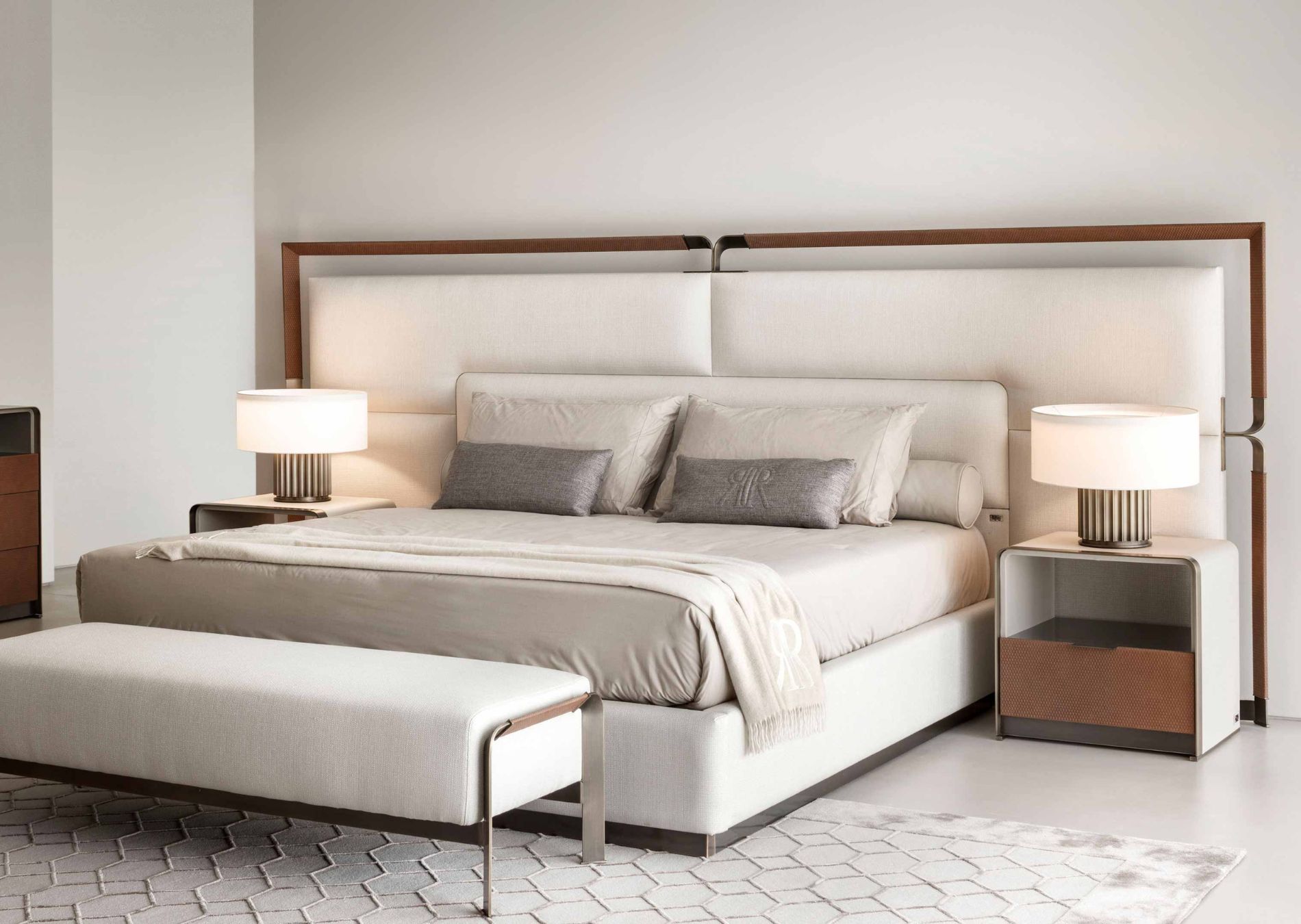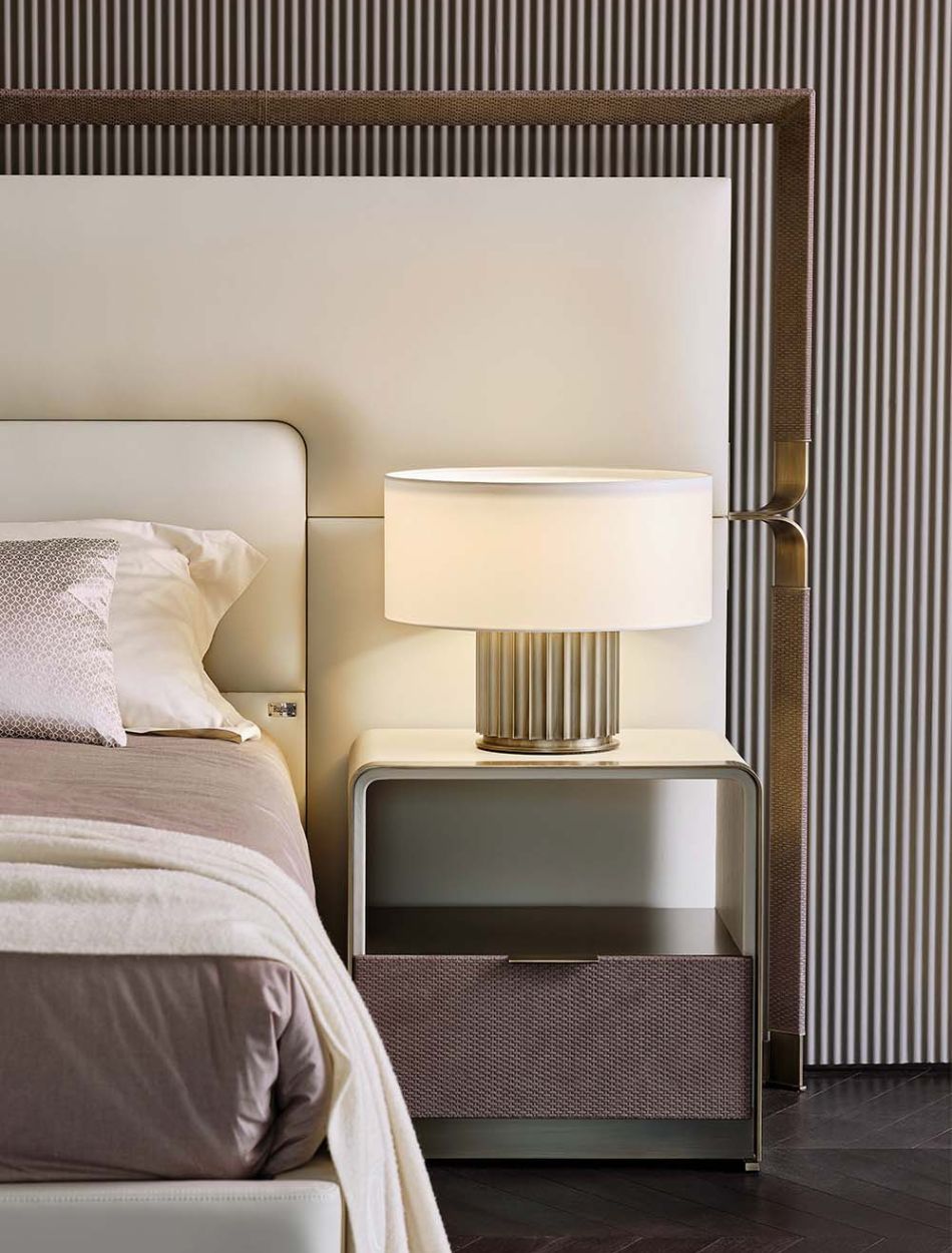 Bedside table with 1 drawer, upholstered in leather, with bronze details.