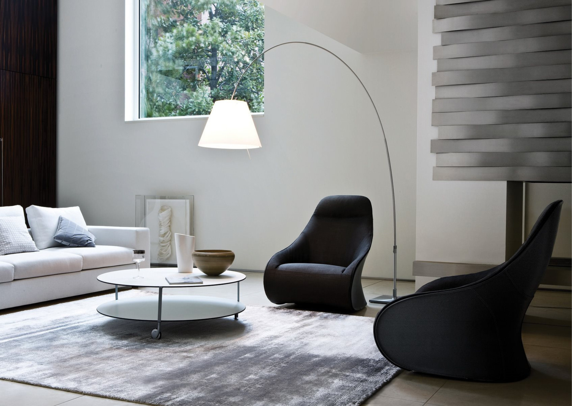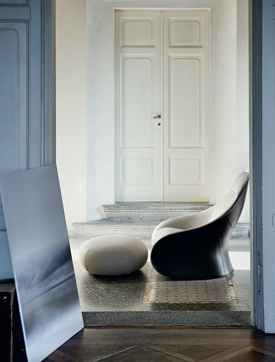 Armchair/bergère, pouf. Armchair with steel base, swivel or fixed with feet and stiff polyurethane external body covered with cowhide 95. Upholstery of internal body and pouf in polyurethane/ heat-bound polyester fibre with elastic strips suspension. Removable fabric or leather cover. Pouf steel frame.