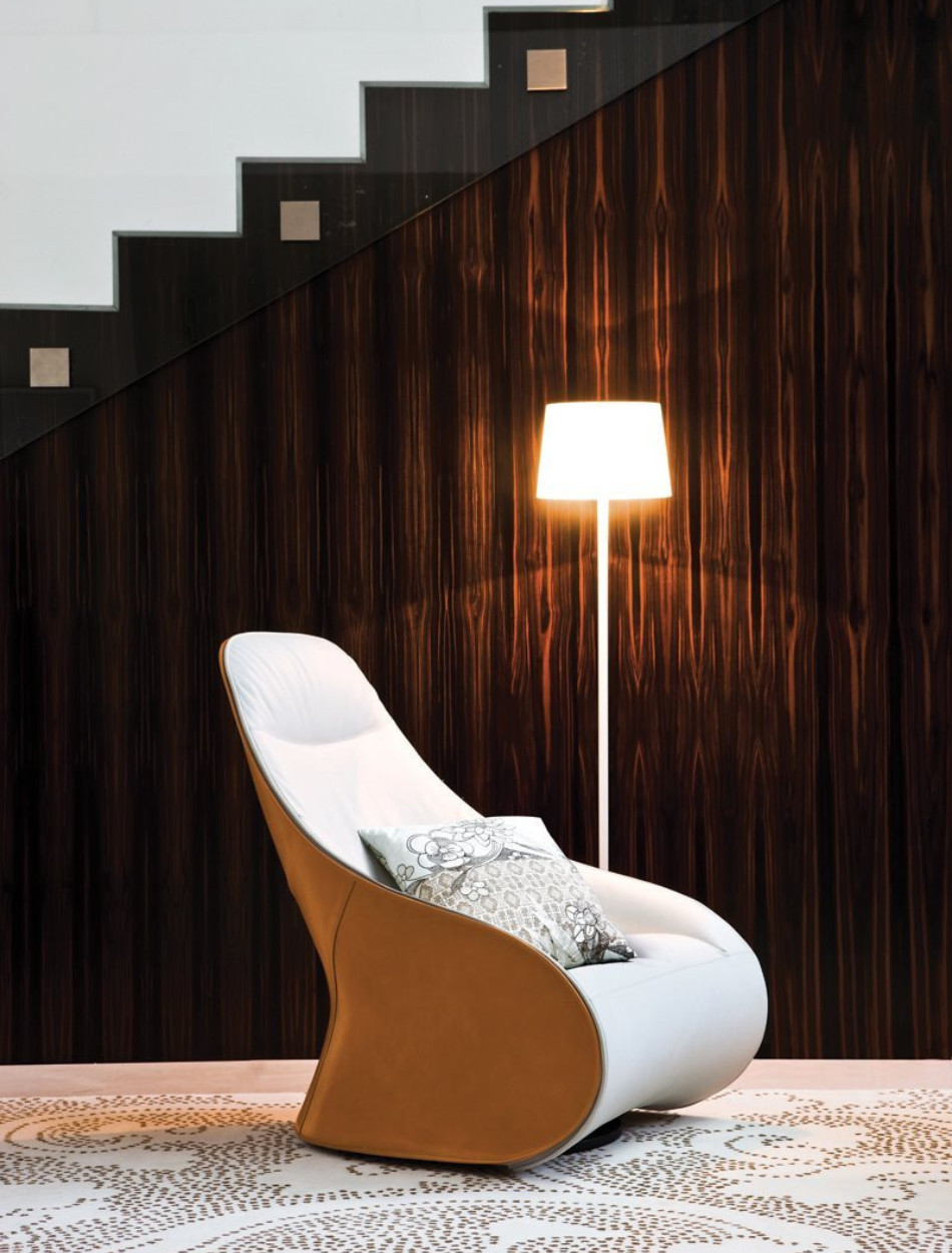 An armchair, whose body upholstered with hide encloses the soft richness of fabric or full grain leather. An armchair, whose materials and production techniques have been chosen to mirror time that goes by.