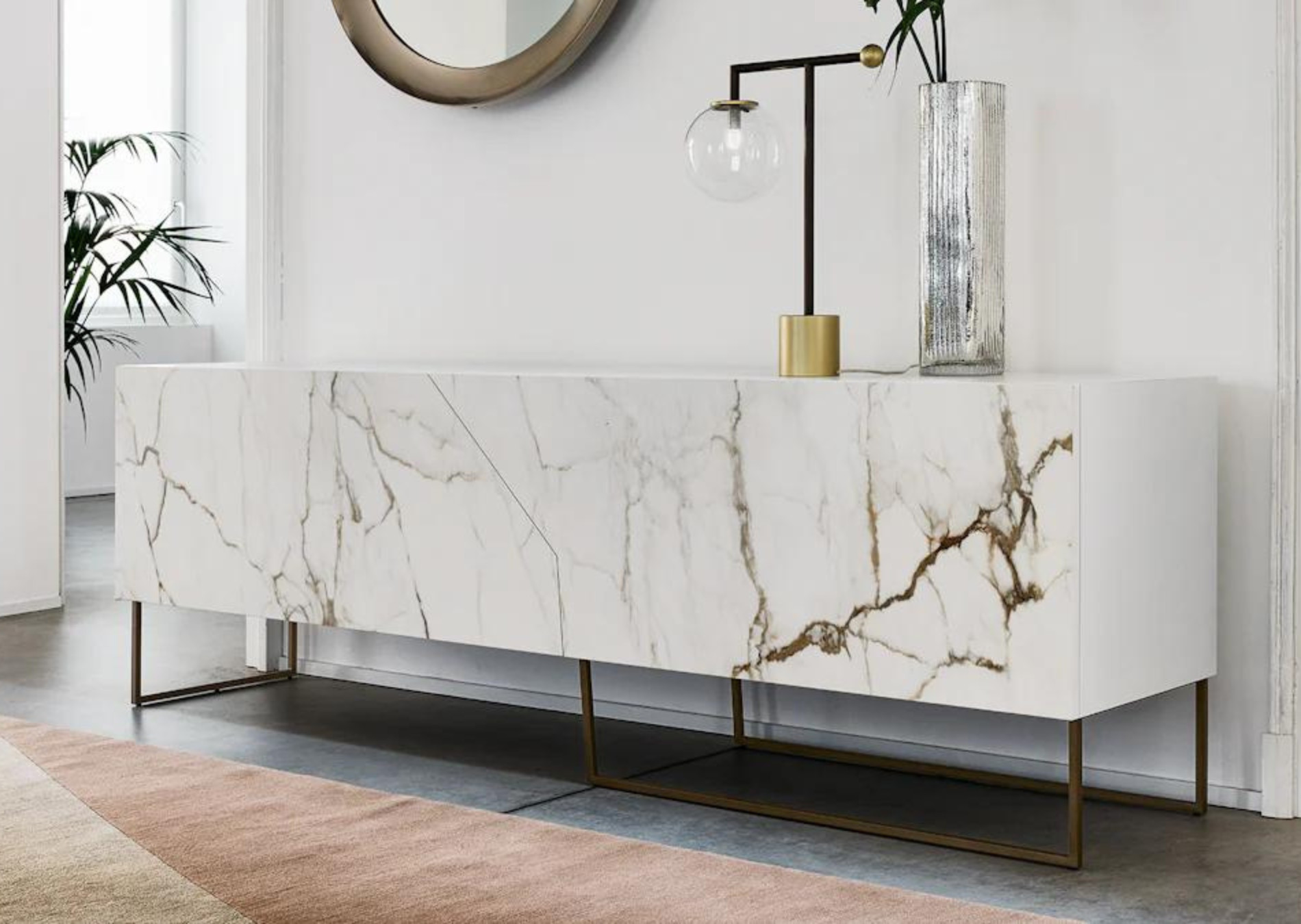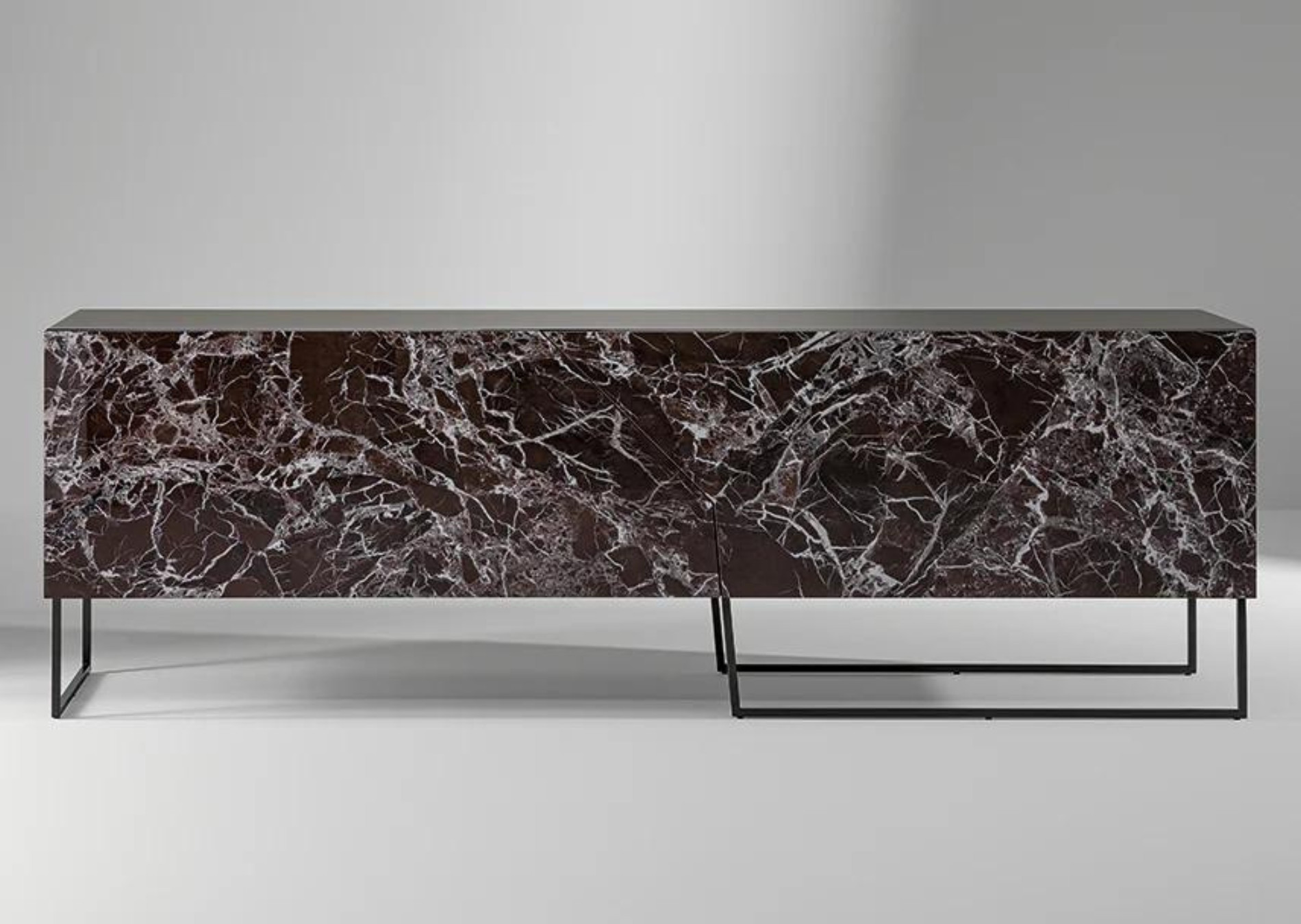 By applying geometry to the material used, the Doppler K Sideboard catches the eye on account of its notable scenographic strength, able to give character to any type of environment and interior design style. Appearing almost suspended on its linear metal base, the container in painted wood is unique thanks to the cladding of its ceramic doors with their asymmetrical openings. The asymmetrical opening of the doors is an additional sign of originality. Doppler K Sideboards are available in two different sizes: high and low modern sideboard to furnish both the living room and the bedroom. The original shaping and sophisticated materials create a result of absolute power in the Doppler K Sideboard.