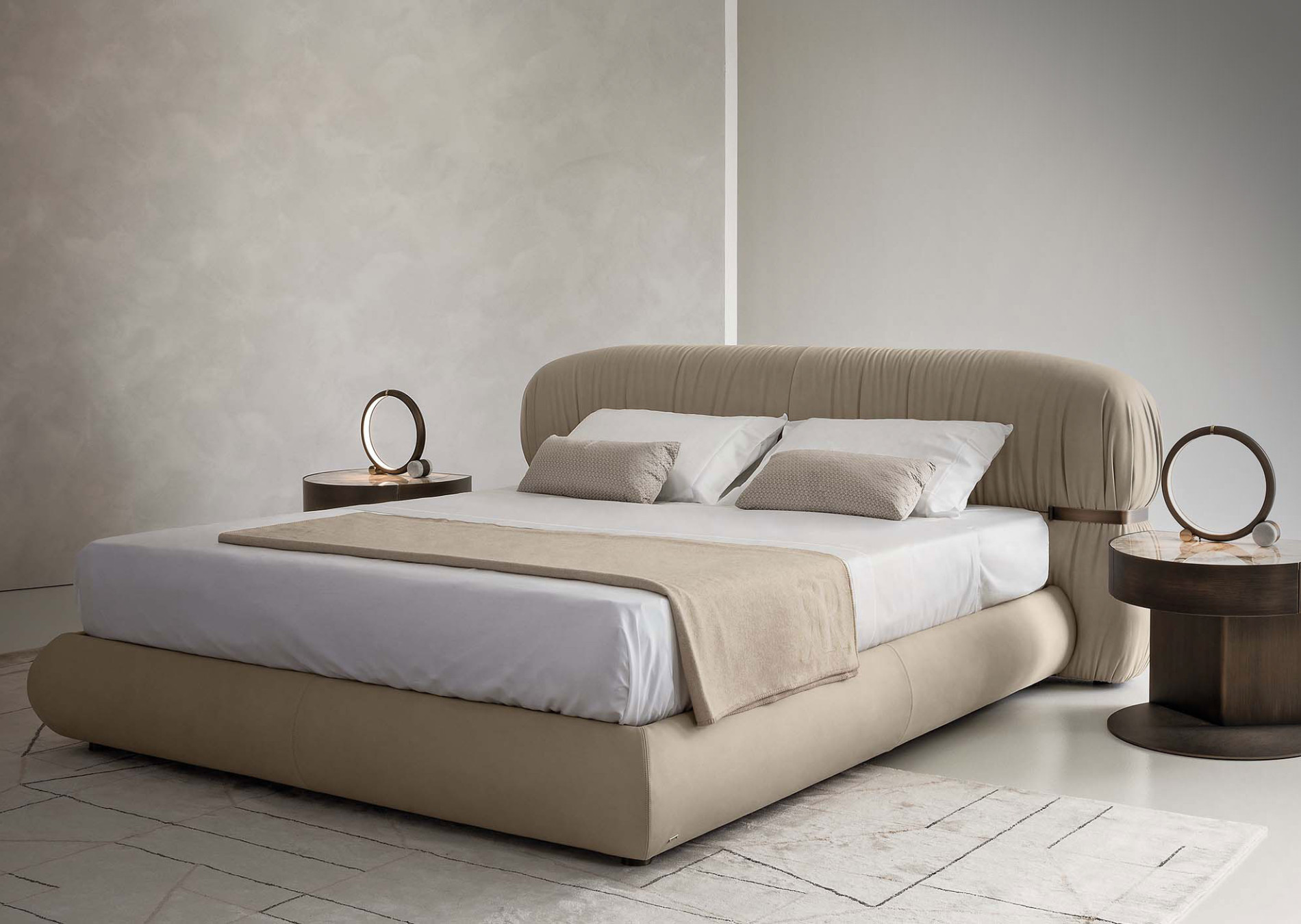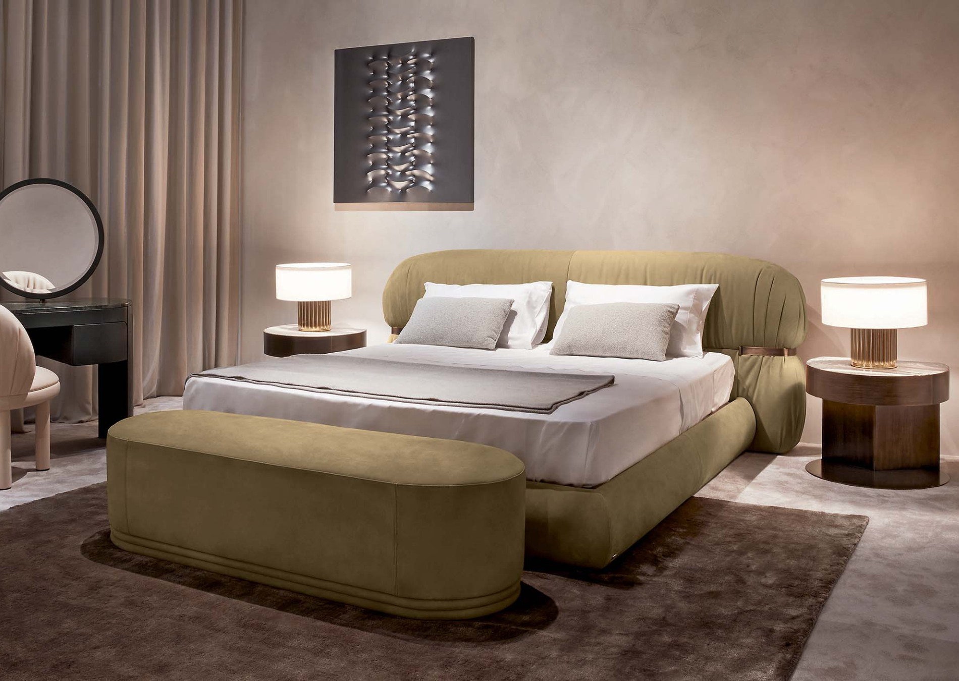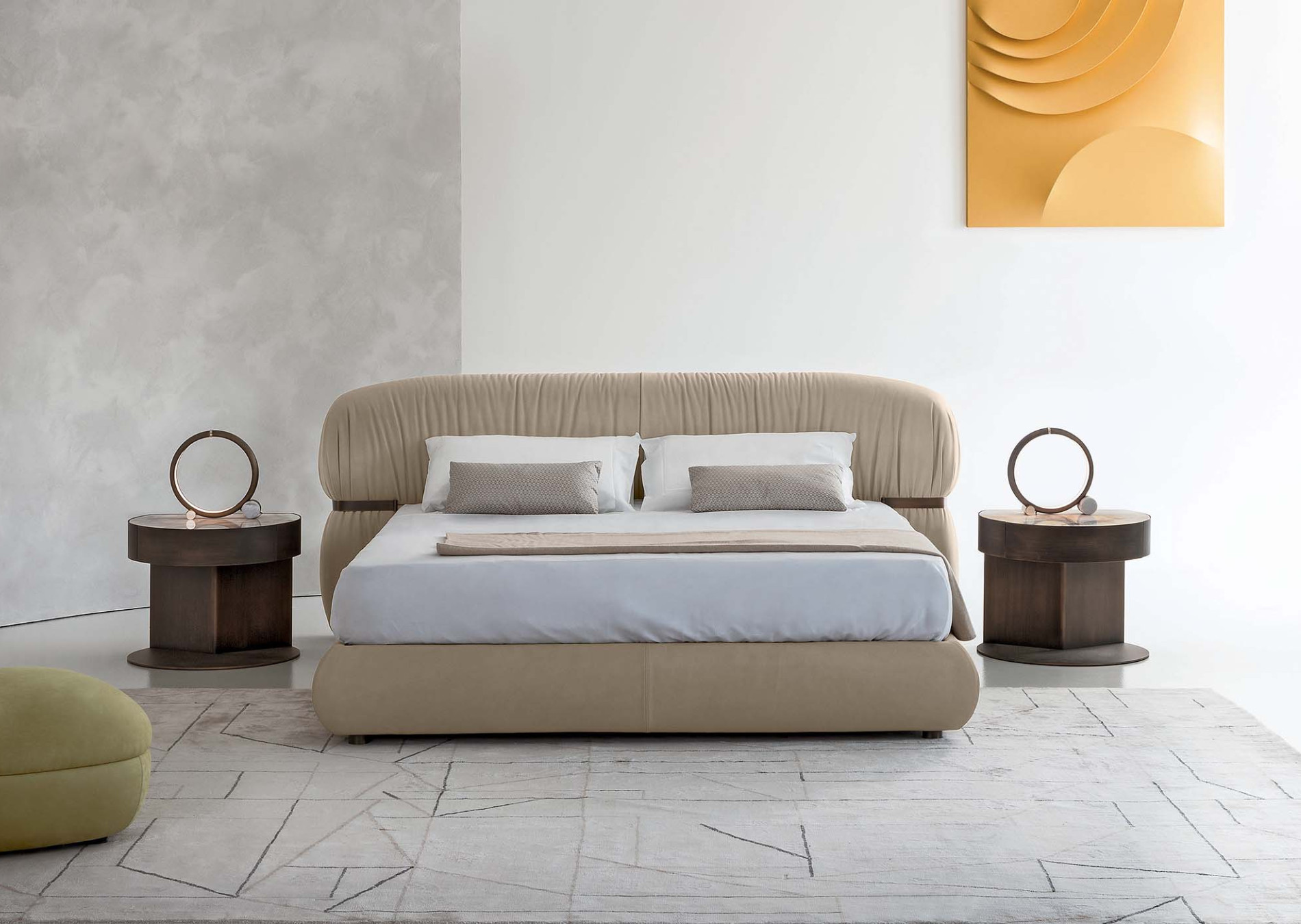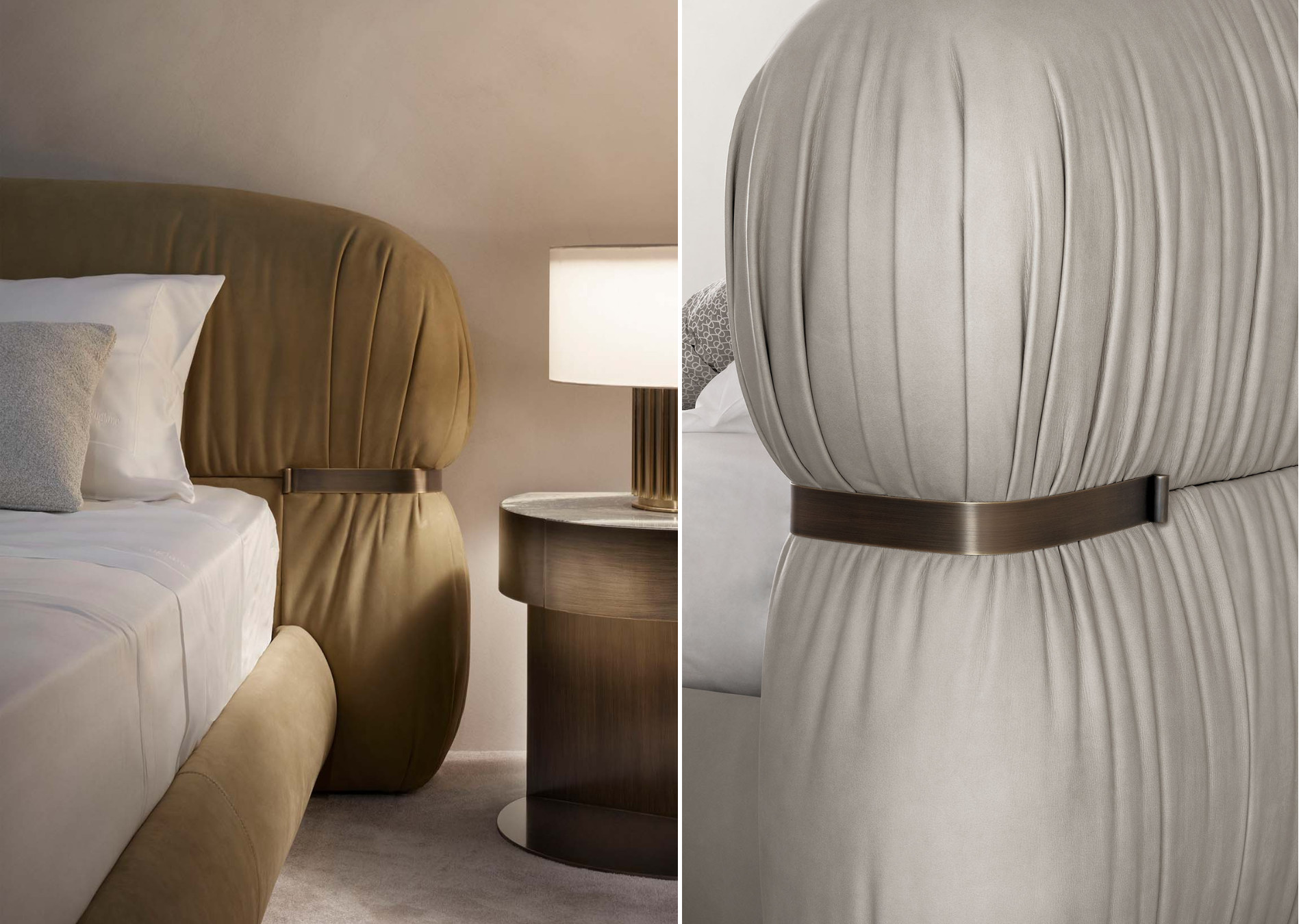 The heart of the product is the headboard with rounded volumes, upholstered in fabric or leather and with tailored finishes, embellished with a metal frame that incorporates the entire perimeter, enhancing the detail of the folds created by the abundance of the fabric. These volumetric details are also featured on the entire perimeter of the structure itself which gives elegance and refinement to the whole product.