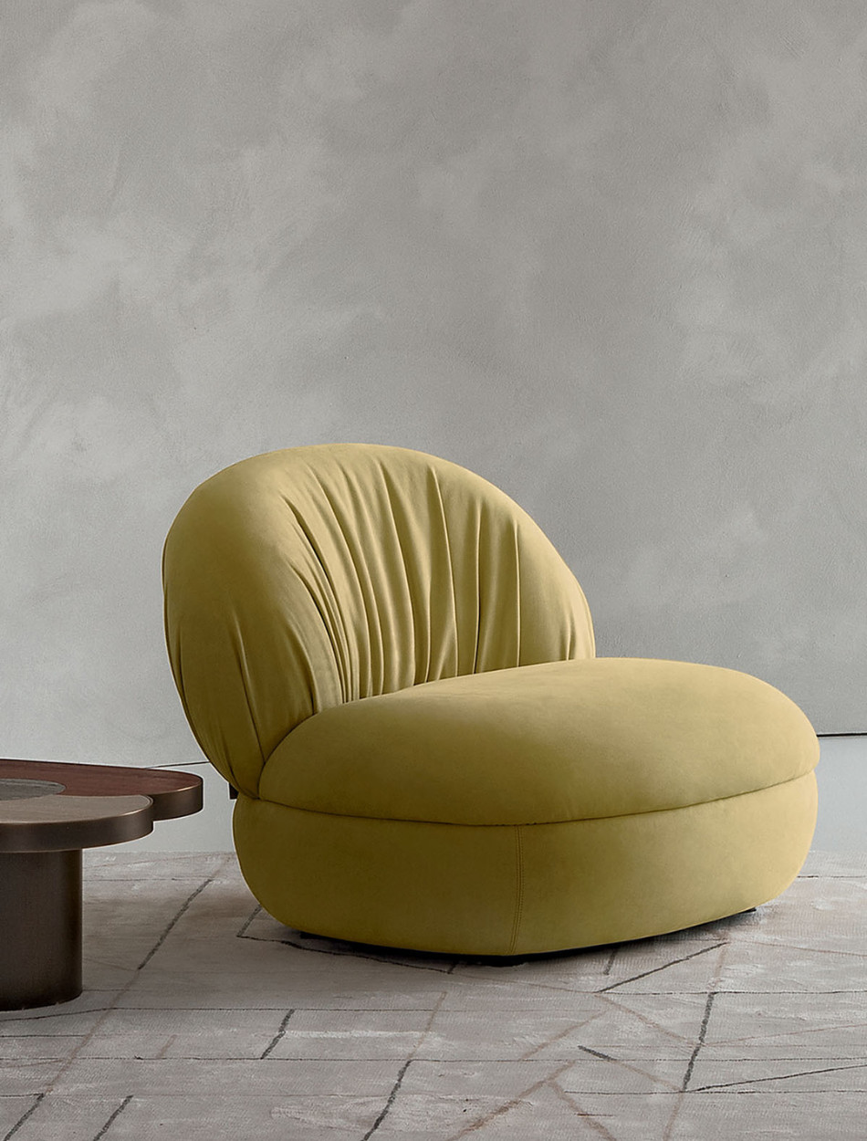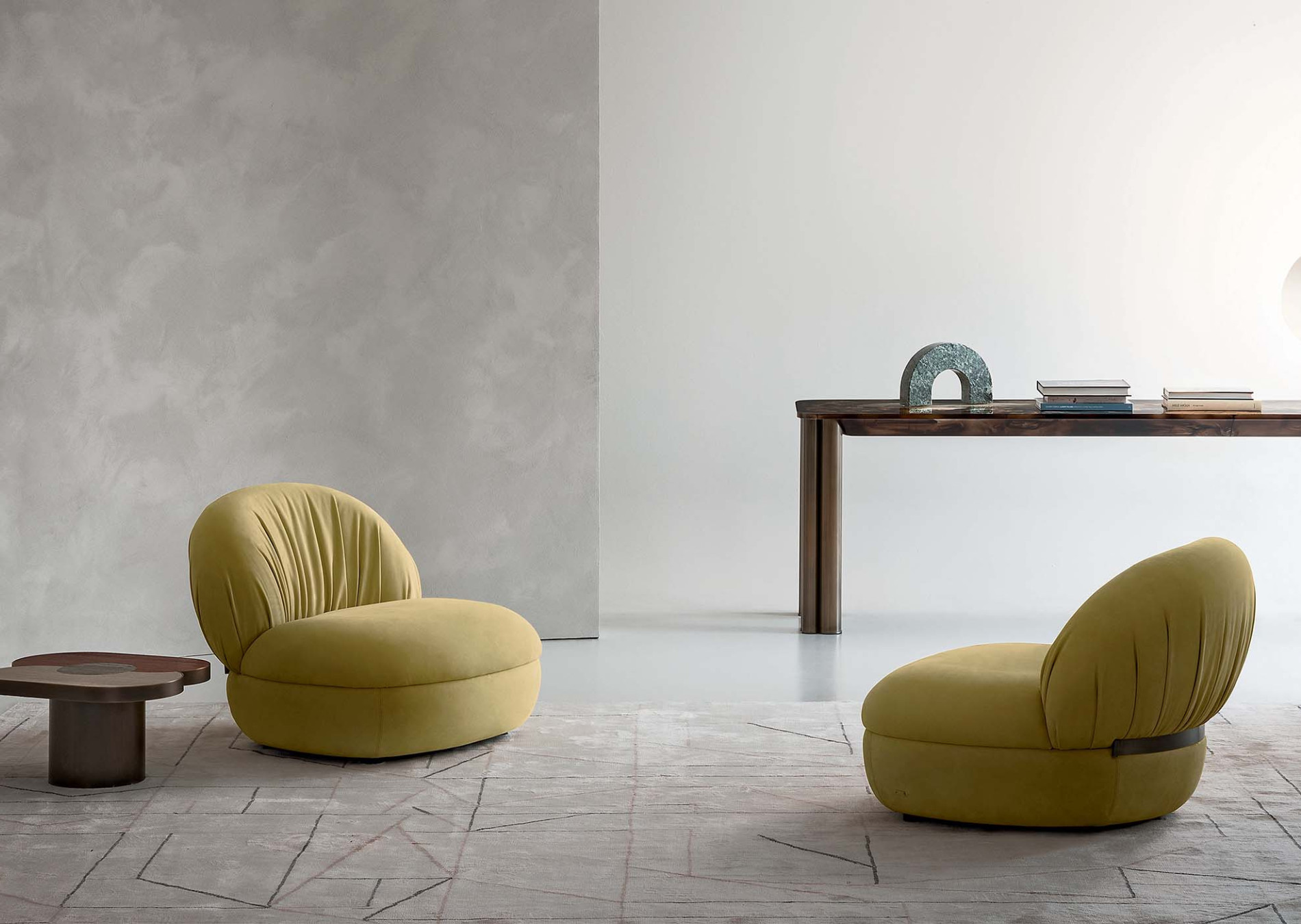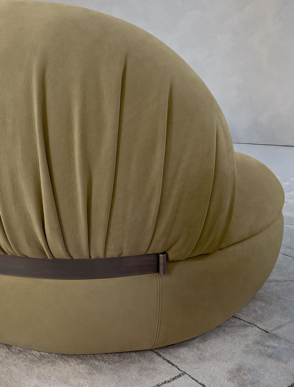 It is covered in precious fabrics or soft leathers, always being itself: a sophisticated armchair, with a refined aesthetic language and enveloping lines, which offers a feeling of great welcome thanks to the padding of the seat and back. The details of the folds given by the abundance of the upholstery and the rear metal band on the backrest contribute even more in making the Fandango armchair unique.