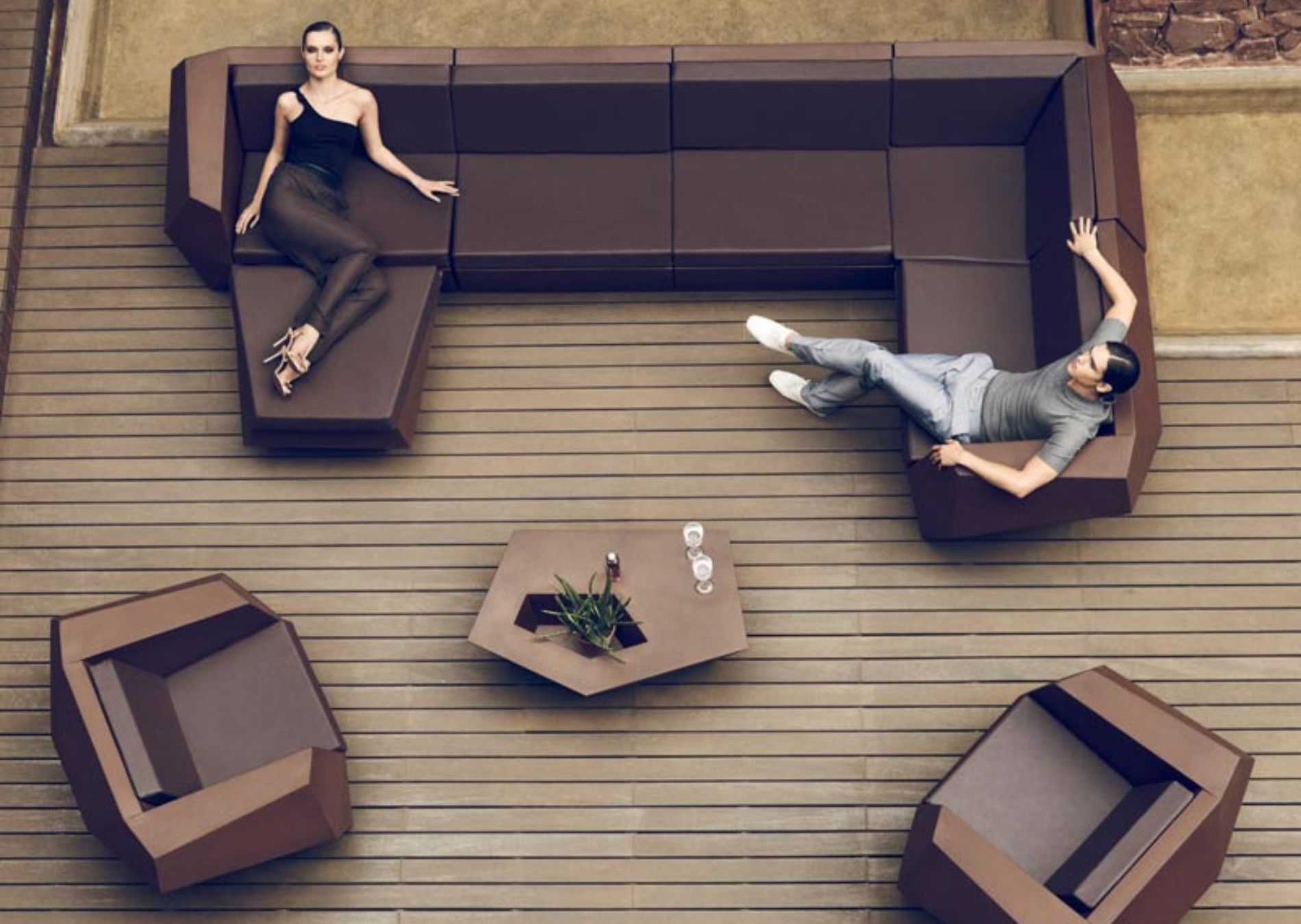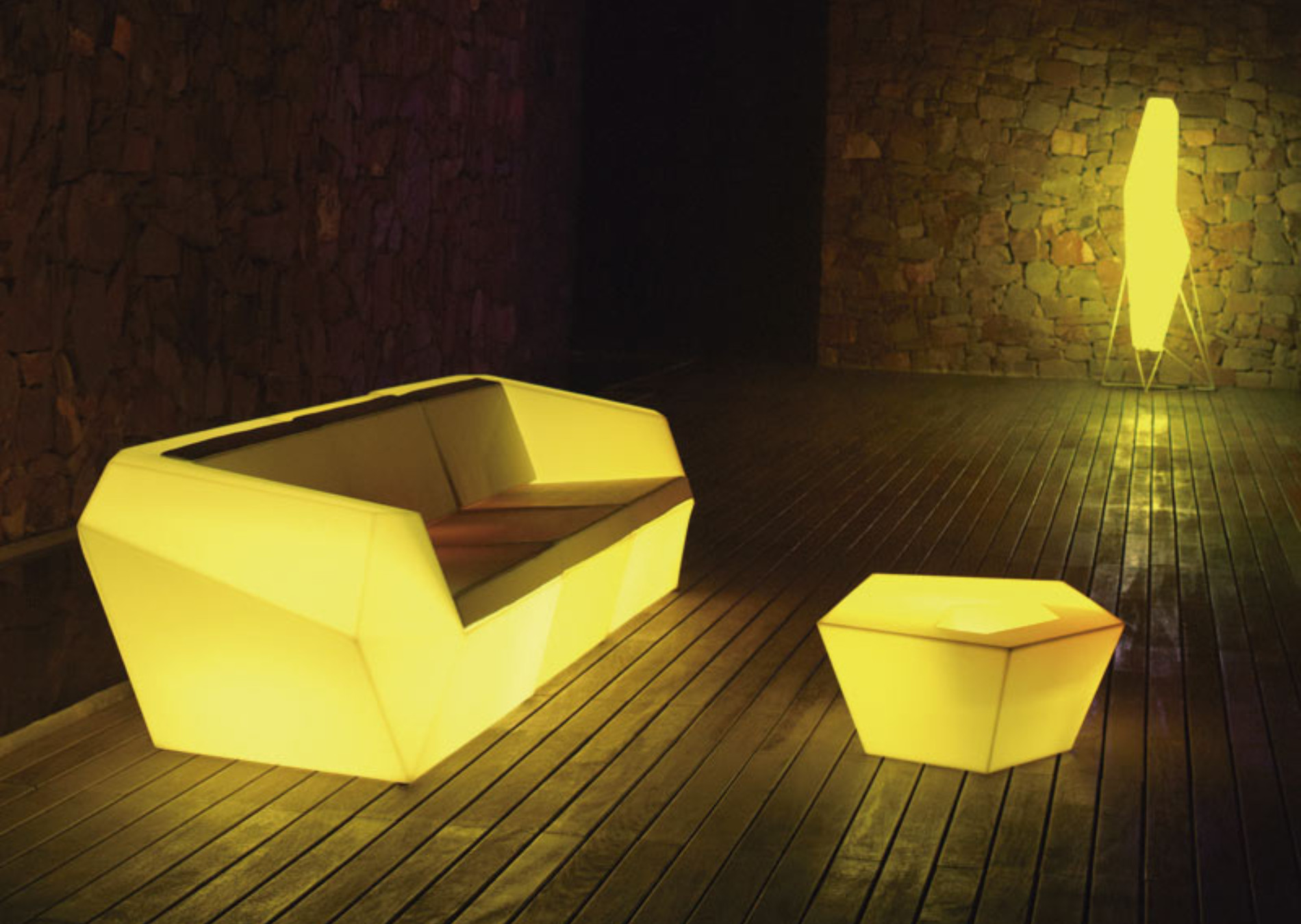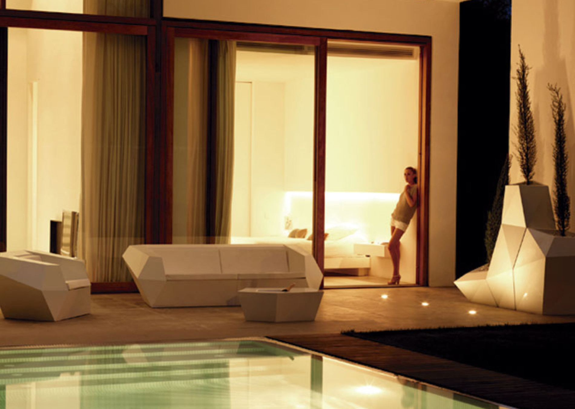 Faz is a modular collection of outdoor furniture and planters designed by Ramón Esteve for Vondom. He is the architect of harmony, serenity, timelessness and universality, and he has created mineral and emphatic shapes that make Faz a design that contextualizes with homes and installations. An ambience, encircling as a result of the blissful combination of the material and lighting, so that the sole sensation would be its fusion.