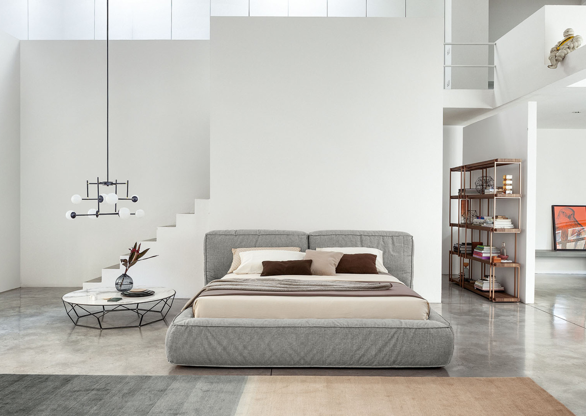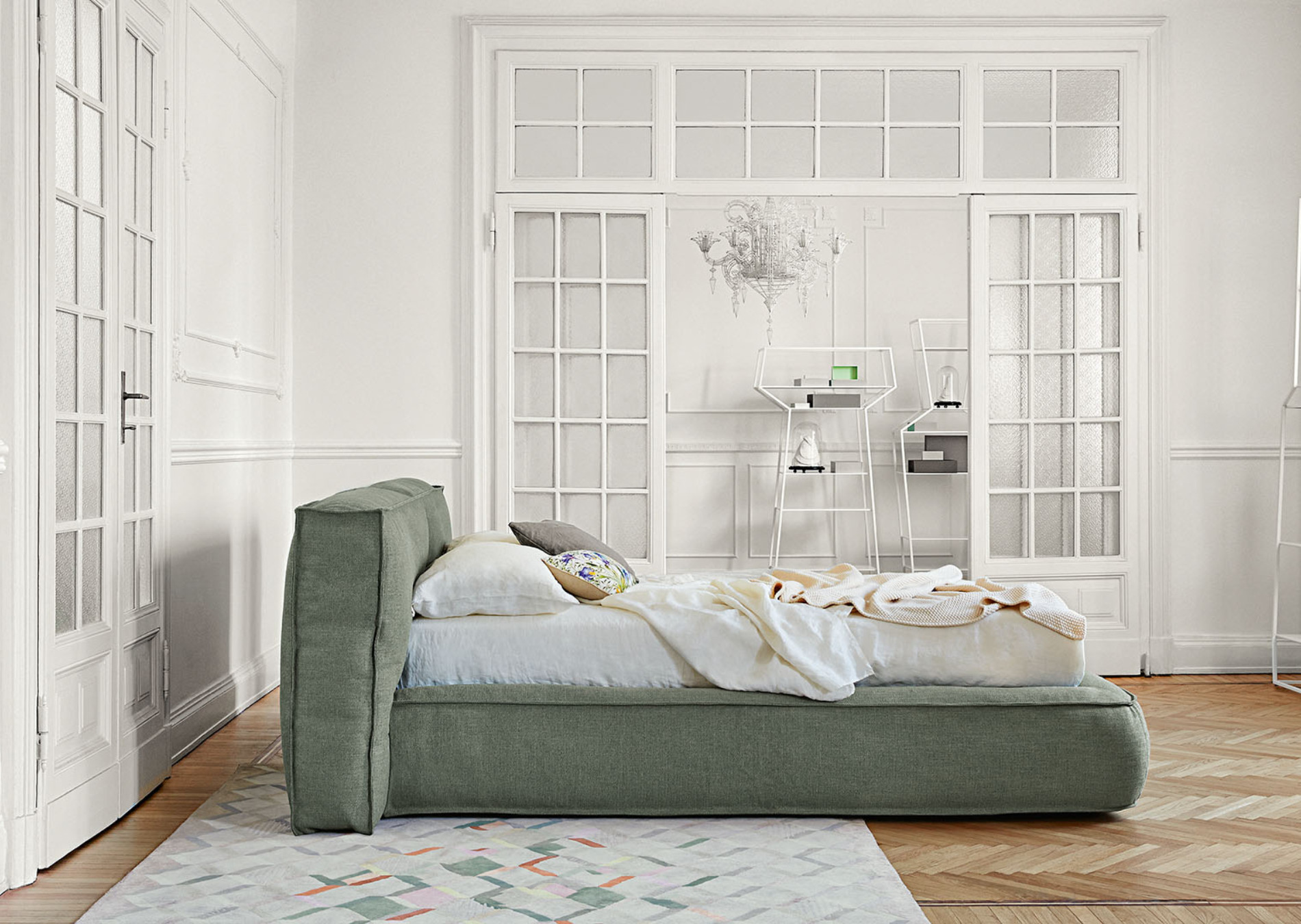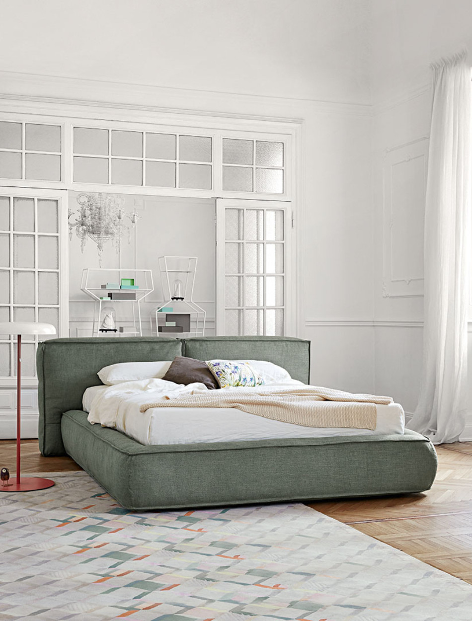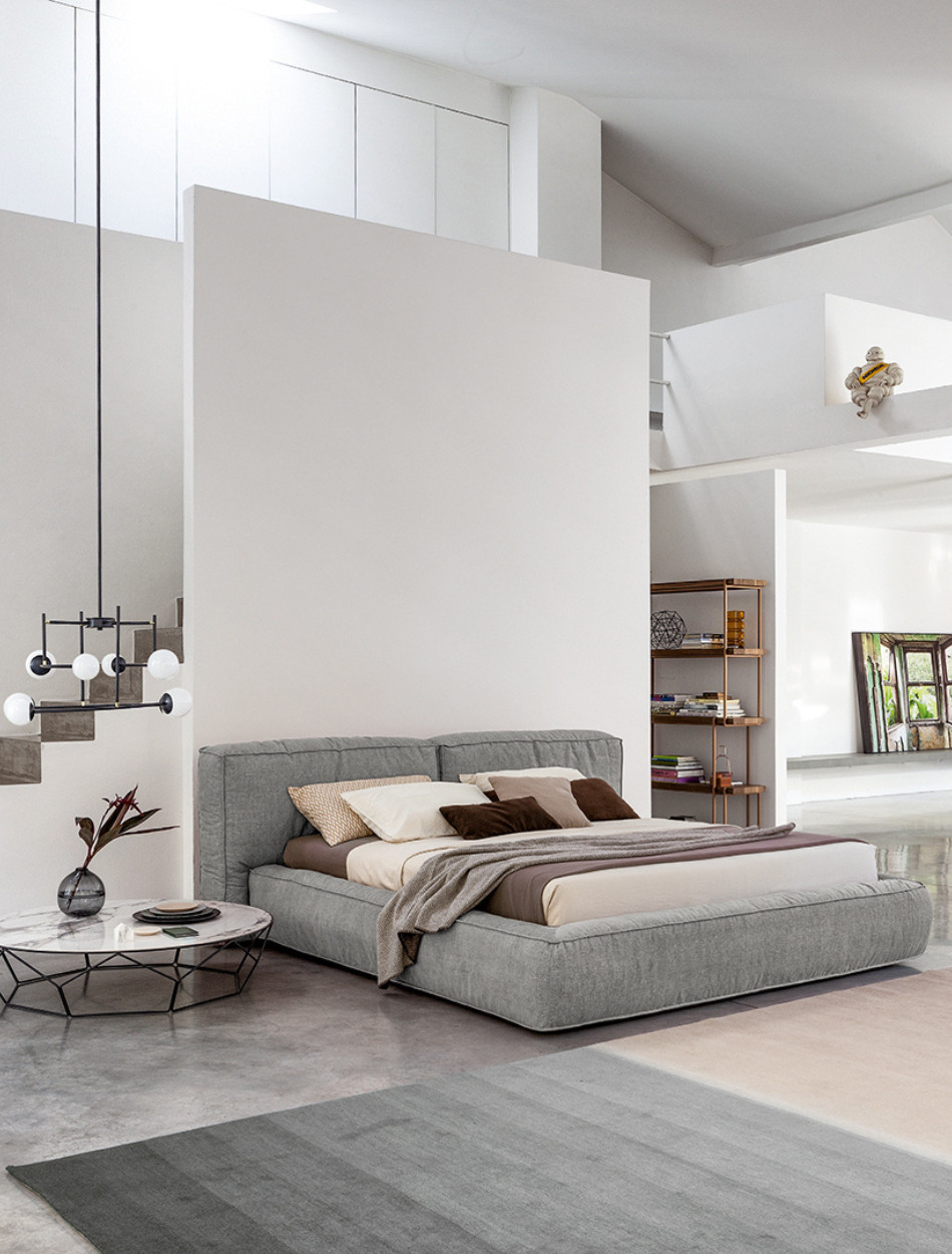 Fluff is a double bed with a soft, rounded design, inspired by the “Fluffernutter” sandwich, an American delicacy of marshmallows and peanut butter. The softness of the headboard and the bed frame is obtained through the padding, which puts the accent on visual and physical sensations and comfort. The generous sizes and comfy forms of this bed make it the absolute centerpiece of the sleeping area and the place for carefree moments of relaxation. The fully removable cover is available in fabric, leather or eco-leather. The Fluff double bed is also available in the “open” version: the practical storage area provides valuable additional space for storing covers, cushions and everything necessary for the bedroom.