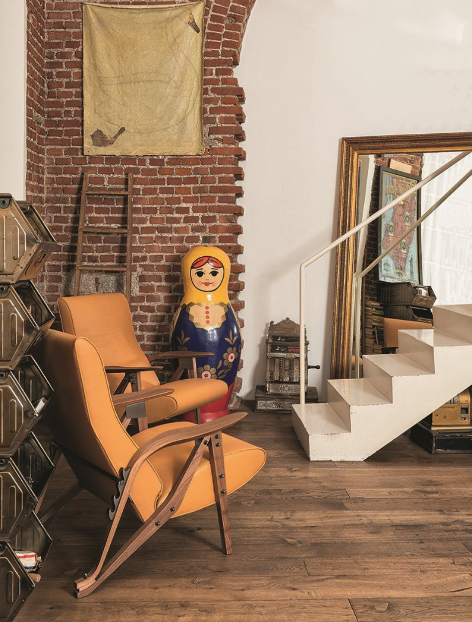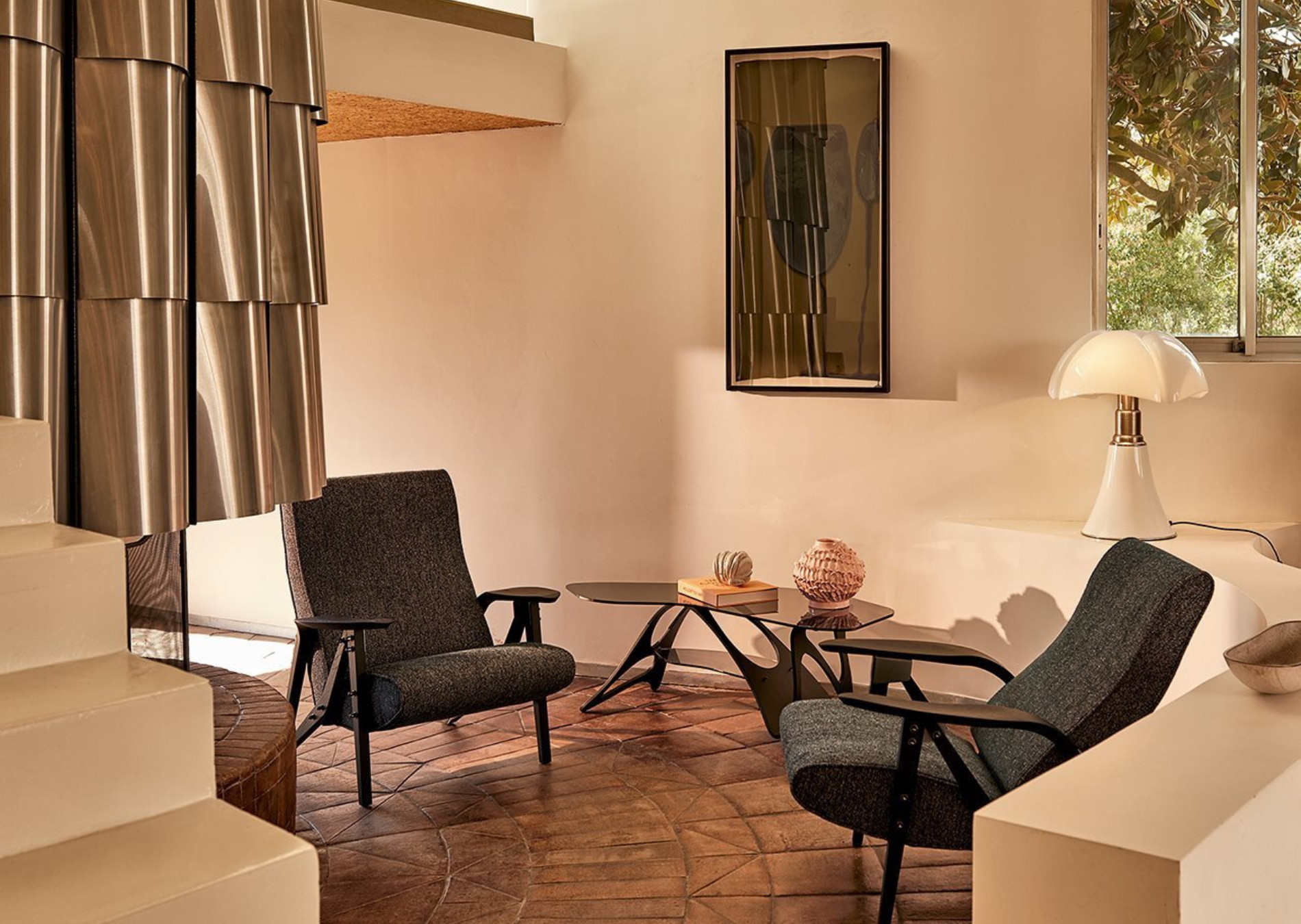 A reclining armchair with four positions, which represents Mollino’s eclectic style, seeking ergonomics and comfort.
