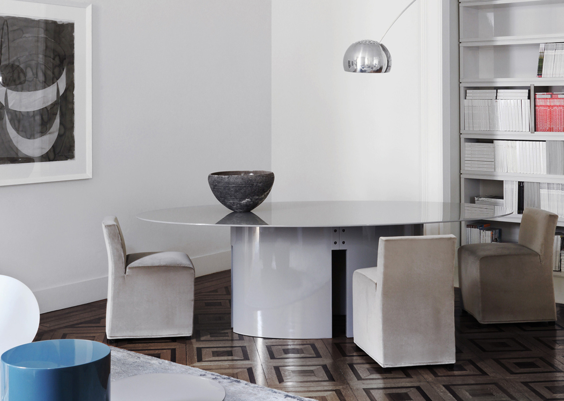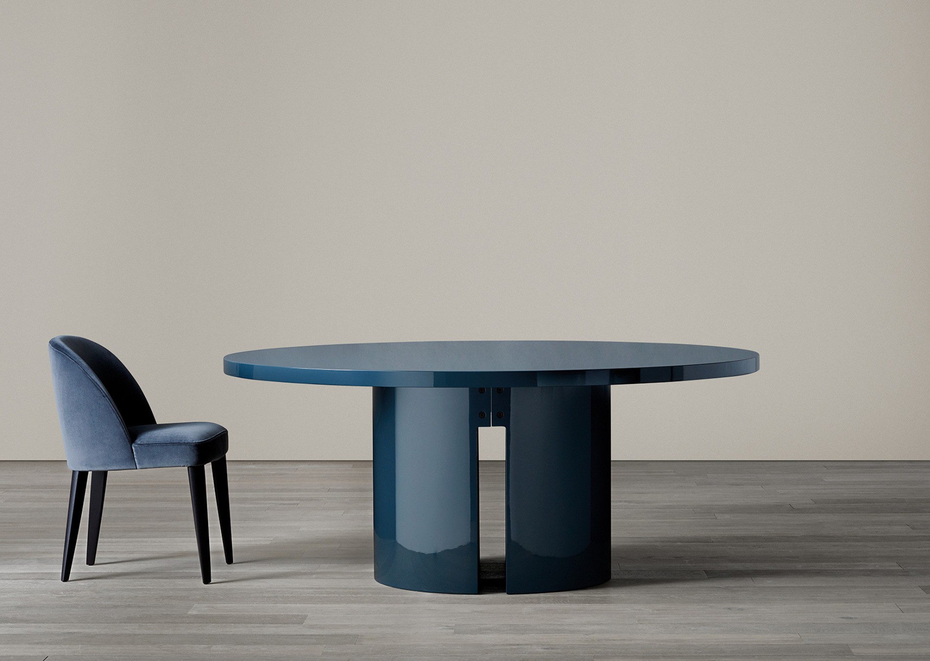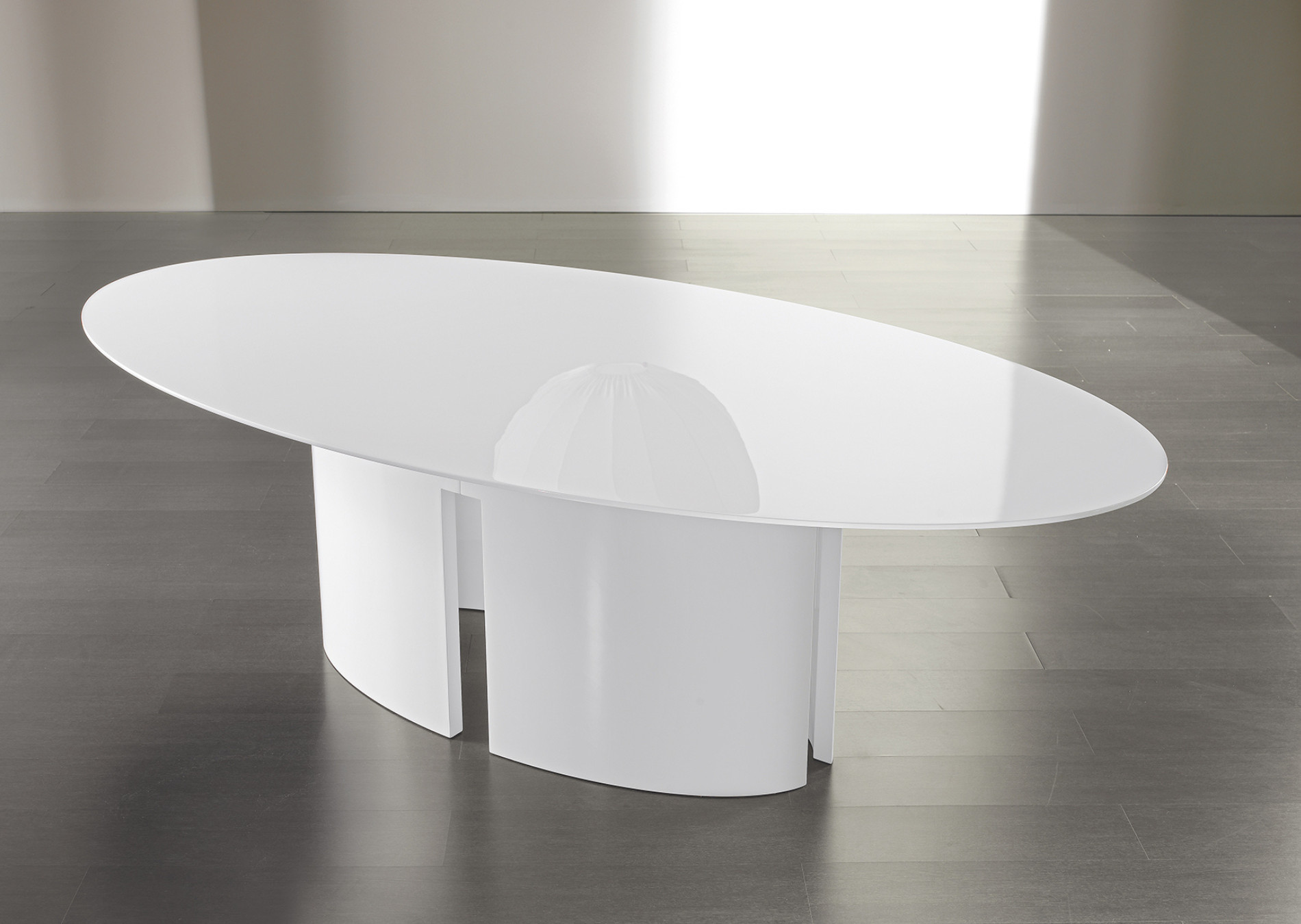 Sculptural table, whose visually striking strength is emphasized by the many available mono-chrome finishes available for the different materials. Gong is available both in the version with a very thick top or with a very thin one with smooth edges. High customization possibilities through the finishes of both the majestic base and the top.