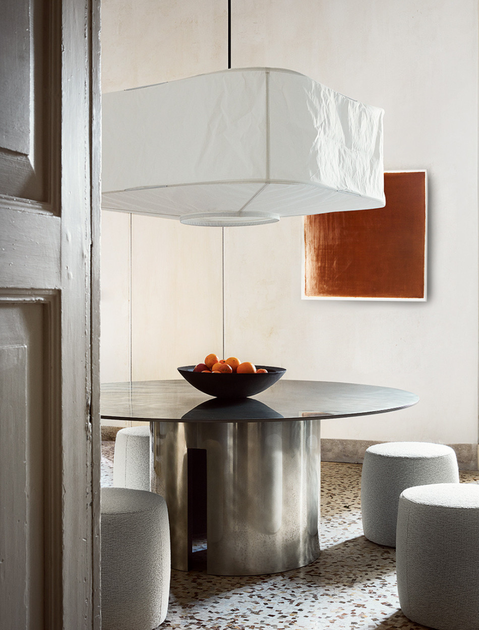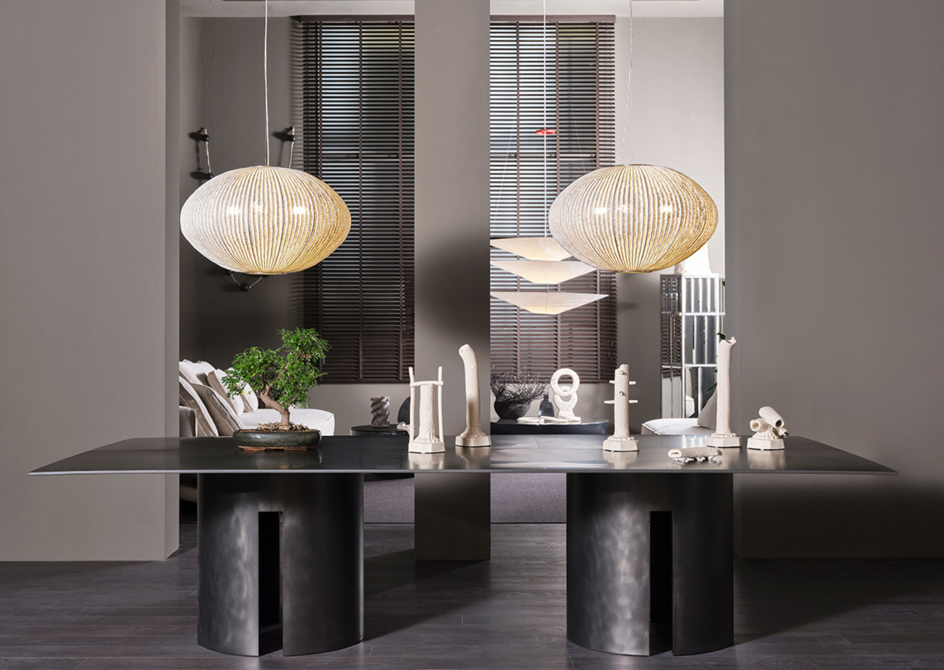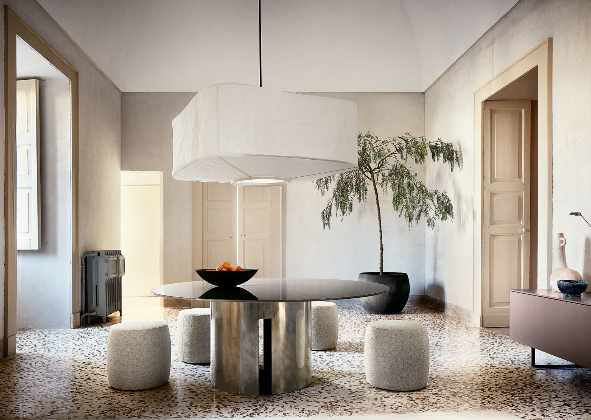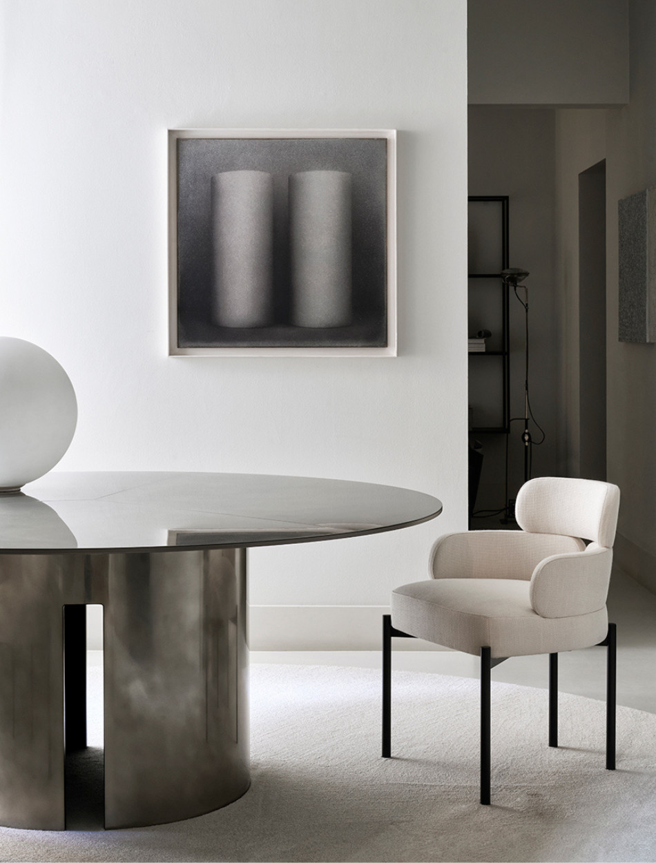 Sculptural table, whose visually striking strength is emphasized by the many available mono-chrome finishes available for the different materials. Gong is available both in the version with a very thick top or with a very thin one with smooth edges. High customization possibilities through the finishes of both the majestic base and the top.