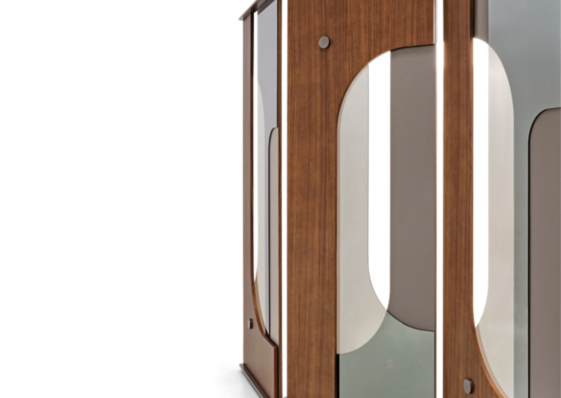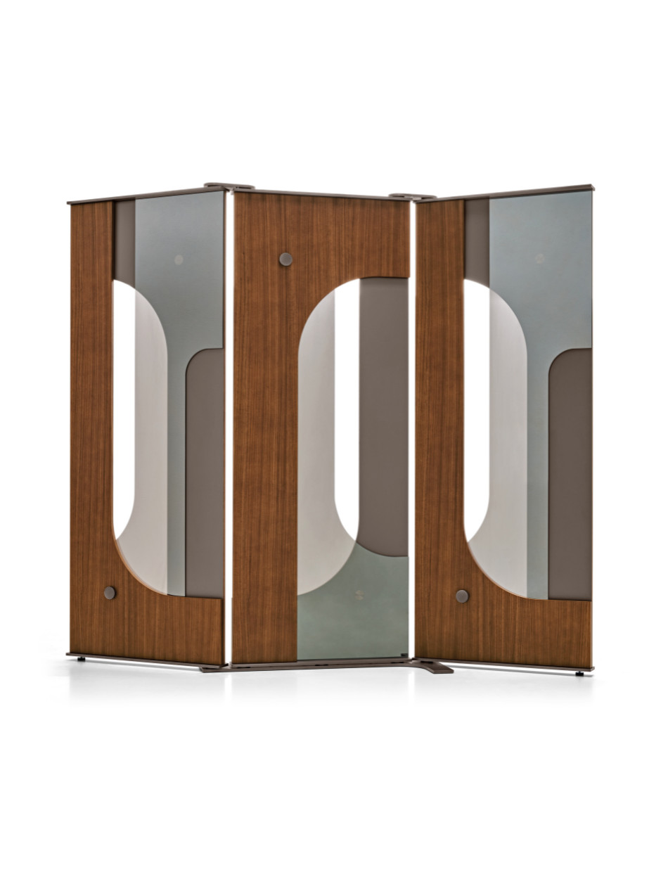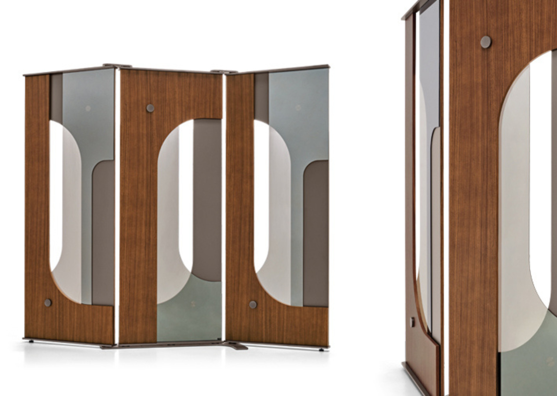 And this is what Gino Carollo has managed to do. In Hide Me, he has created two different types of separation, one from the ground, the other from the ceiling. Each panel is a combination of more materials: zebrano or eucalyptus wood, mirror, varnished wood and metal inserts. By making this obvious contrast, this obvious separation so detailed and yet so measured it reflects our own internal needs and interior acknowledgements.