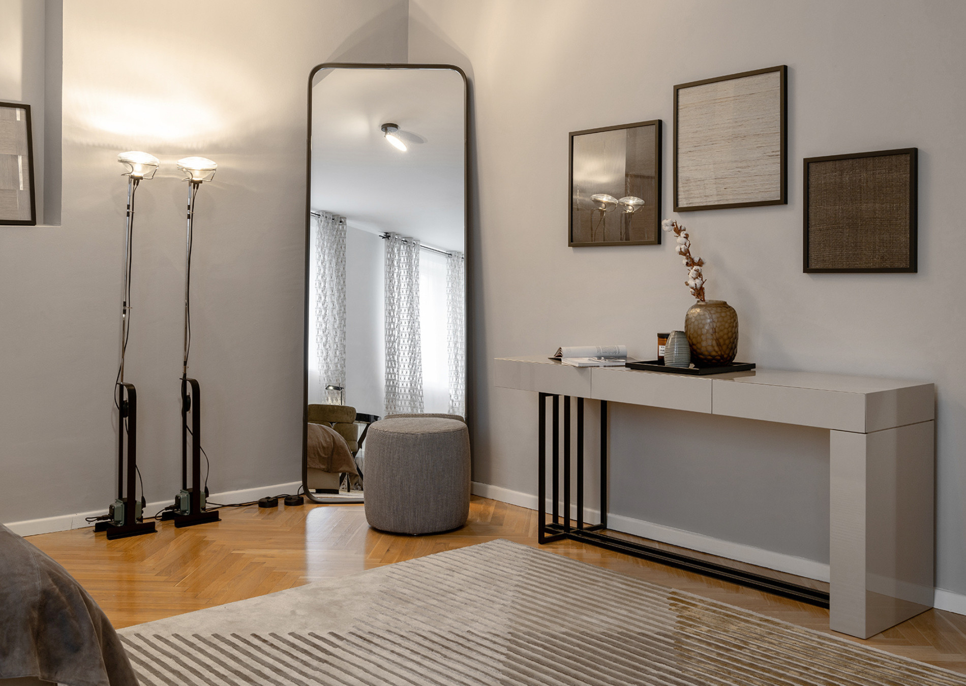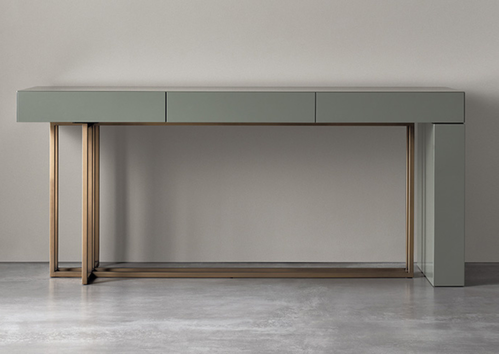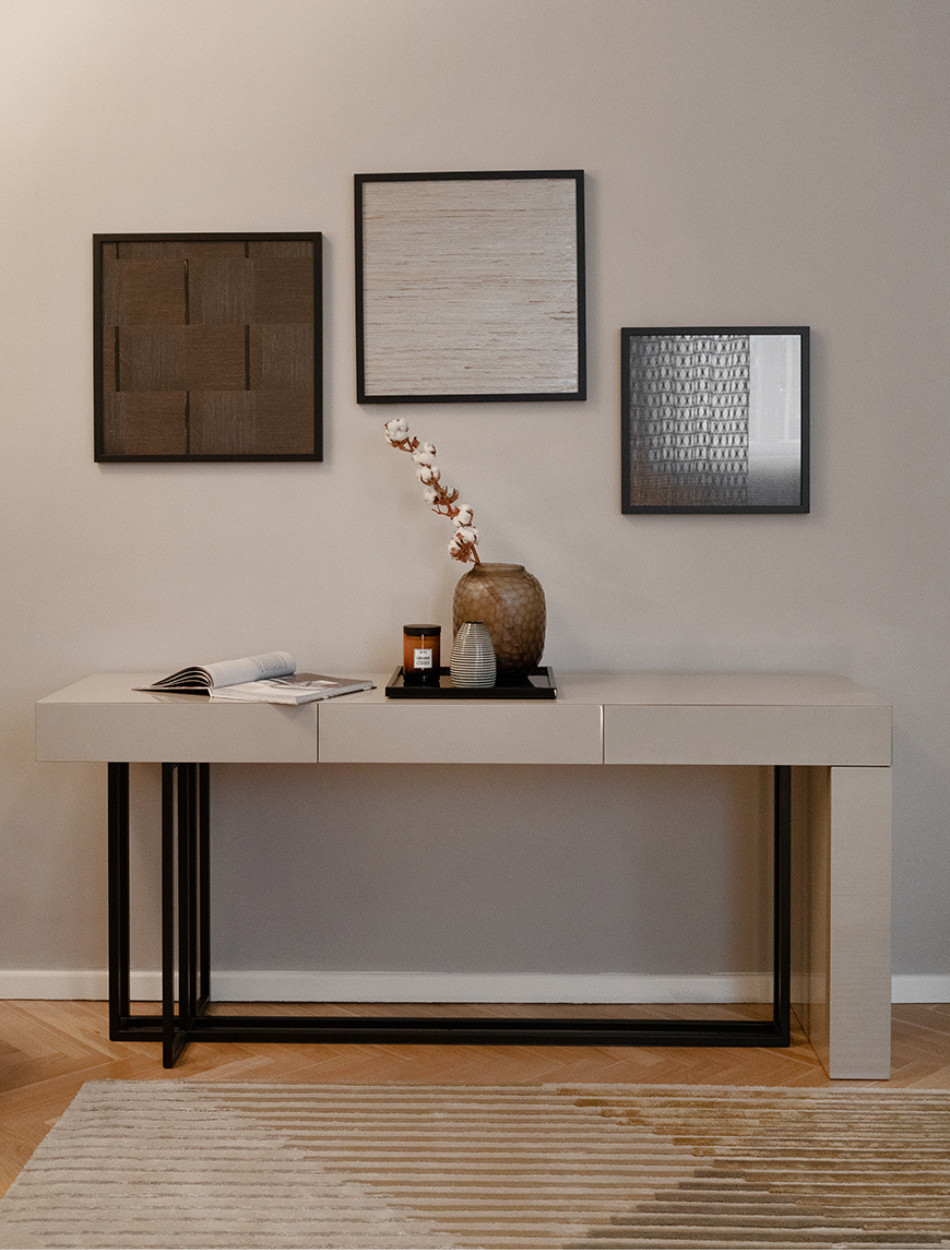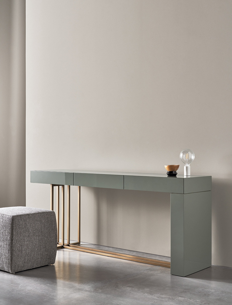 Three drawers console playing a game of balance with full and empty volumes. The combination of different finishes for the metal base, the top and the wooden or lacquered side emphasize the materiality of the two elements. Quincy strongly defines the atmosphere of every interior.