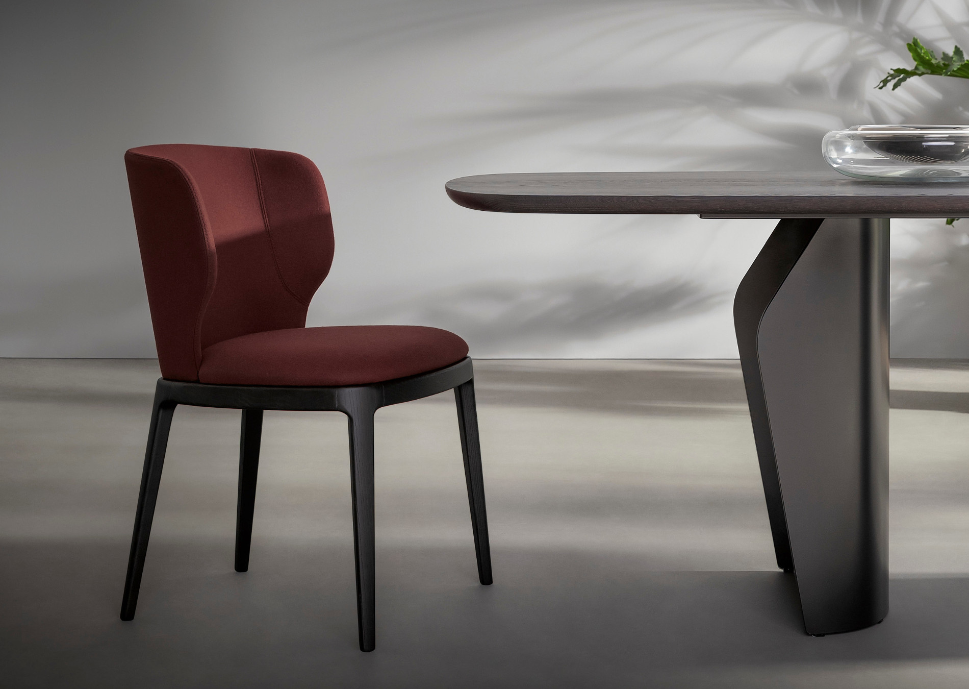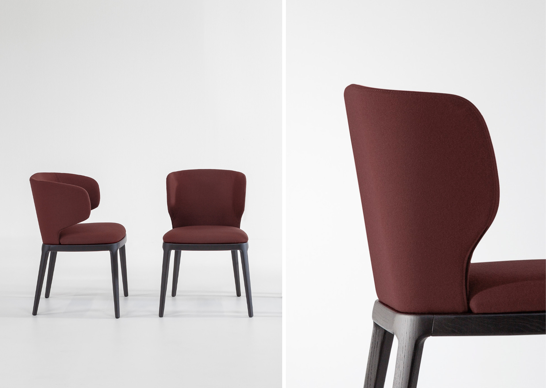 Elegant and cozy, the Joy seating collection embodies a modern design dining chair that seamlessly combines traditional values in a new, contemporary way. The solid wood of the base, a distinctive element that reflects the technical durability of Joy and Miss Joy, contrasts with the soft contours of the enveloping and reassuringly shaped seat and backrest in fabric, eco-leather or leather further enhancing the comfort and style of these modern designer chairs. A collection of sophisticated, comfortable chairs with a strong personality which, partly thanks to the personalized finishes and colours, are perfectly suited to both residential and contract settings.