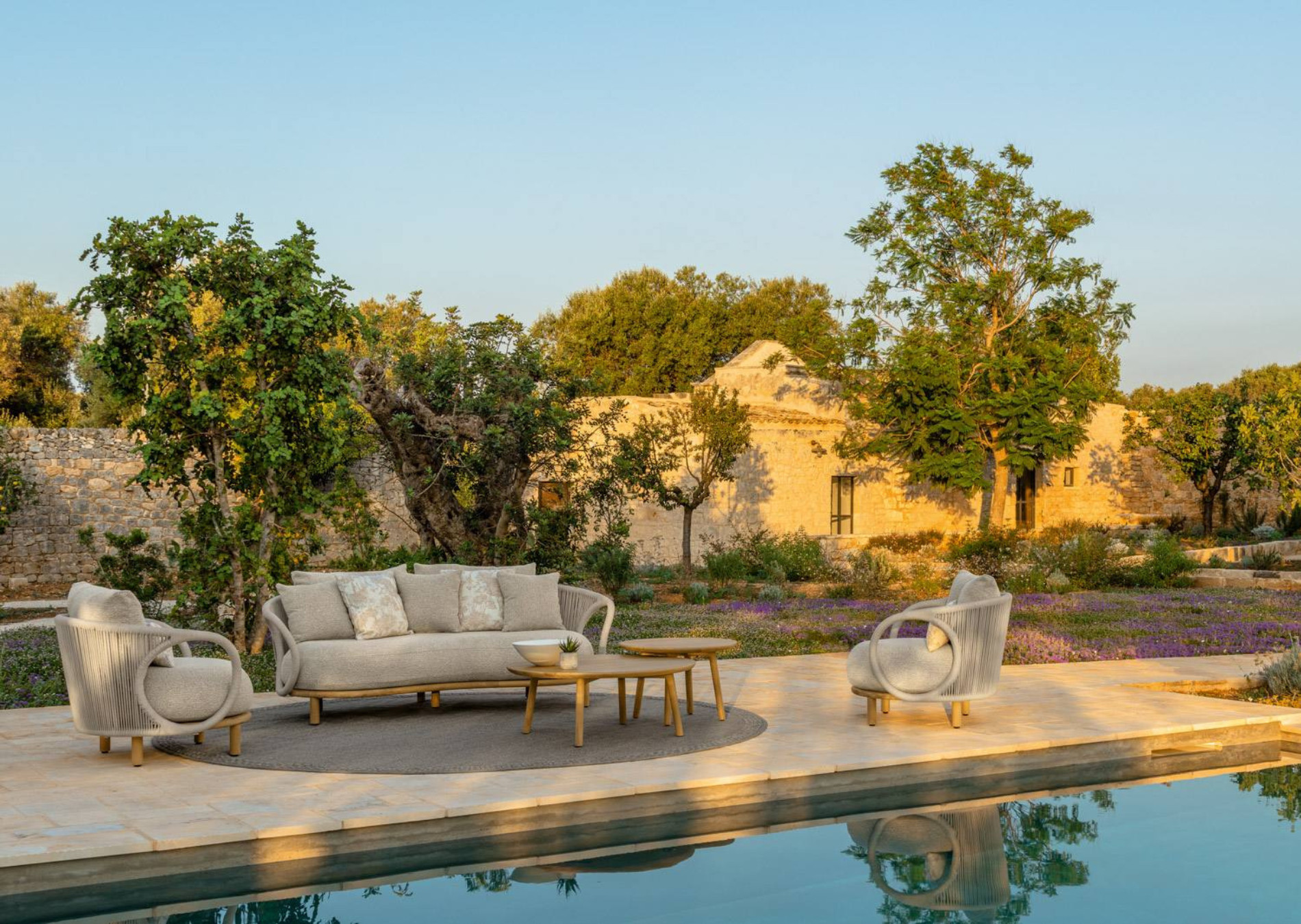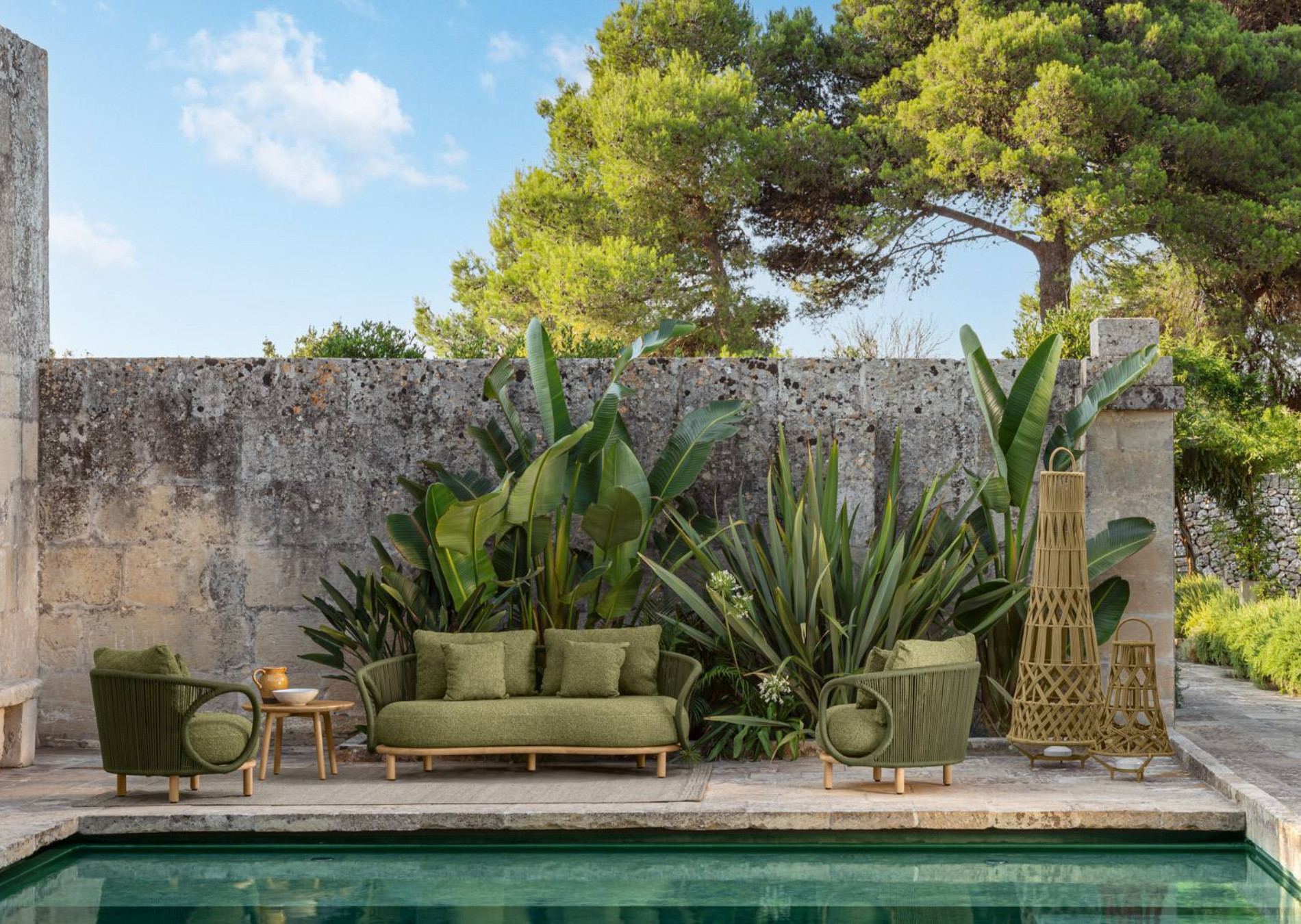The Karen sofa is characterized by a tribal aesthetic that radiates the strength and beauty of African lands. The enveloping shapes and curved lines give the sofa the regality of a throne and at the same time transmit security and serenity, as in a protective cocoon. The fabric weaves that combine the armrests and the backrest, have a craft taste that gives the outdoors style and personality.