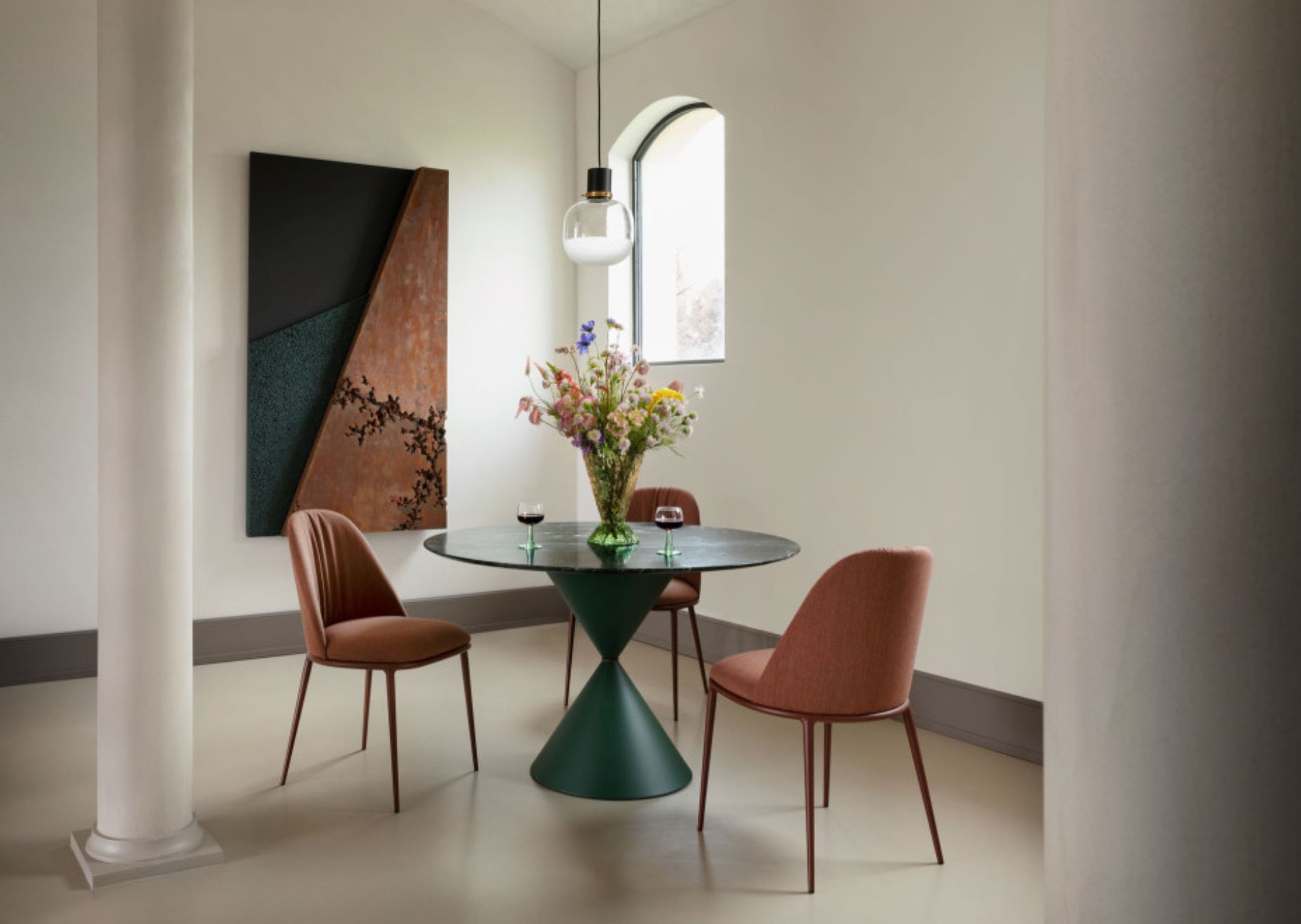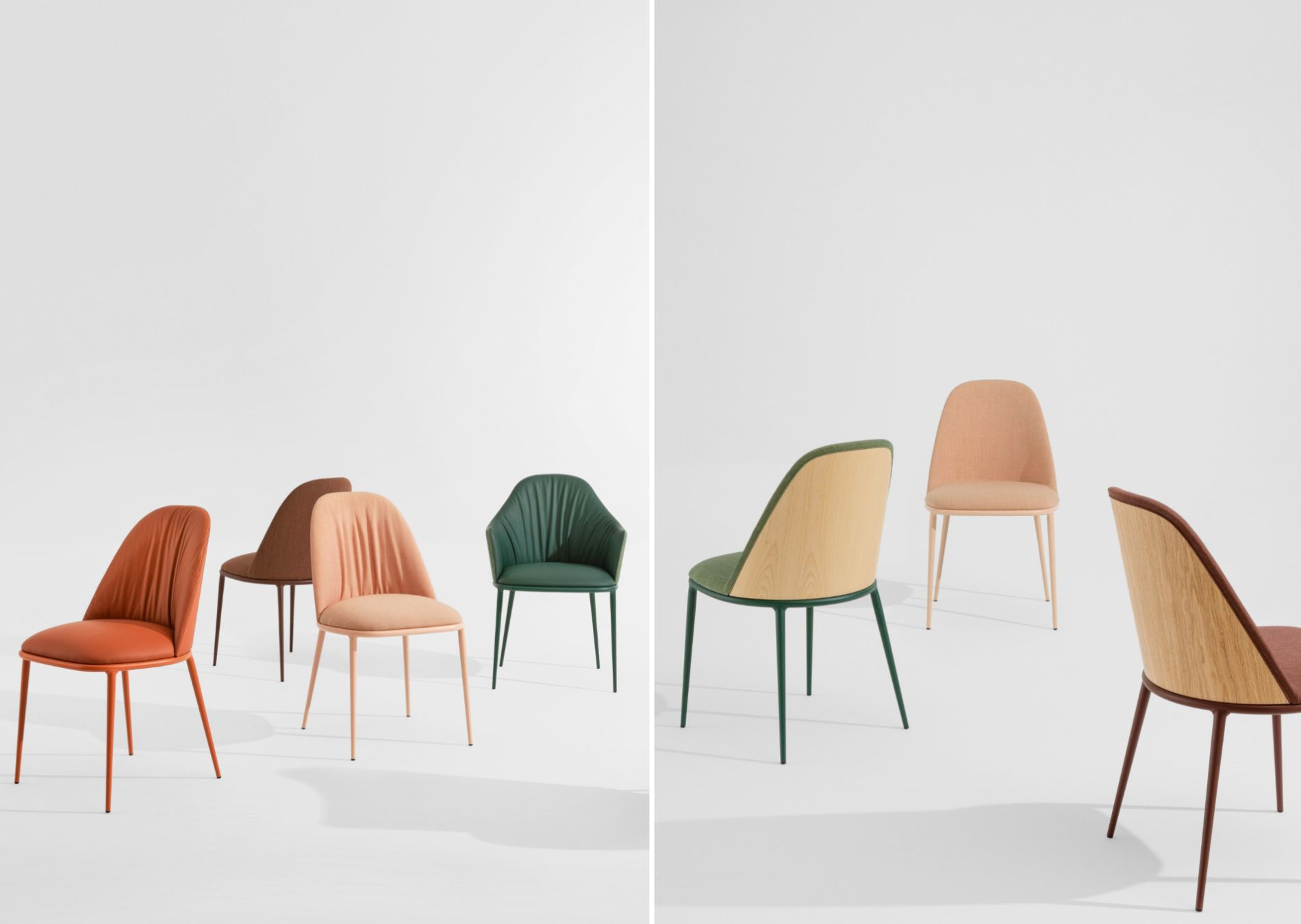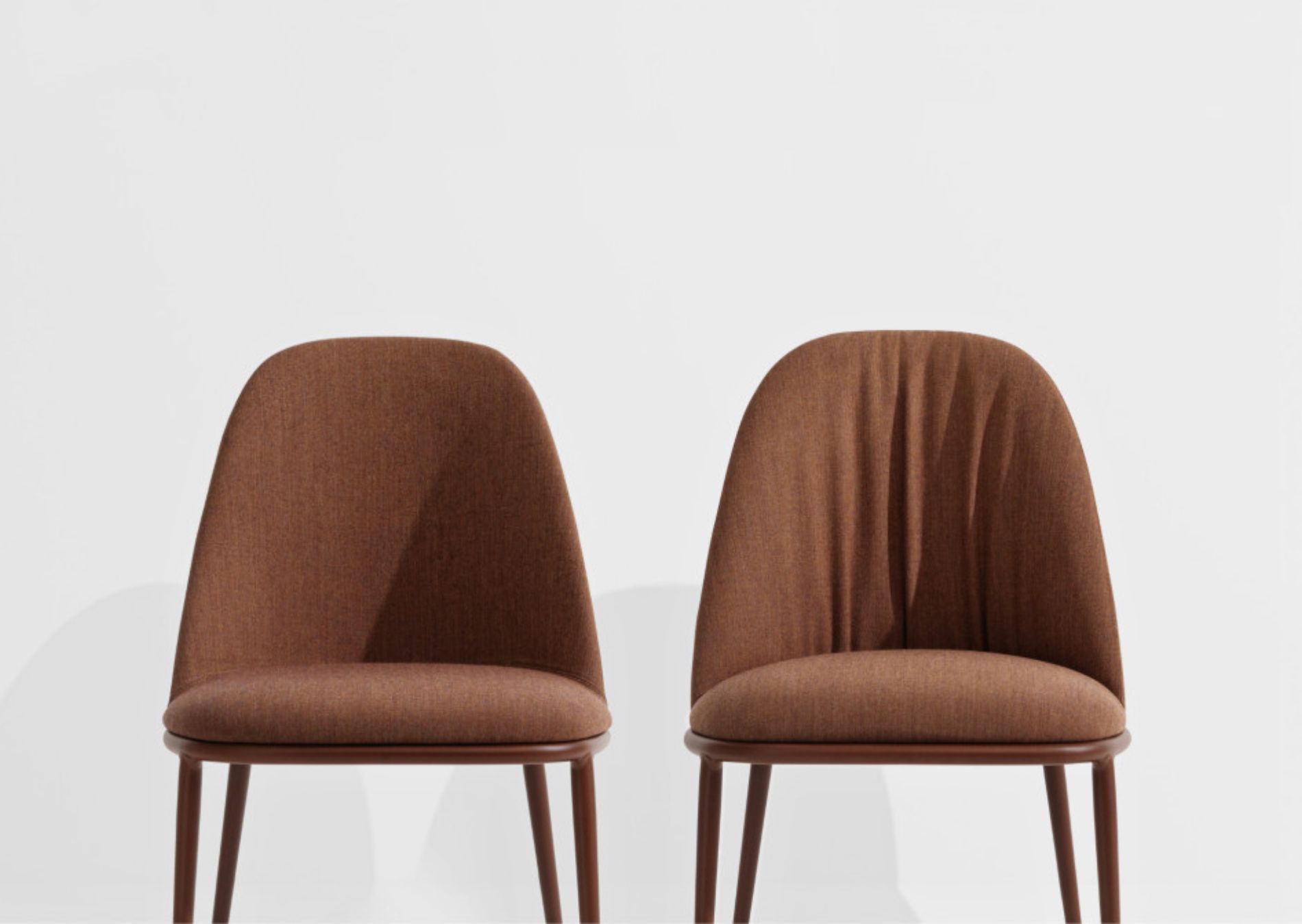 Lea Deluxe chair with four leg base in metal. Seat and backrest upholstered in fabric, leather, or faux leather customizable with different fabric or color for front and back.