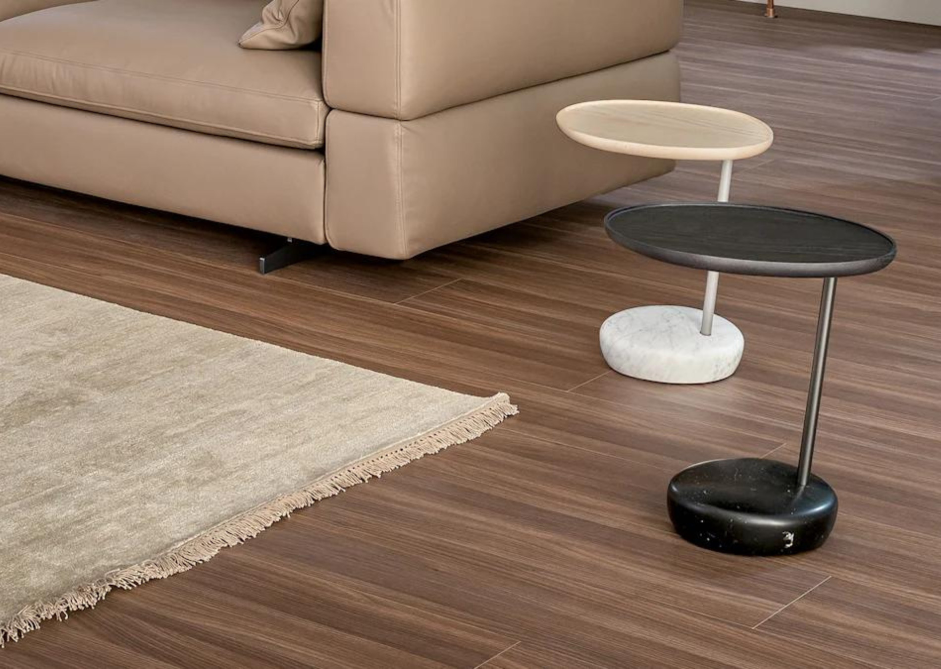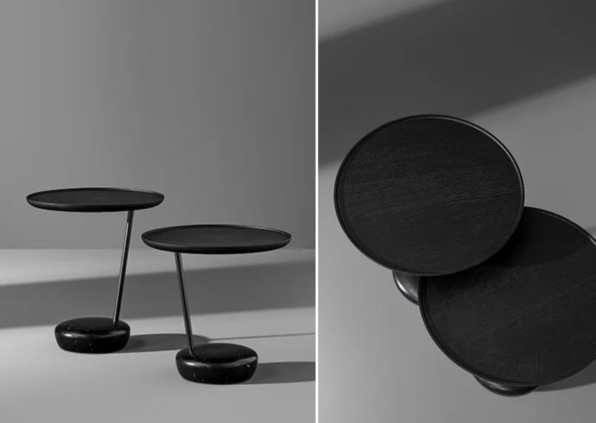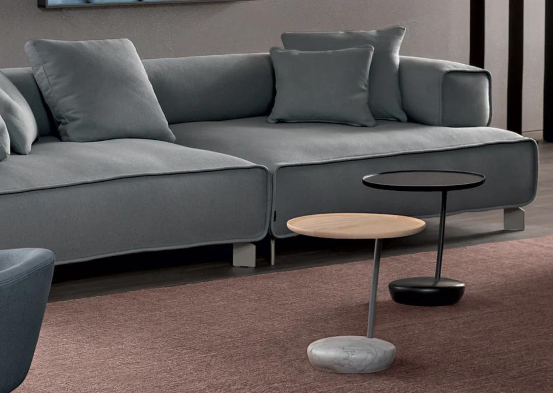 The table tops are made from discs of ash wood, supported by a lead-painted metal pipe. All of this rests on a base in marble or cement, which evokes the solid, stable shape of a rock. The lasting image of the Lupino small modern coffee table is one of asymmetrical contrast between the imposing base, the sleek body and the disc that forms the table top, emphasized by the elegant matching of different materials.