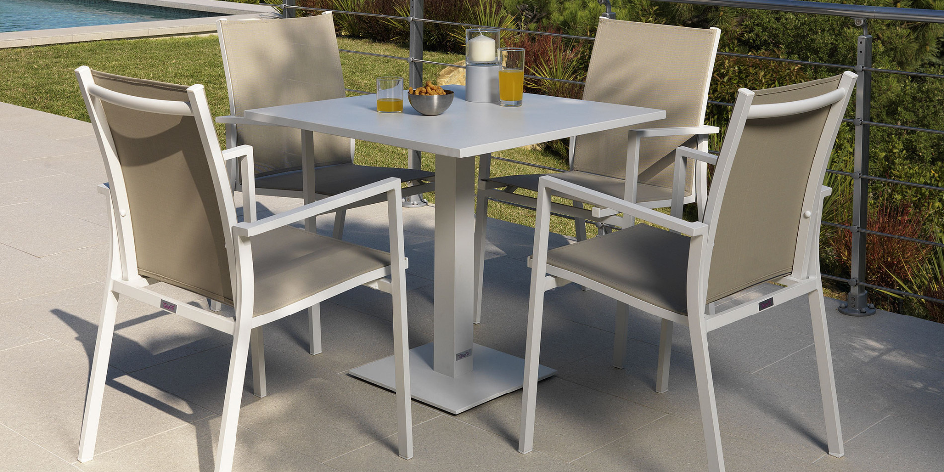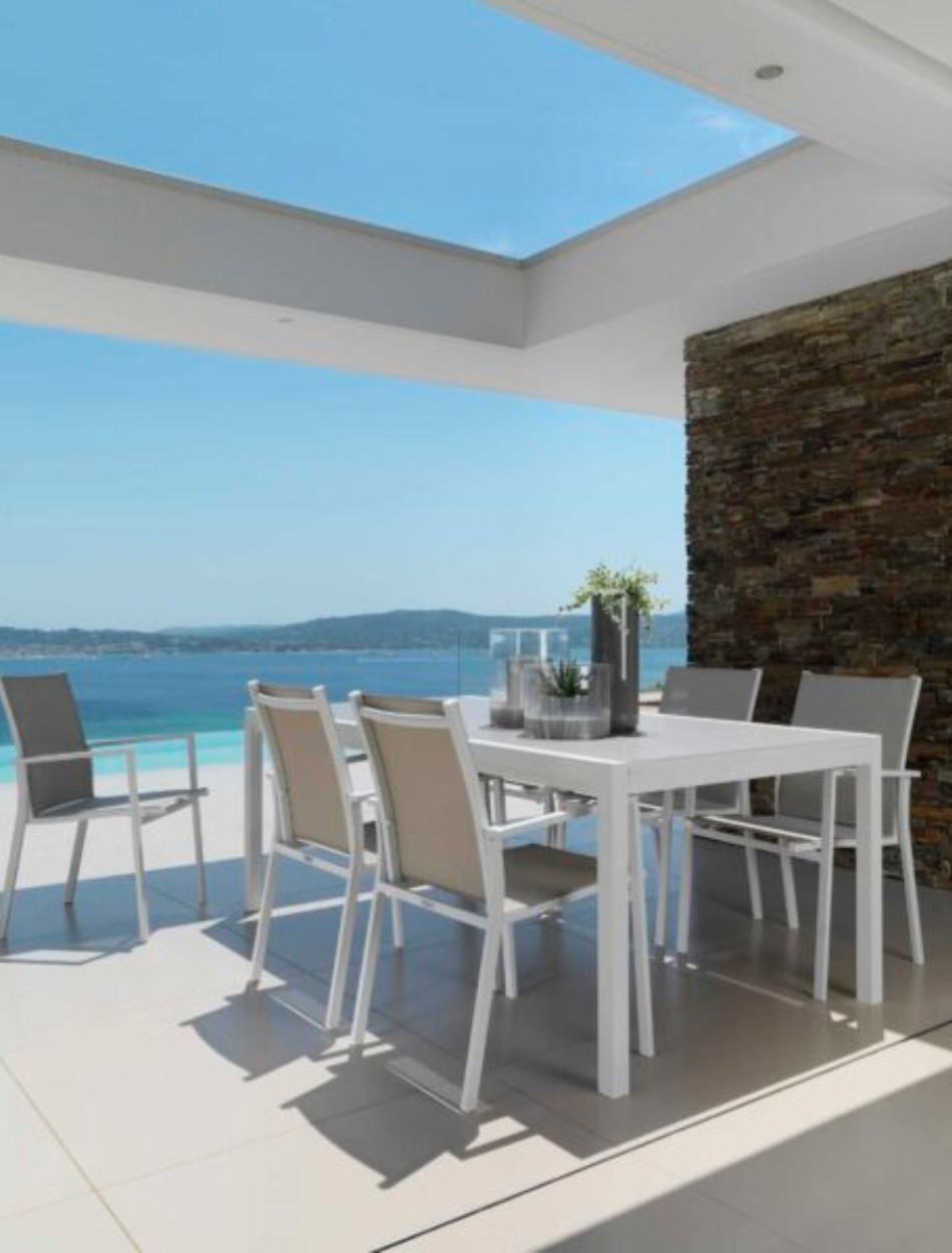 With its large seat and backrest, the Maiorca Armchair is a comfortable, relaxing and functional product. Perfect both in the living and dining area of your outdoor space, the armchair guarantees stability and elegance. The structure, available in two colours (white and dove-grey) is in aluminium, while the seat and backrest, available in three colours (white, mokka, dove-grey), are made of textilene. The stackability of the product makes it comfortable and space saving, even in cold seasons.