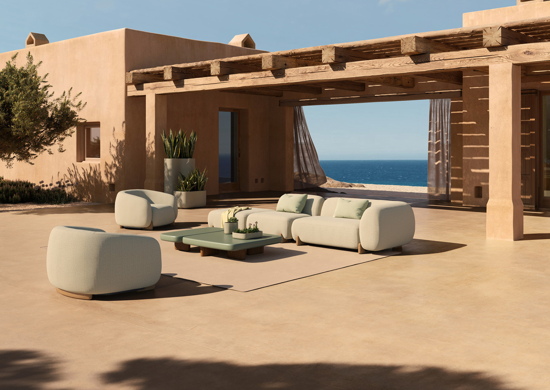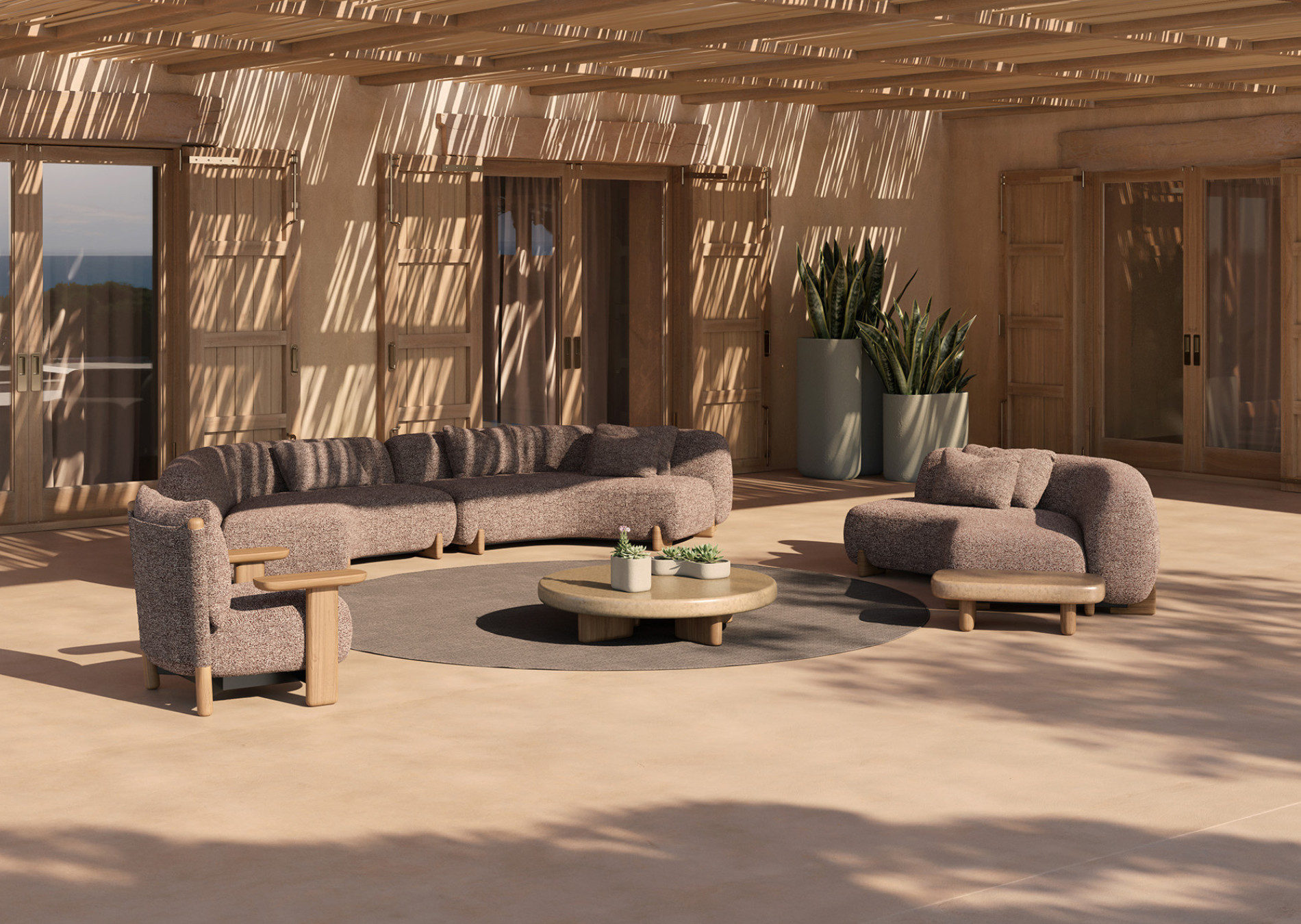 This modular sofa combines the durability of flexible polyurethane foam with the natural beauty of iroko wood. Its design integrates top-quality solutions and materials, especially conceived to withstand outdoor conditions without compromising warmth and comfort.