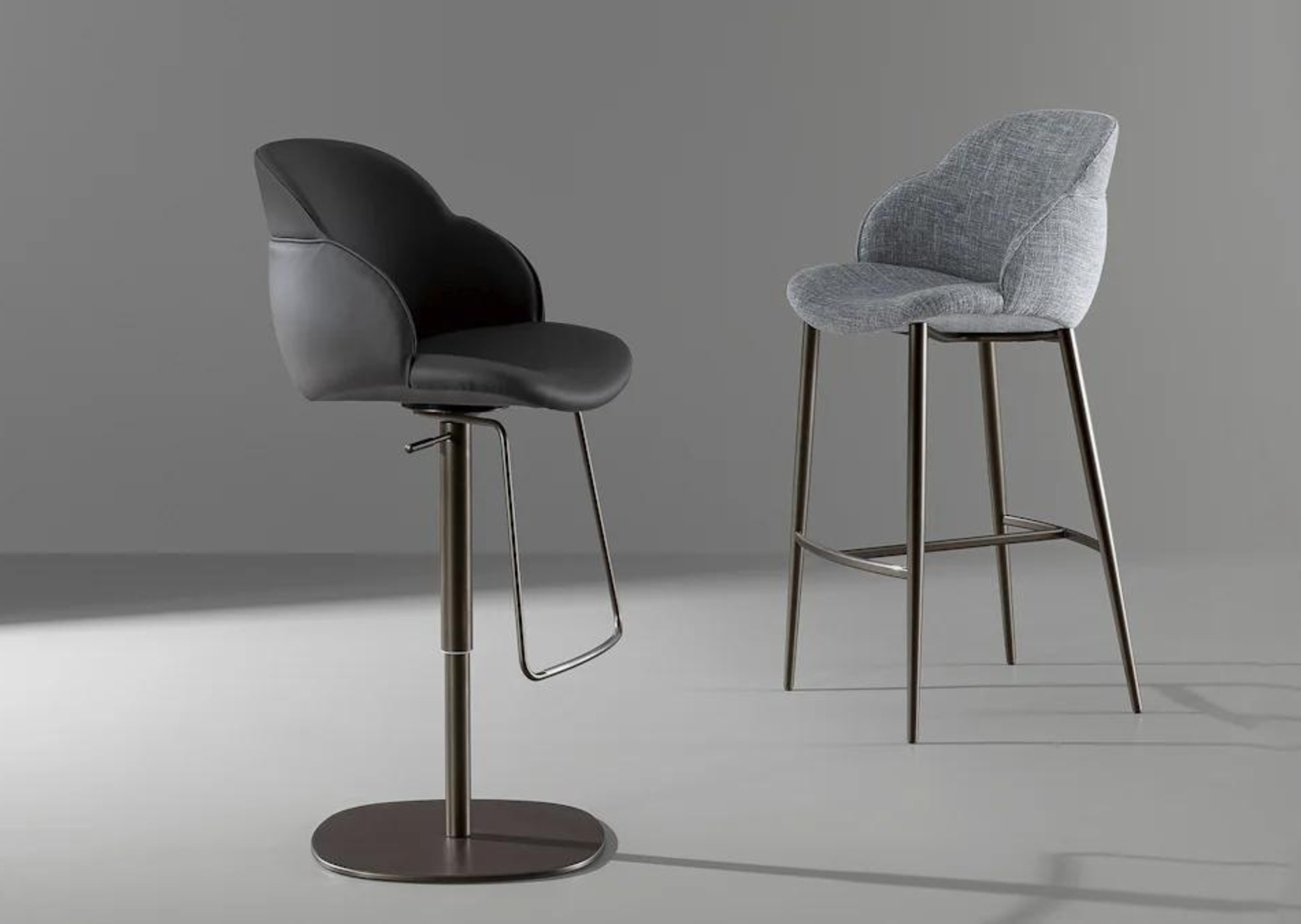 Softness and comfort are the main characteristics of the kitchen stool My way too. An element that catches the attention is the considerable padding of the body that wraps it in a precious shell. The My way too stool is available with fixed or swivel metal base while the seat and back are covered in fabric, eco-leather or leather. The variety of finishes available for the base and for the covering allows ample freedom of customization for a close dialogue with the surrounding environment.