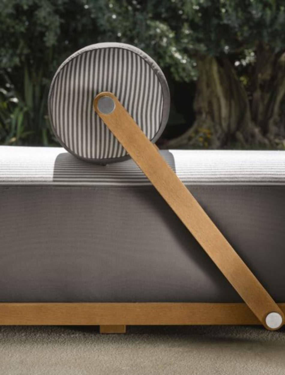 Compact and modern, Nami is the versatile cot that enriches every relaxation space. Thanks to the iconic mobile headrest that turns into an elegant central armrest, it is able to adapt to multiple contexts and situations to ensure maximum comfort. From an aesthetic and functional point of view, Nami is unique. The careful choice of materials, such as teak wood and the design of fabrics make it the protagonist of the outdoor living.