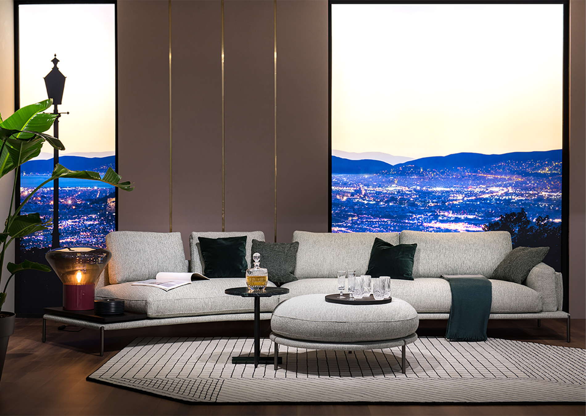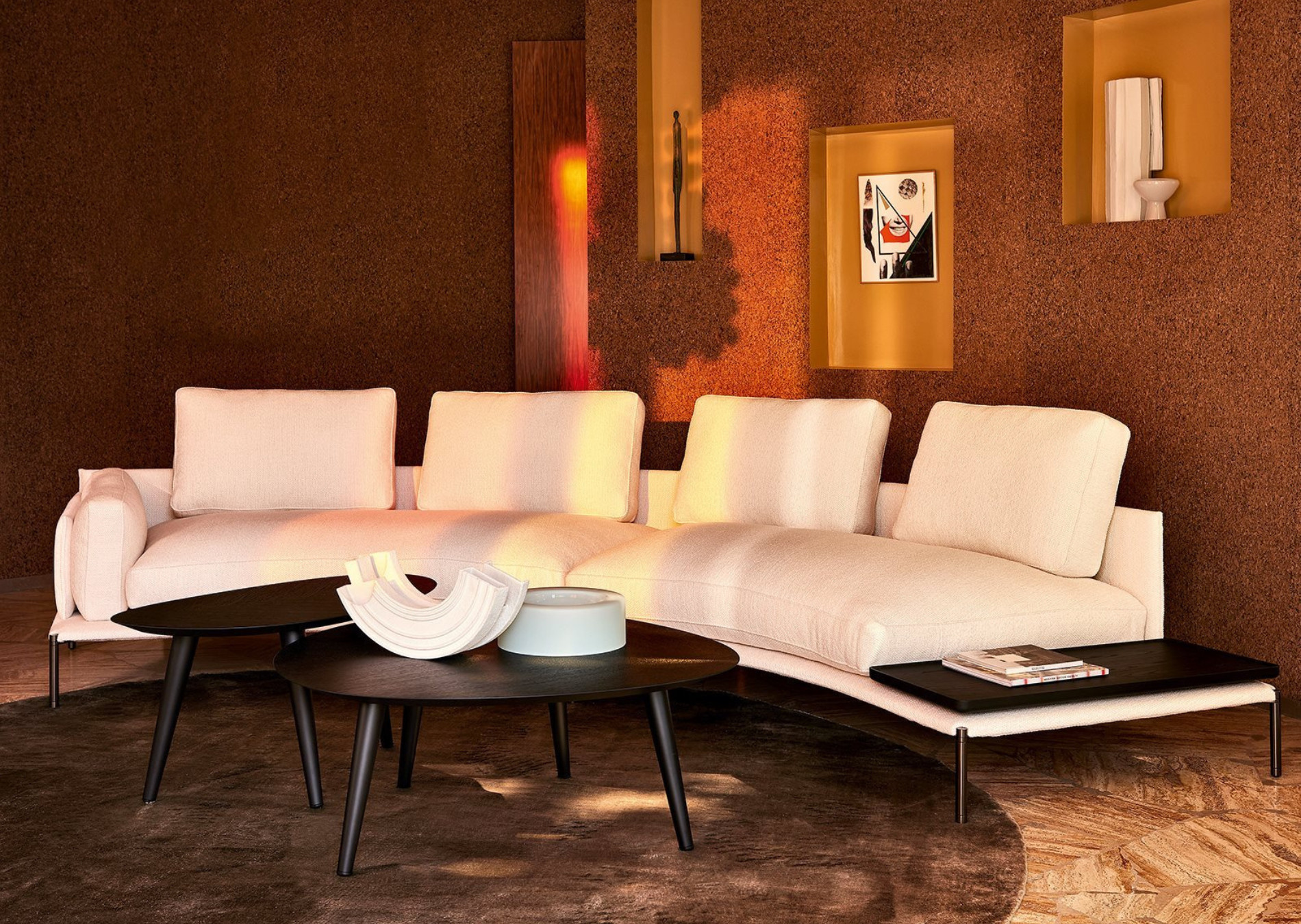 A system of monobloc and modular sofas – linear, angular and curved – with a graphic, elegant and timeless design, defined by well-balanced proportions and compact dimensions to guarantee comfort and furnish large or small spaces with maximum versatility.