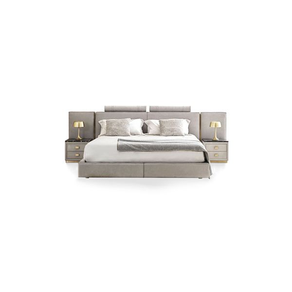 The project features an unusual alternation of upholstered elements that create a vertical overlap of several levels, slightly offset from each other, placed on a slender structural platform with rounded edges and covered in fabric or leather.