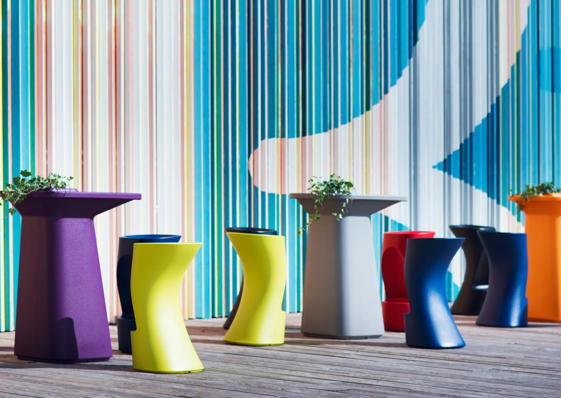 The Noma Collection, designed by Javier Mariscal for the Spanish brand Vondom, is a group of outdoor items. There was an aim to create a new typology of furniture by combining the functions of a flowerpot and an outdoor table, and thus NOMA was born, a collection characterized by its originality and versatile nature.