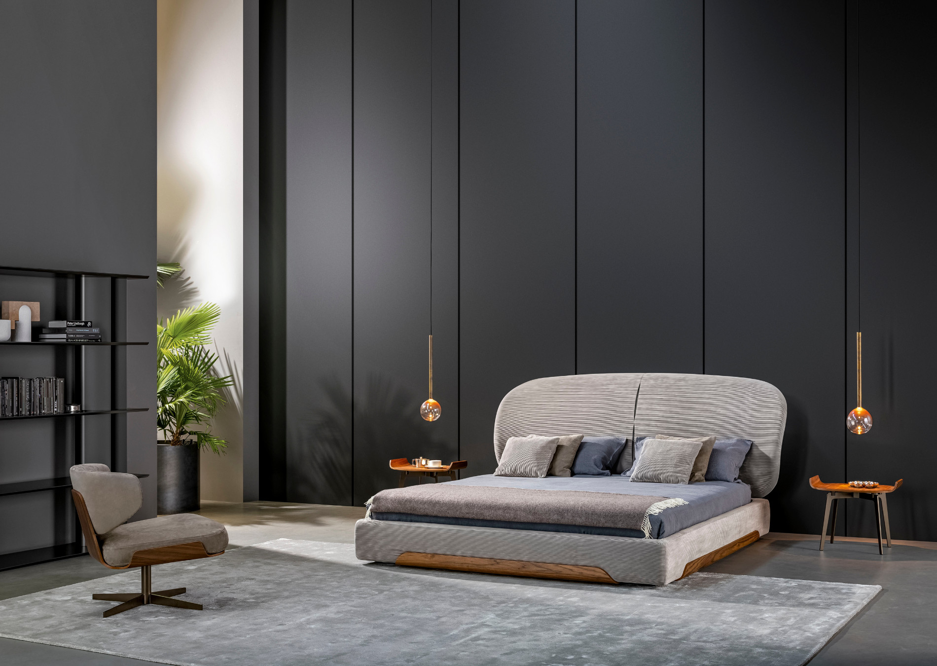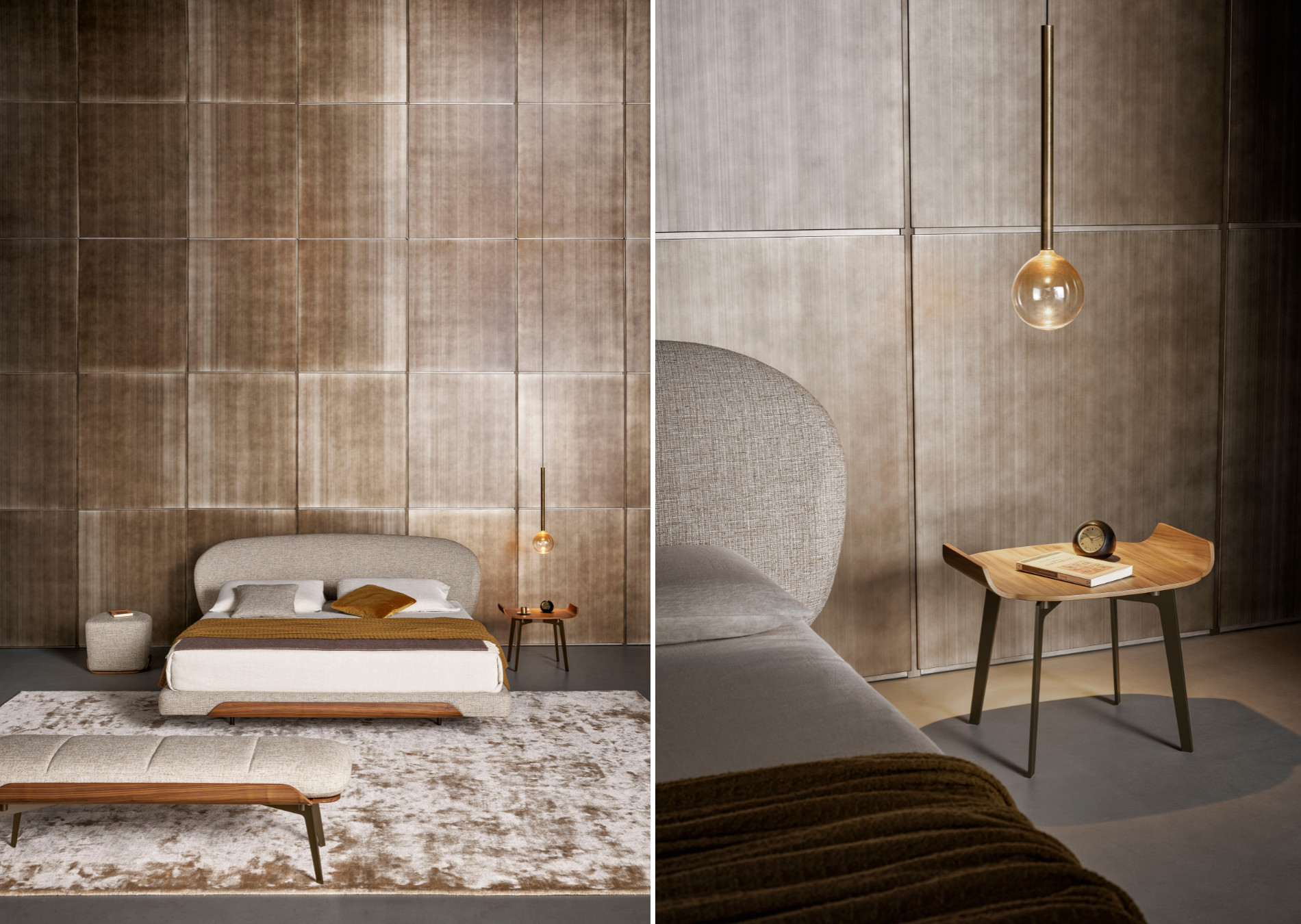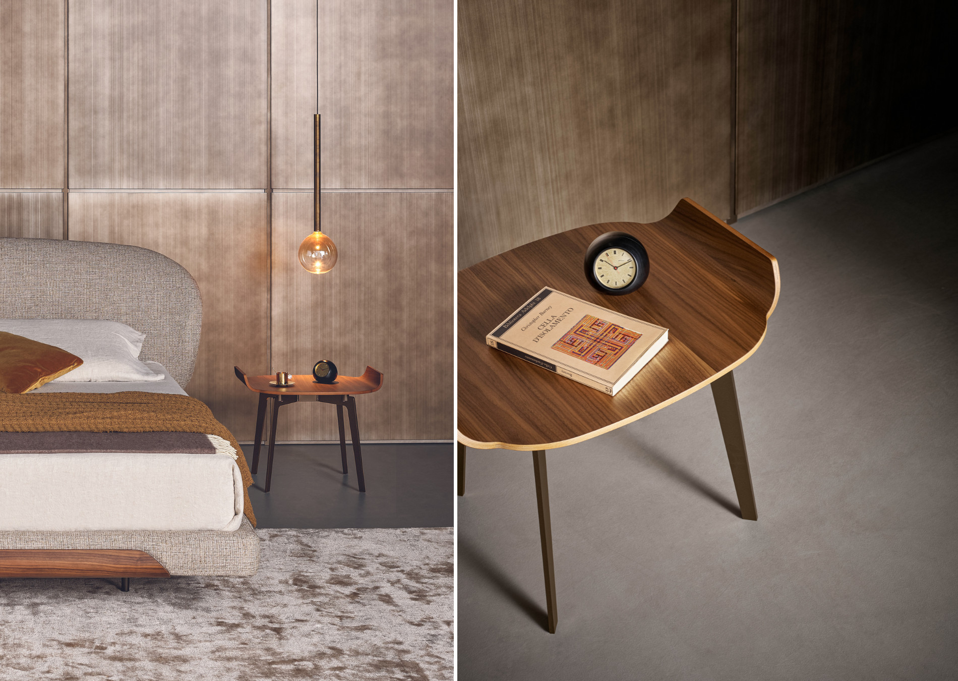 The Olos wooden bedside table continues with the contemporary elegance and purity of form that is the hallmark of the other elements of the collection. In its formal simplicity, the curved wood gives the top of the bedside table a sense of sophistication and lightness while the whole piece is supported by long slender metal legs that raise the top and give character to the outline.