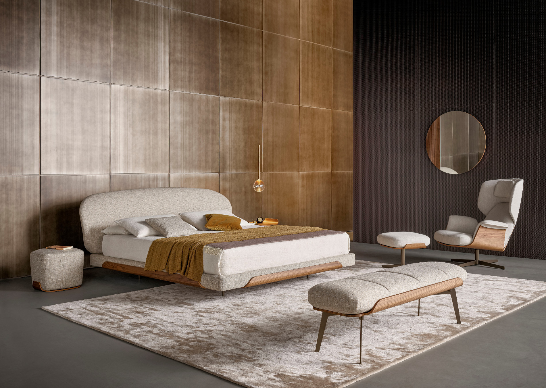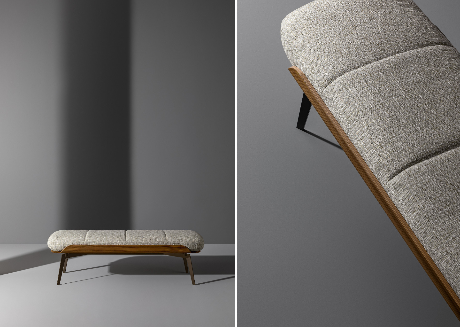 The Olos family also consists of a bench notable for its generous padding, while what really catches the attention is the side detail in curved wood, the common thread that runs through the whole collection and which hints at Nordic inspiration with its sober details and harmony of volumes. The end-of-bed bench for bedroom is supported by slender metal legs that fit discreetly into the overall design. The Olos bench completes the collection designed by Mauro Lipparini for the sleeping area, making it even more comfortable and functional.