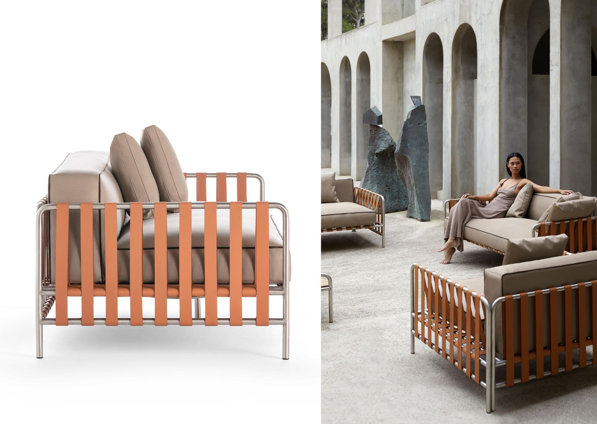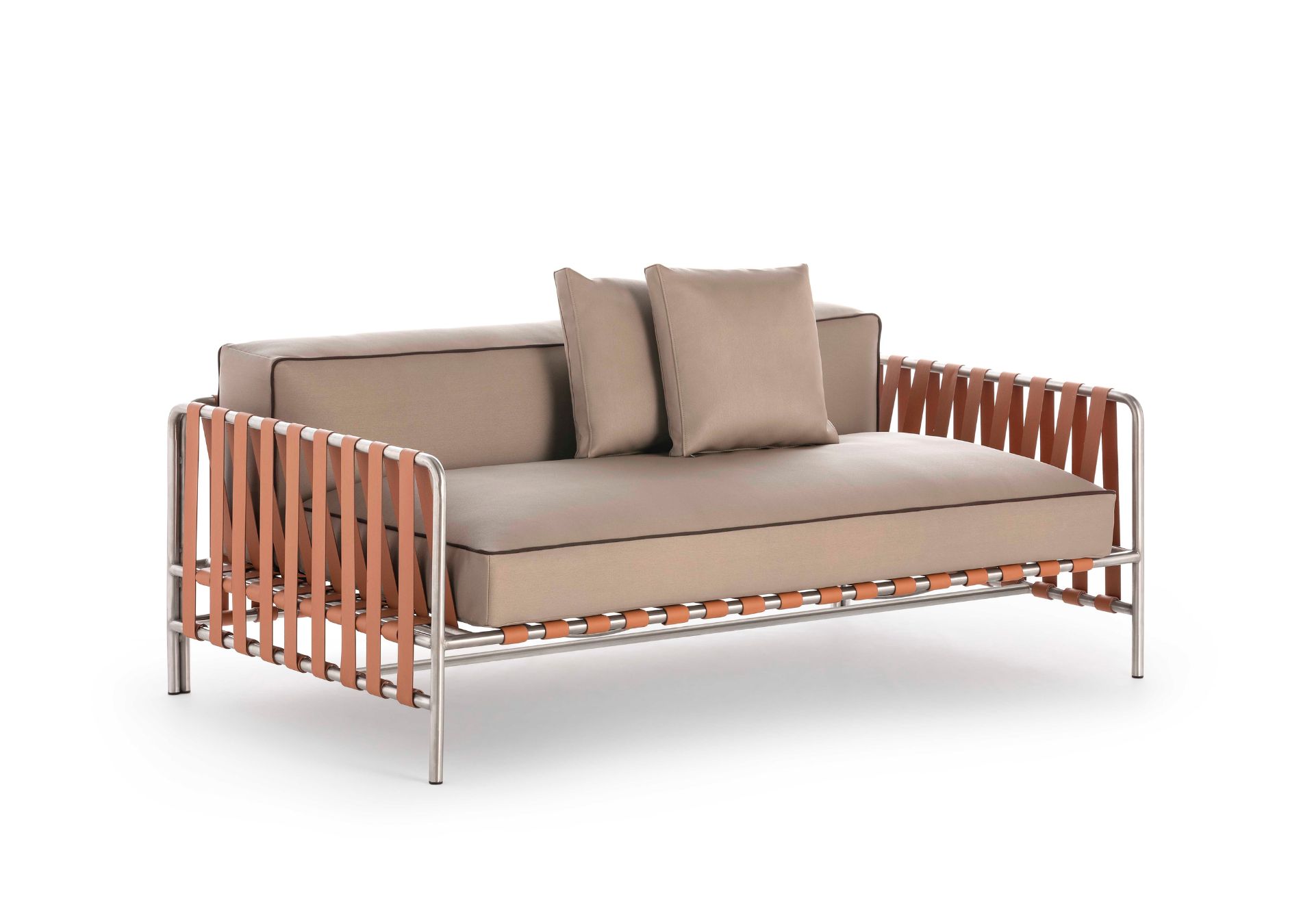 The ONSEN 2 seat sofa is one of the most representative pieces in the collection. This designer sofa has a satin stainless steel tubular structure with no artificial surface treatment and leather-effect vinyl straps on the back, arms, and seat. Your comfort is guaranteed thanks to the Triafill micro-fiber of its cushions. These also feature removable covers and are decorated with a unique piping detail that characterizes the collection.
