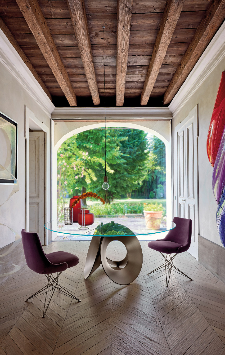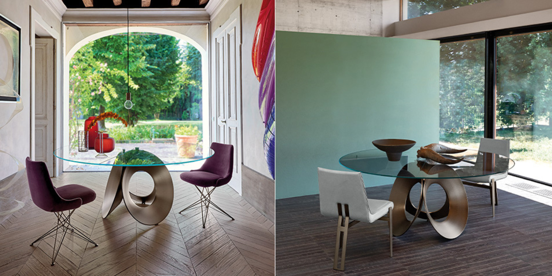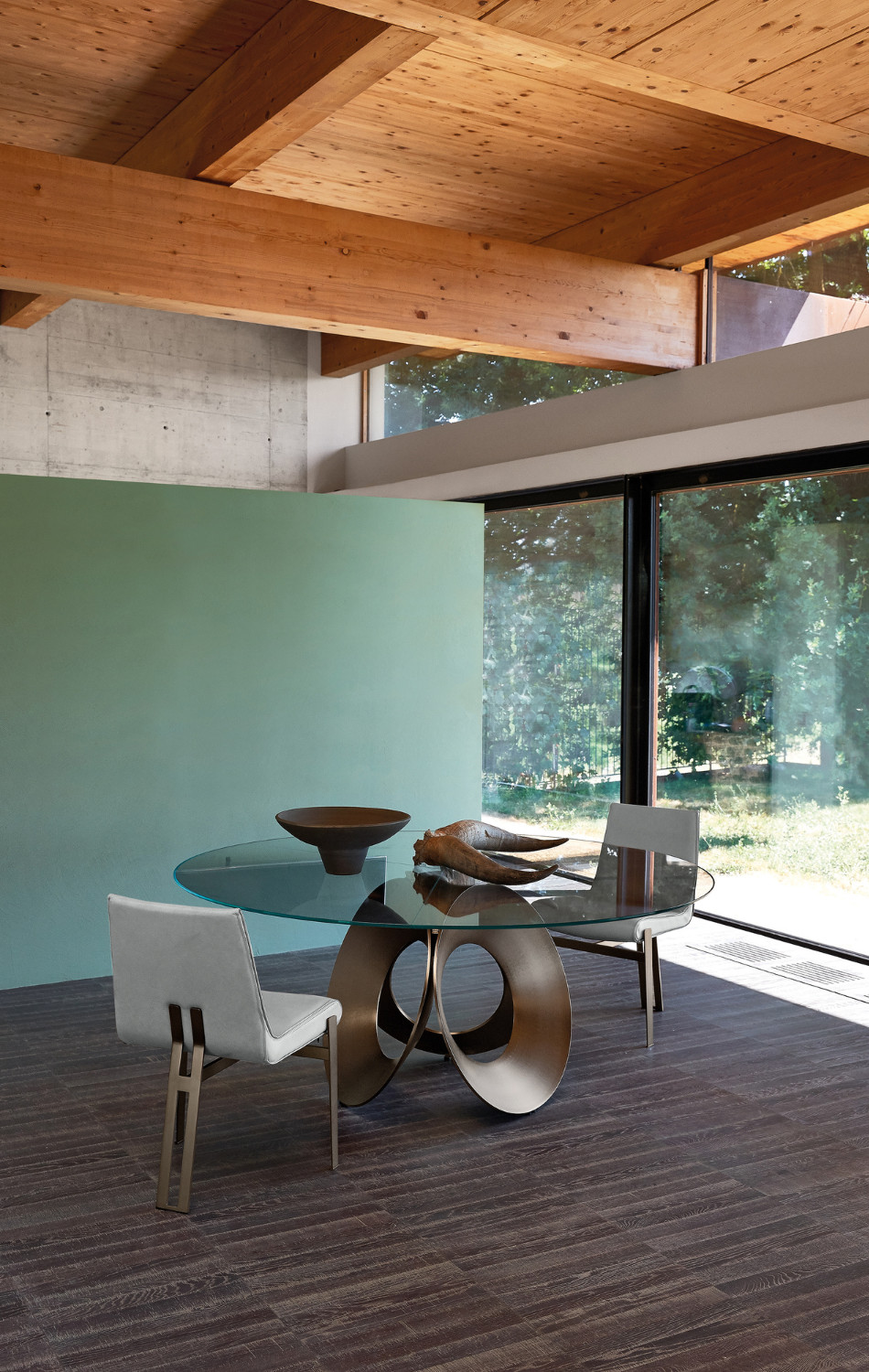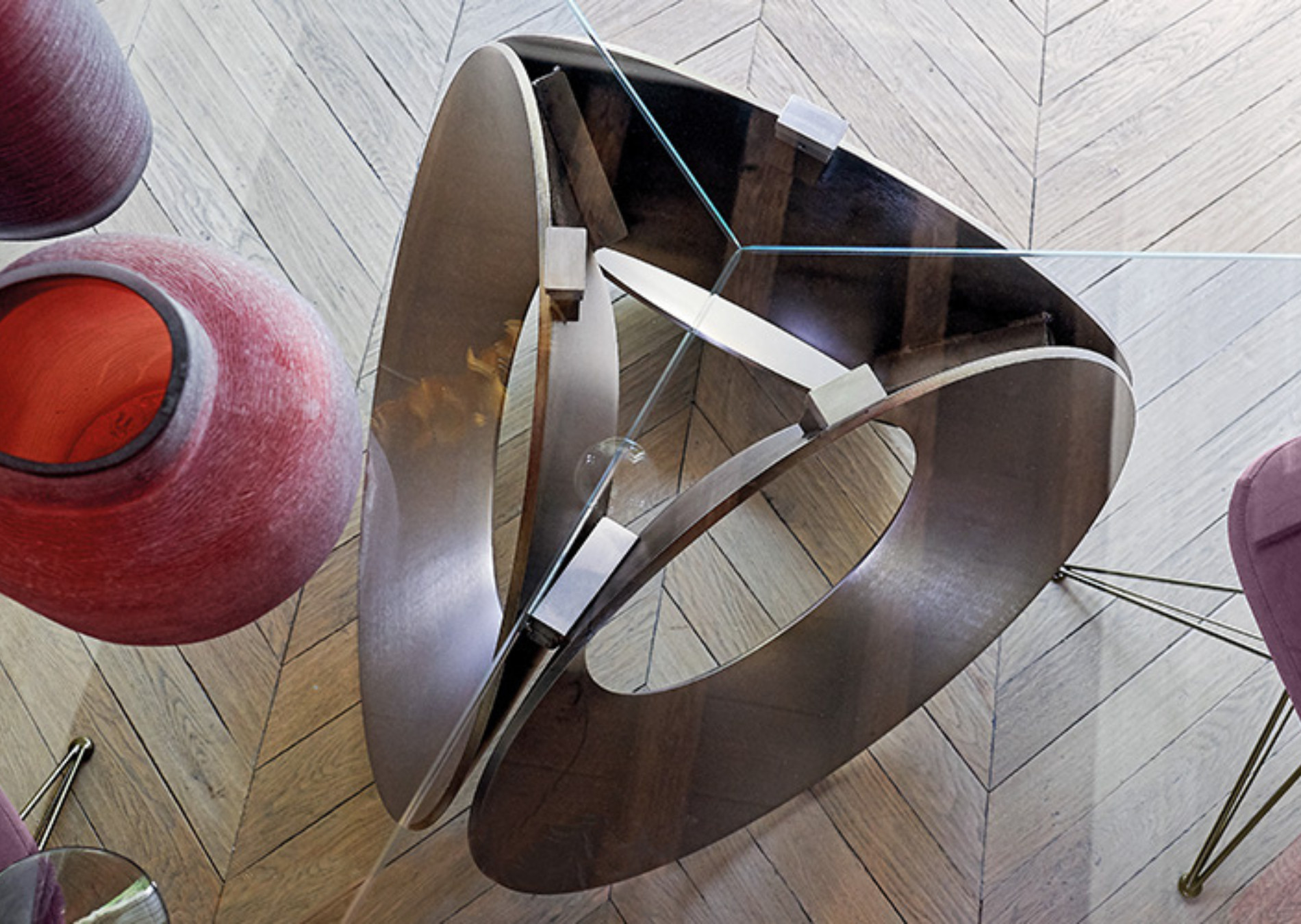 The base is a complex piece of manufacturing, three metallic circles that meet at different angles proving that elegance can be art and that luxury can push boundaries; it is interior engineering that looks as stunning as it is thoughtful. Whilst the base is available in micaceous brown, brass, titanium and oxy grey, the top is cut to a circular shape or oval and it is available in moka oak or sucupira and Emperador marble or Niveo White marble with the rotating tray Lazy Susan, which is perfectly integrated in the table.