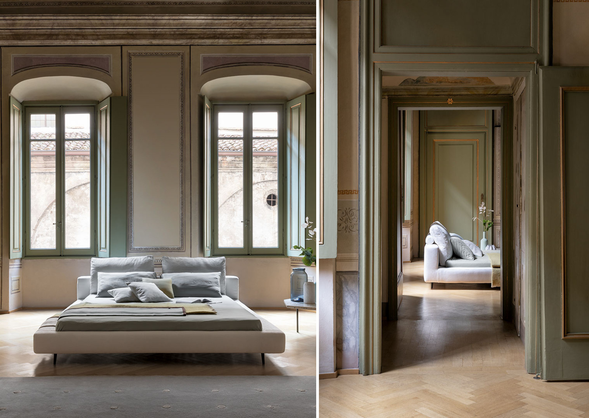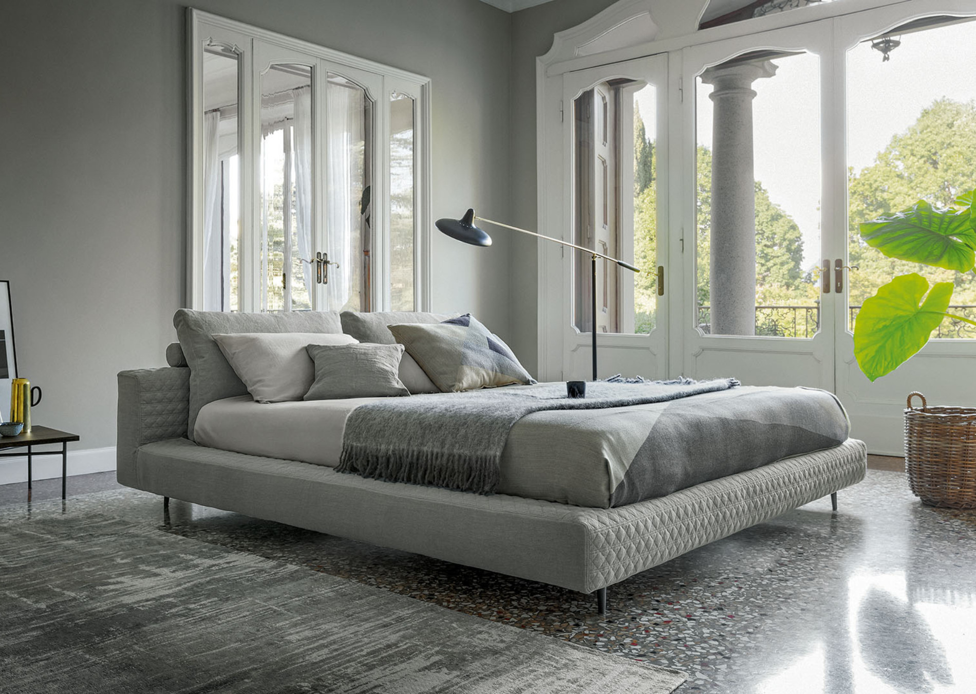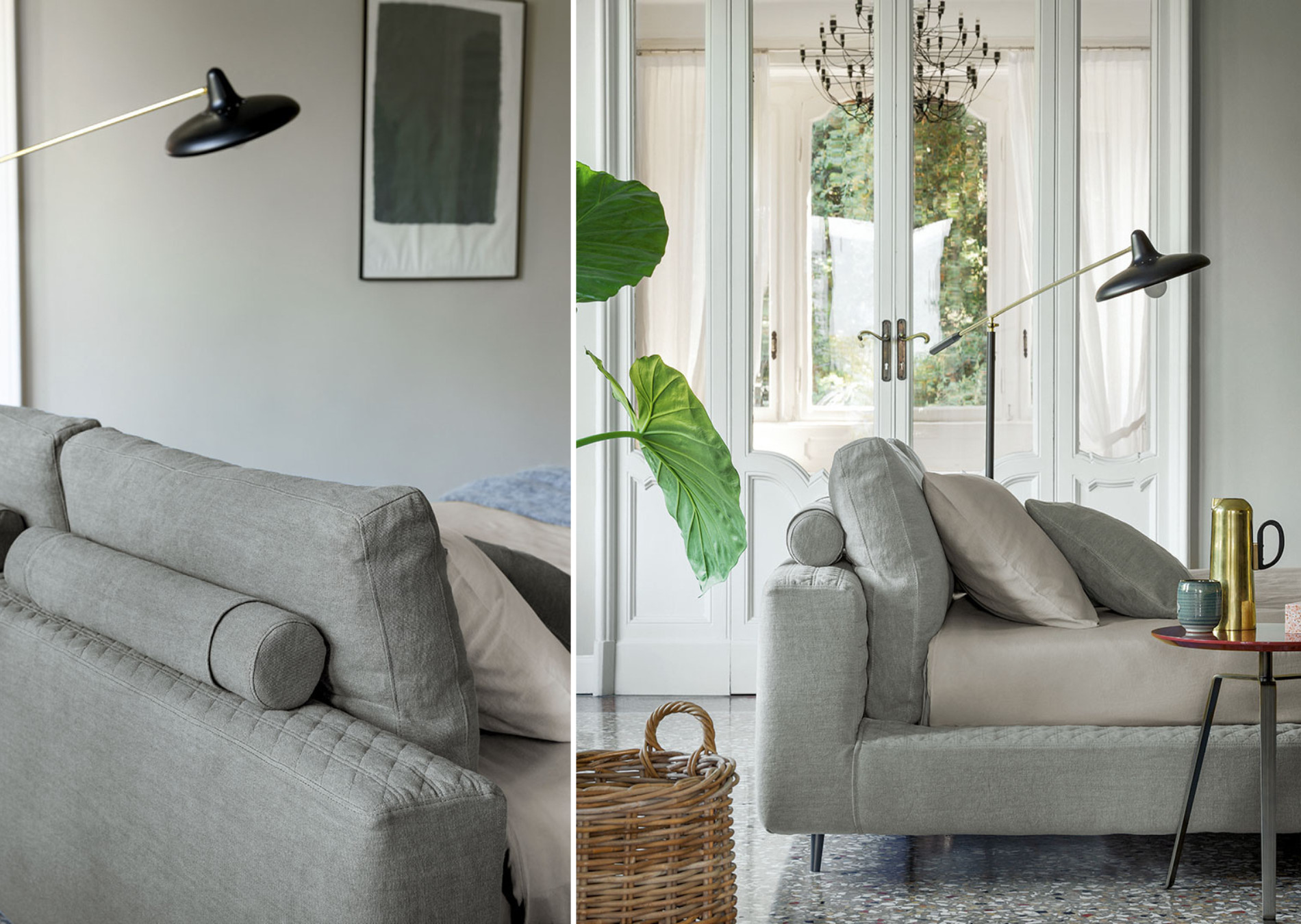 Owen is a modern design bed with strict, clean and timeless lines that can be included in any context without disrupting its essential character. Arranged in an orderly way in an impeccable visual balance, the abundant volumes of the headboard, made up of two large cushions supported by a padded bolster, enhance the sober and essential lines of the bed frame. The removable cover is made of fabric, leather or eco-leather while the feet are in painted metal, available in different colours. In the embroidered version (Owen ego), the cover is made of fabric; part of the bed frame is also embellished with embroidery that, in contrast with the simplicity of the cushions that form the headboard, add a sense of dynamism to the whole.