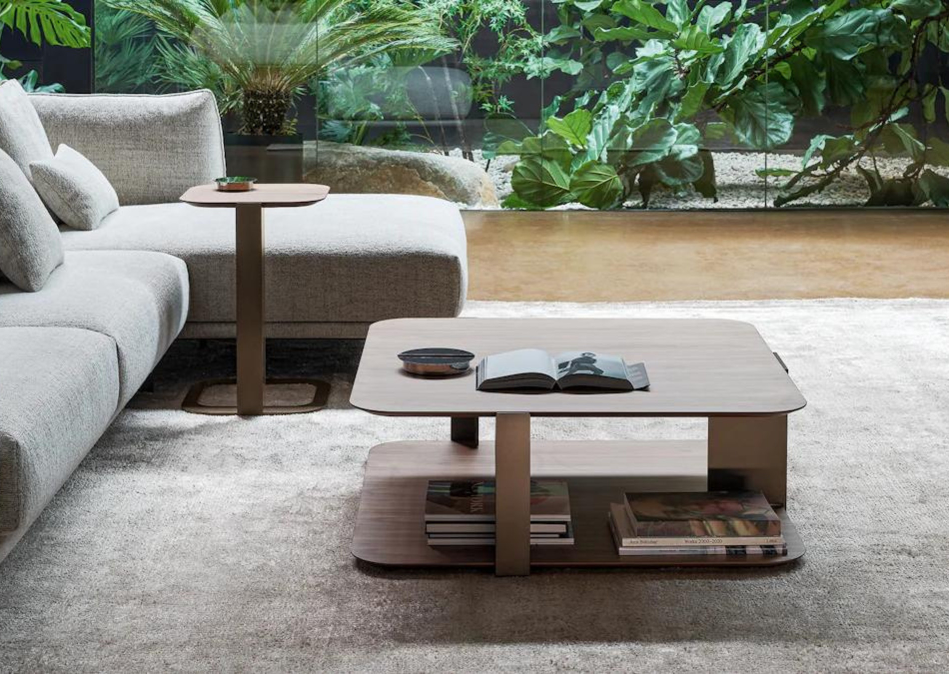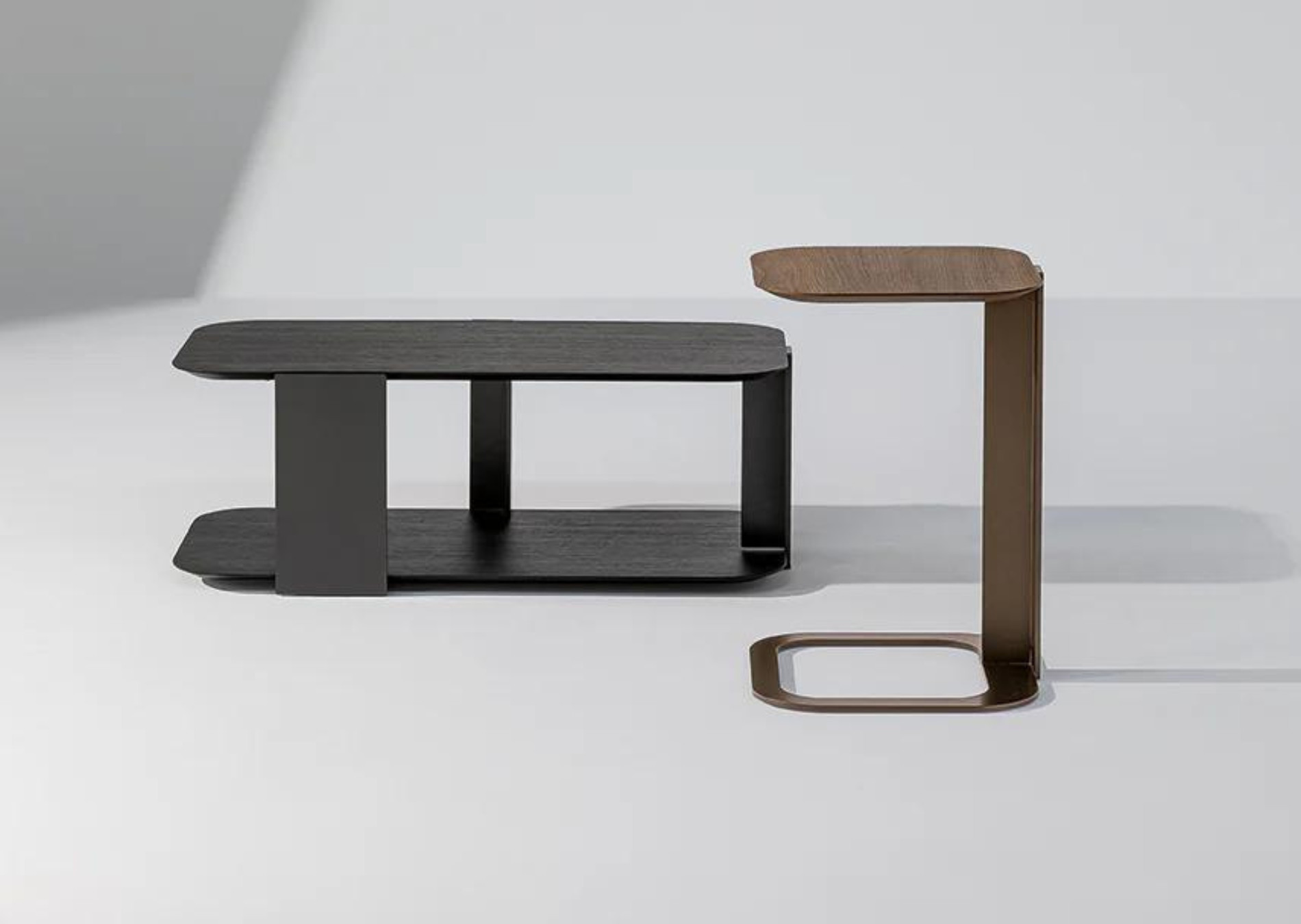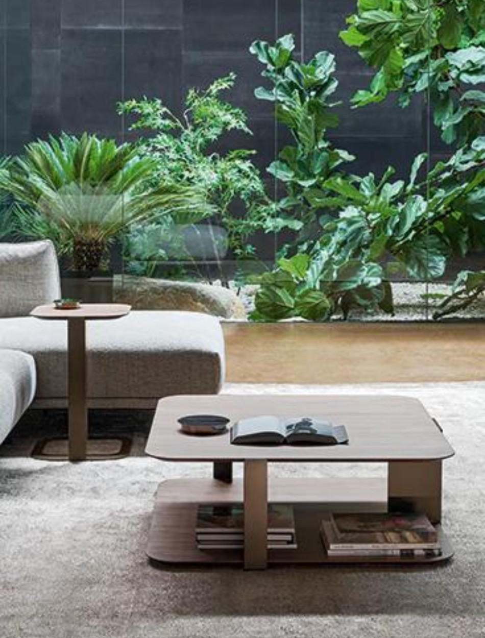 With shapes inspired by the typical sports paddle to which it is an explicit tribute, Paddle is a collection of tables by Mauro Lipparini with a light and linear design. Available with two table tops (in Canaletto walnut or coal oak), the coffee tables are completed by a load-bearing structure in bronze or lead painted metal. The modern wooden coffee tables are distinguished by the clear-cut shapes of the tops and profiles and softened by the rounded edges. Arranged individually or in combination with other elements, they offer ample possibilities for insertion in the most disparate domestic and hospitality spaces.