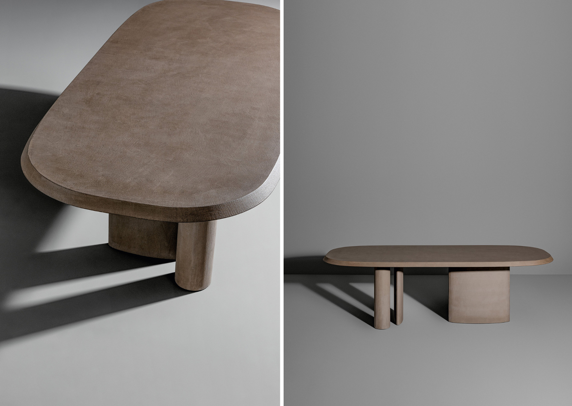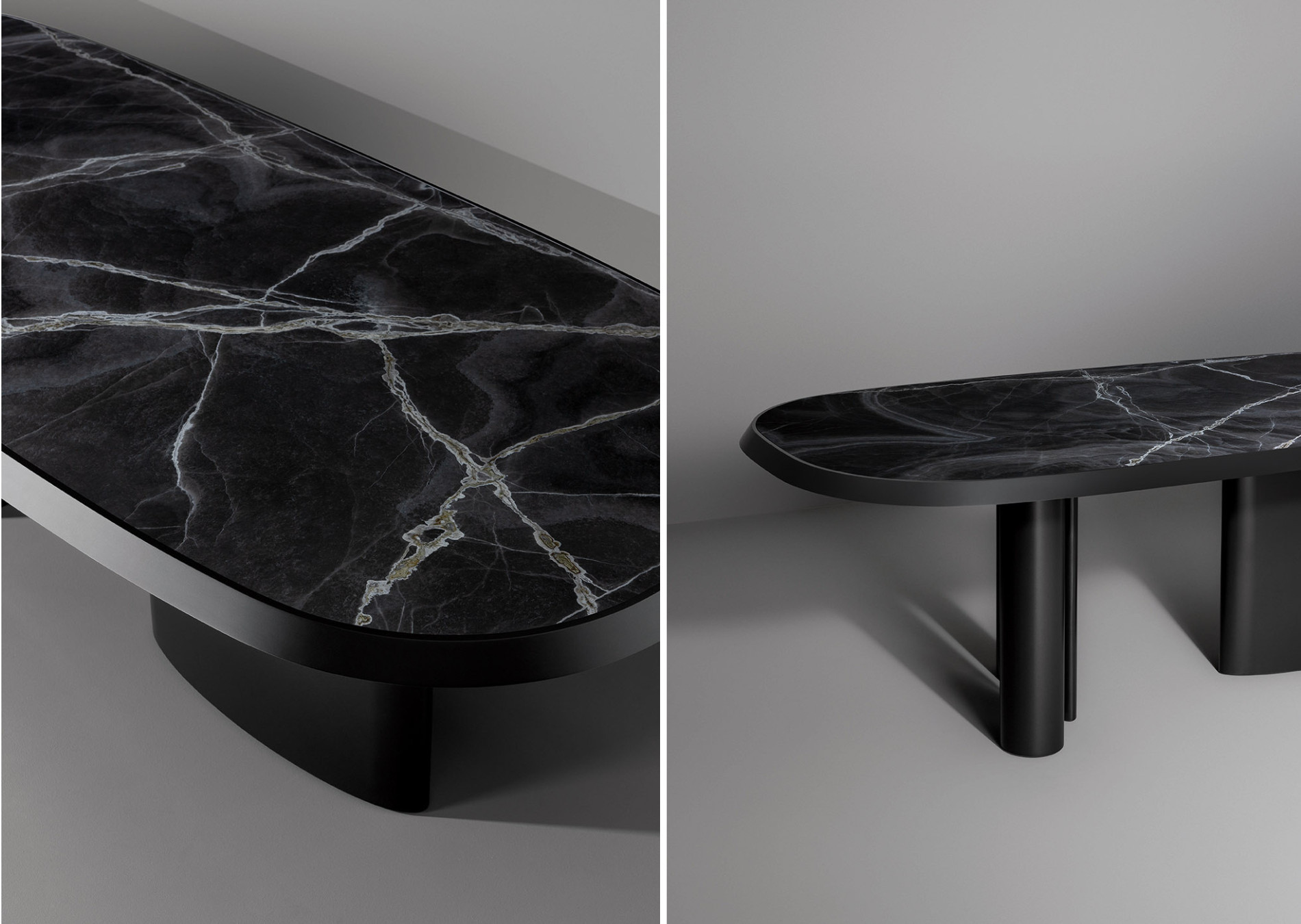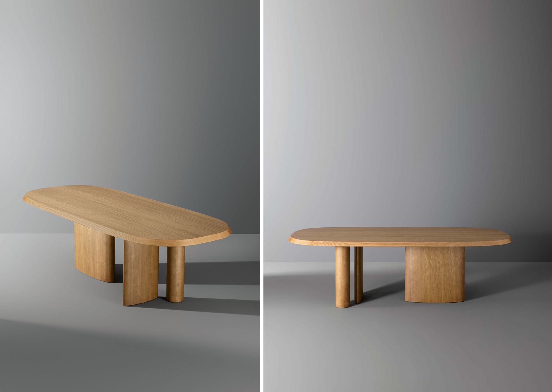 The Padiglioni table by Alain Gilles draws its inspiration from the iconic Barcelona pavilion designed by Mies van der Rohe. The focal point of this table is the base which is made up of three asymmetrical elements, each with a particular shape and placed in an apparently random position in order to make the composition visually dynamic. It is precisely because of the asymmetrical character of the base that anyone who looks at it closely will notice, as they move around the table, that it changes its appearance depending on the angle from which it is observed. The base is thus a significant part of the table, and accentuated by the top whose linear form with its tapered edge contrasts with the legs and completes the overall image. A story of skilfully achieved balances and contrasts that interact with each other, the Padiglioni asymmetrical dining table is the maximum expression both of Alain Gilles’ creative ability and Bonaldo’s production capability.