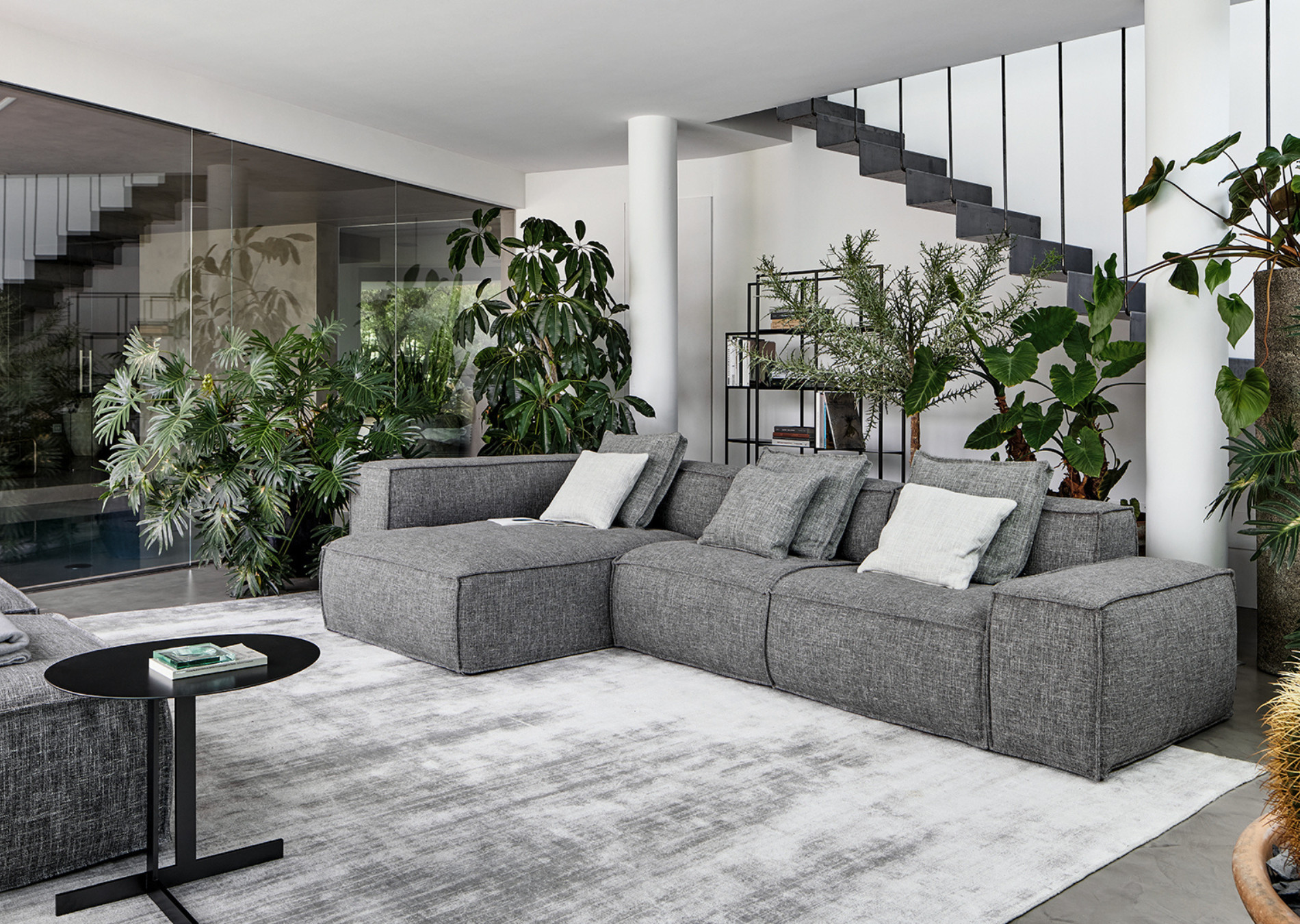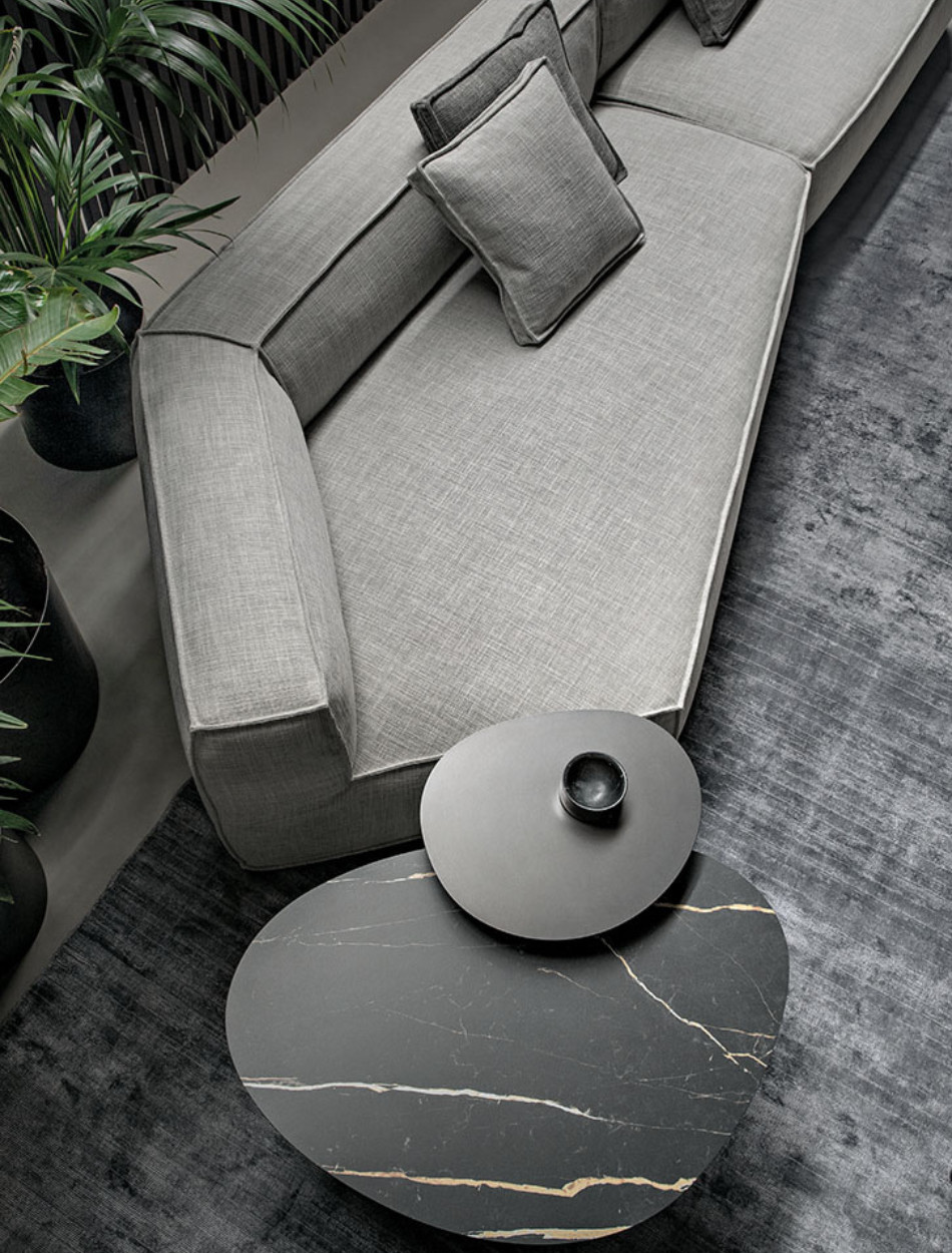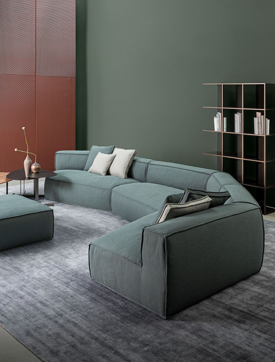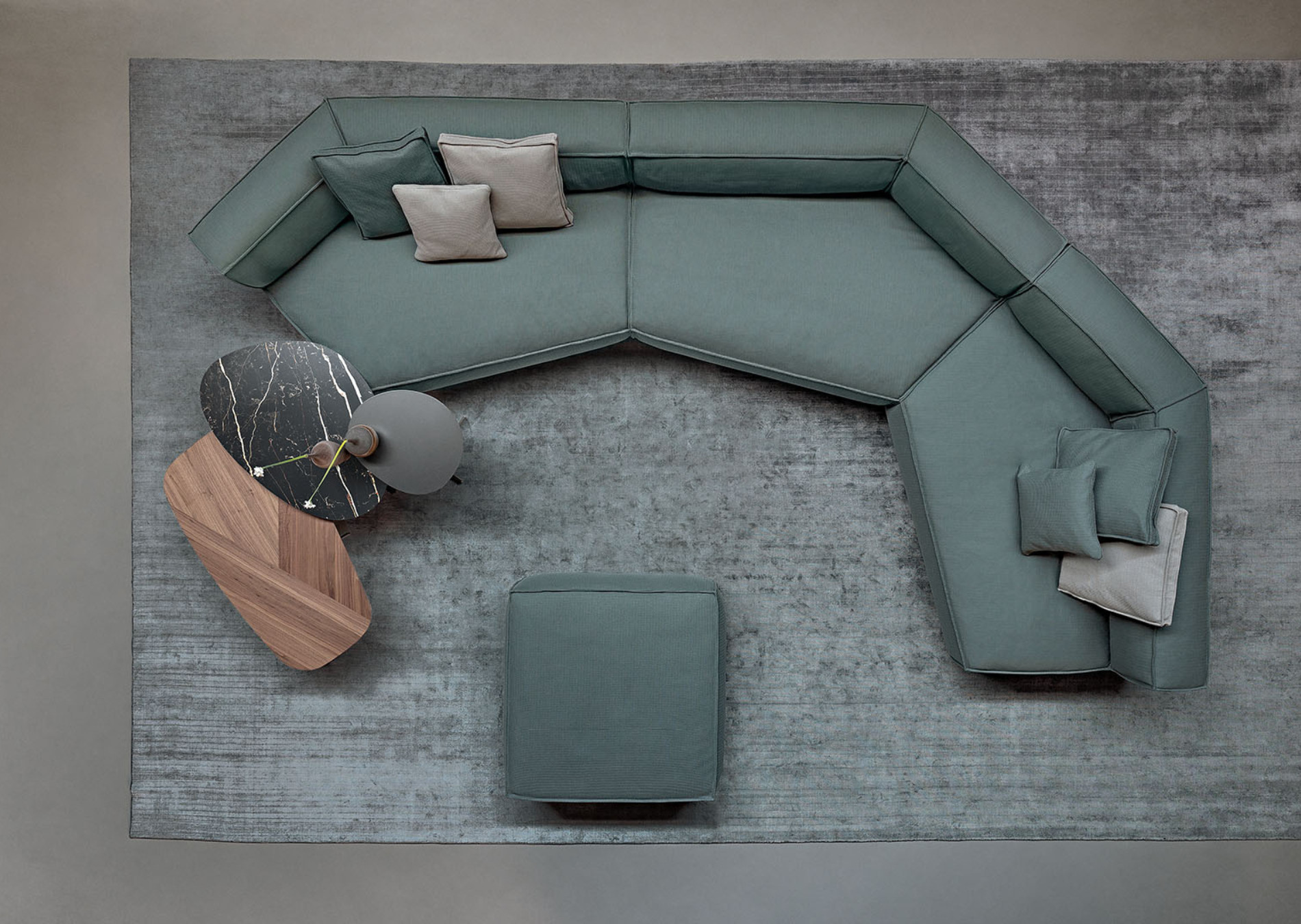 Great expressive value for a piece of furniture destined to stimulate our most creative and fanciful side; an enveloping softness which confers intense moments of relaxation day after day. Thanks to the many elements from which it is possible to choose, the Peanut B. design sofa for living rooms is an extremely versatile sofa which adapts to every style or space requirement. Peanut B. can also be arranged like an island and be placed at the centre of the room to create a space in which to socialise. There are also some elements available with a mechanism that allows the seat to be extended, for even more comfort. The removable upholstery is in fabric or leather, and can be chosen in a solid colour or with different colours and patterns for every module that composes the sofa, in this way offering a further opportunity of personalisation. The Peanut B. family of upholstered furniture has been expanded to include new elements that stimulate the creative and imaginative side of those who enjoy them. Thanks to new elements with asymmetrical, pentagonal and trapezoidal shapes, available in various dimensions and combinations with existing regular elements, Peanut B.X. becomes extremely versatile and customisable: an island of softness, a symbol of relaxation, the standout feature of the living area thanks to its unique personality. “Two-sided” design remains the distinctive element of the sofa’s architecture, which is perfectly expressed by the inclusion of the new armrests and poufs. The contours of the stitching, which surround the soft volumes of the seats, contrast with the more austere and geometric shapes of the frame with different seat depths: the result is a sofa that can adapt to any space and style requirement.