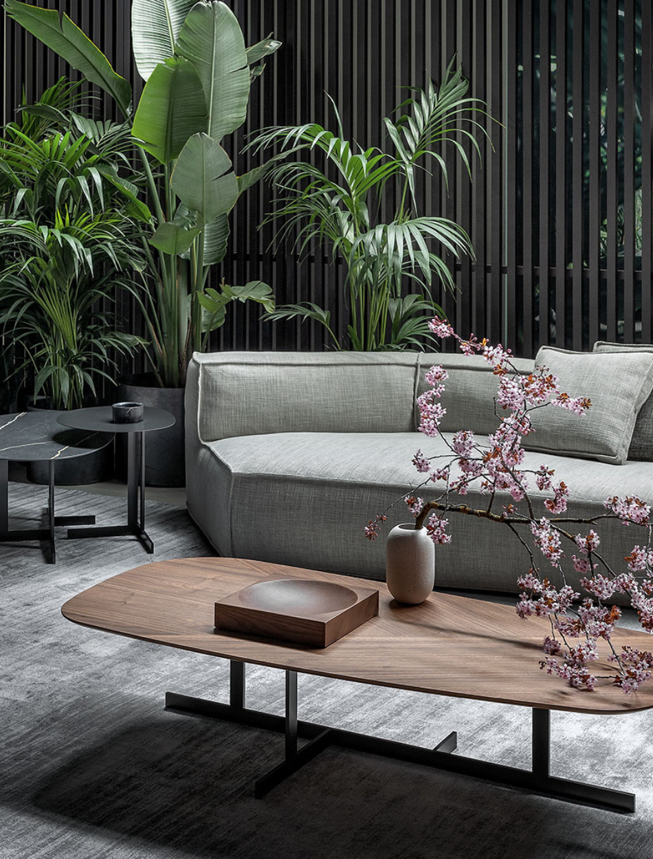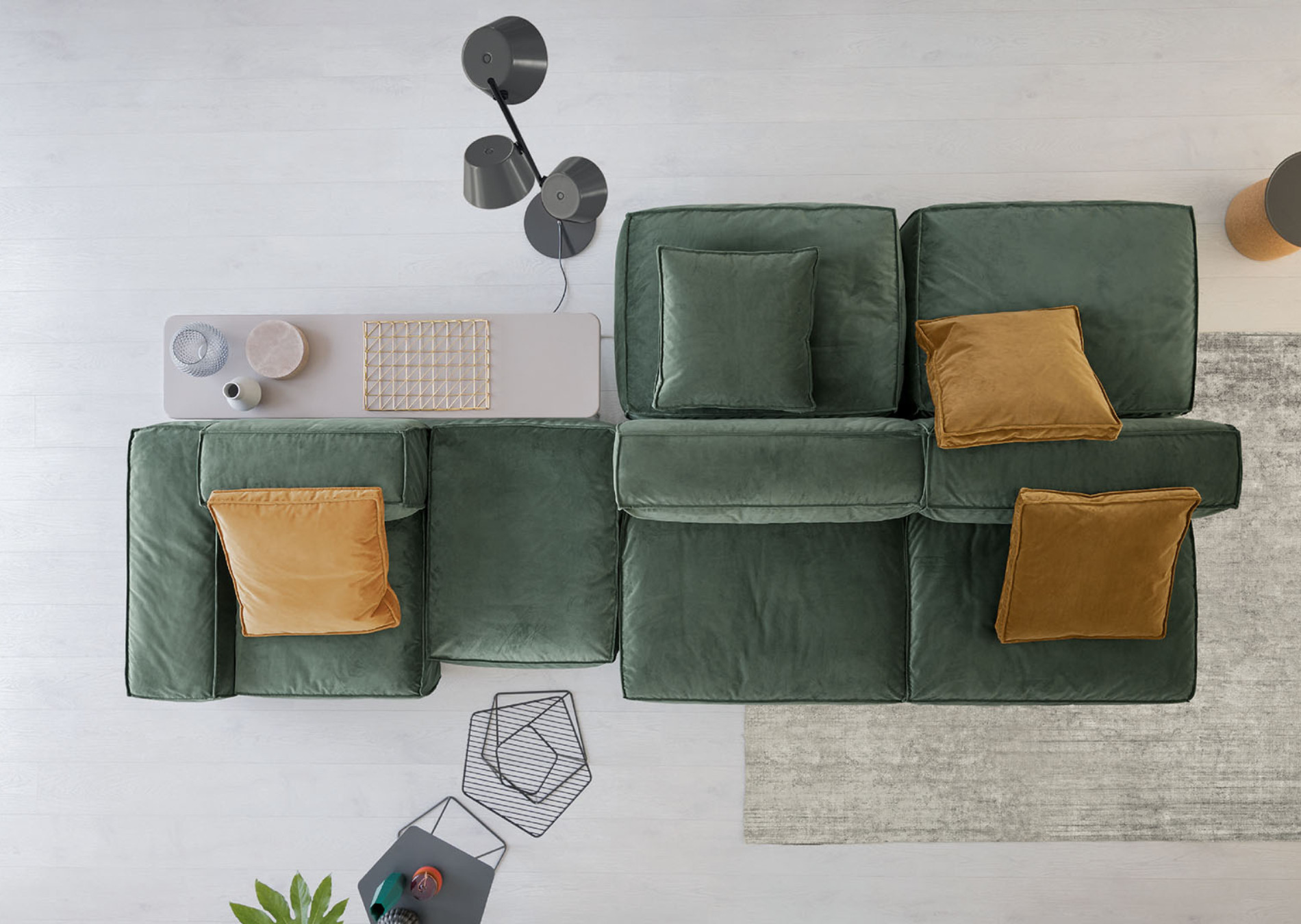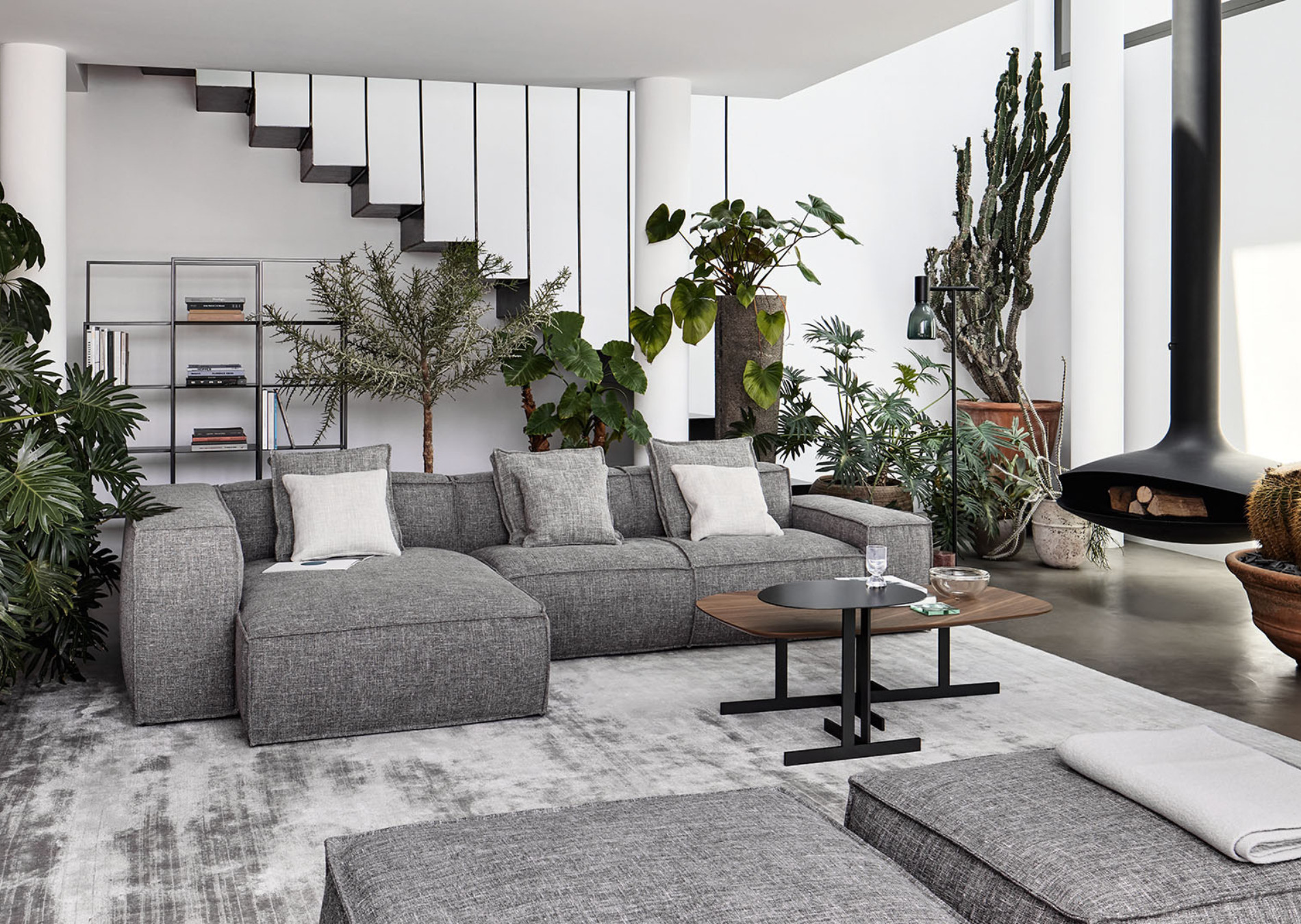 Great expressive value for a piece of furniture destined to stimulate our most creative and fanciful side; an enveloping softness which confers intense moments of relaxation day after day. Thanks to the many elements from which it is possible to choose, the Peanut B. design sofa for living rooms is an extremely versatile sofa which adapts to every style or space requirement. Peanut B. can also be arranged like an island and be placed at the centre of the room to create a space in which to socialise. There are also some elements available with a mechanism that allows the seat to be extended, for even more comfort. The removable upholstery is in fabric or leather, and can be chosen in a solid colour or with different colours and patterns for every module that composes the sofa, in this way offering a further opportunity of personalisation. The Peanut B. family of upholstered furniture has been expanded to include new elements that stimulate the creative and imaginative side of those who enjoy them. Thanks to new elements with asymmetrical, pentagonal and trapezoidal shapes, available in various dimensions and combinations with existing regular elements, Peanut B.X. becomes extremely versatile and customisable: an island of softness, a symbol of relaxation, the standout feature of the living area thanks to its unique personality. “Two-sided” design remains the distinctive element of the sofa’s architecture, which is perfectly expressed by the inclusion of the new armrests and poufs. The contours of the stitching, which surround the soft volumes of the seats, contrast with the more austere and geometric shapes of the frame with different seat depths: the result is a sofa that can adapt to any space and style requirement.