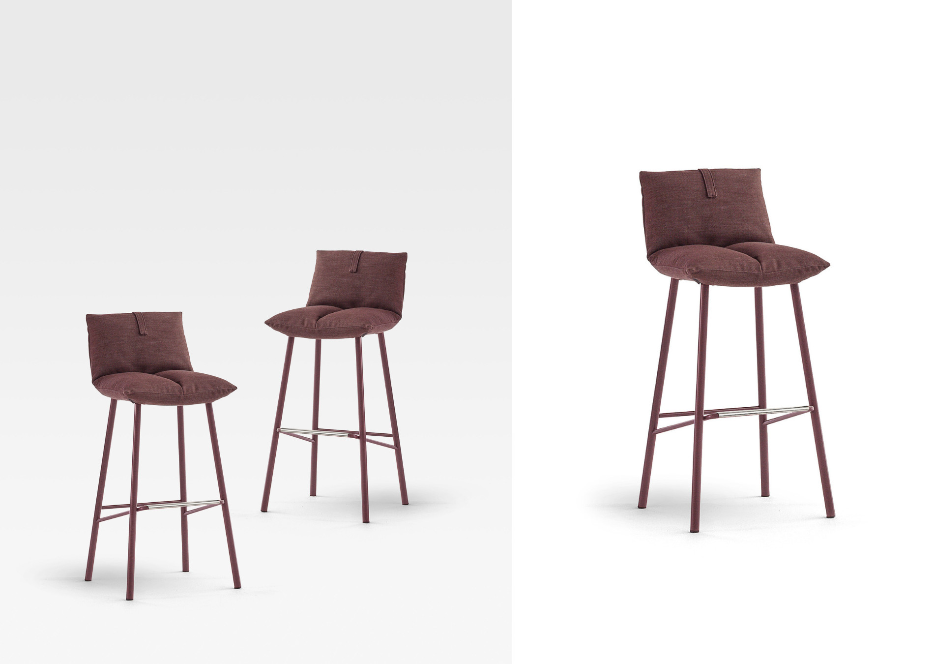 In Pil too, softness is evident even before you sit on it. Inspired by the object that is itself the symbol of softness, the pillow, and usually interpreted as an accessory, here the pillow plays the starring role, shaped and adapted to create a chair that conveys comfort and relaxation. The main components of the Pil too design stool are the backrest cushion and the seat cushion. The latter features a fold in the middle, created to generate an enveloping effect that physically and visually emphasises the feeling of softness. The base consists of metal legs, with the crossbars set at a special angle, to create an original graphic interweaving effect. In addition to the bar stool, other chairs complete the collection: Pil, (chair), Pil up (chair with higher backrest), Miss Pil (chair with armrests), Miss Pil up (chair with higher backrest and armrests), the Pil armchair and the Pil Armchair hi.